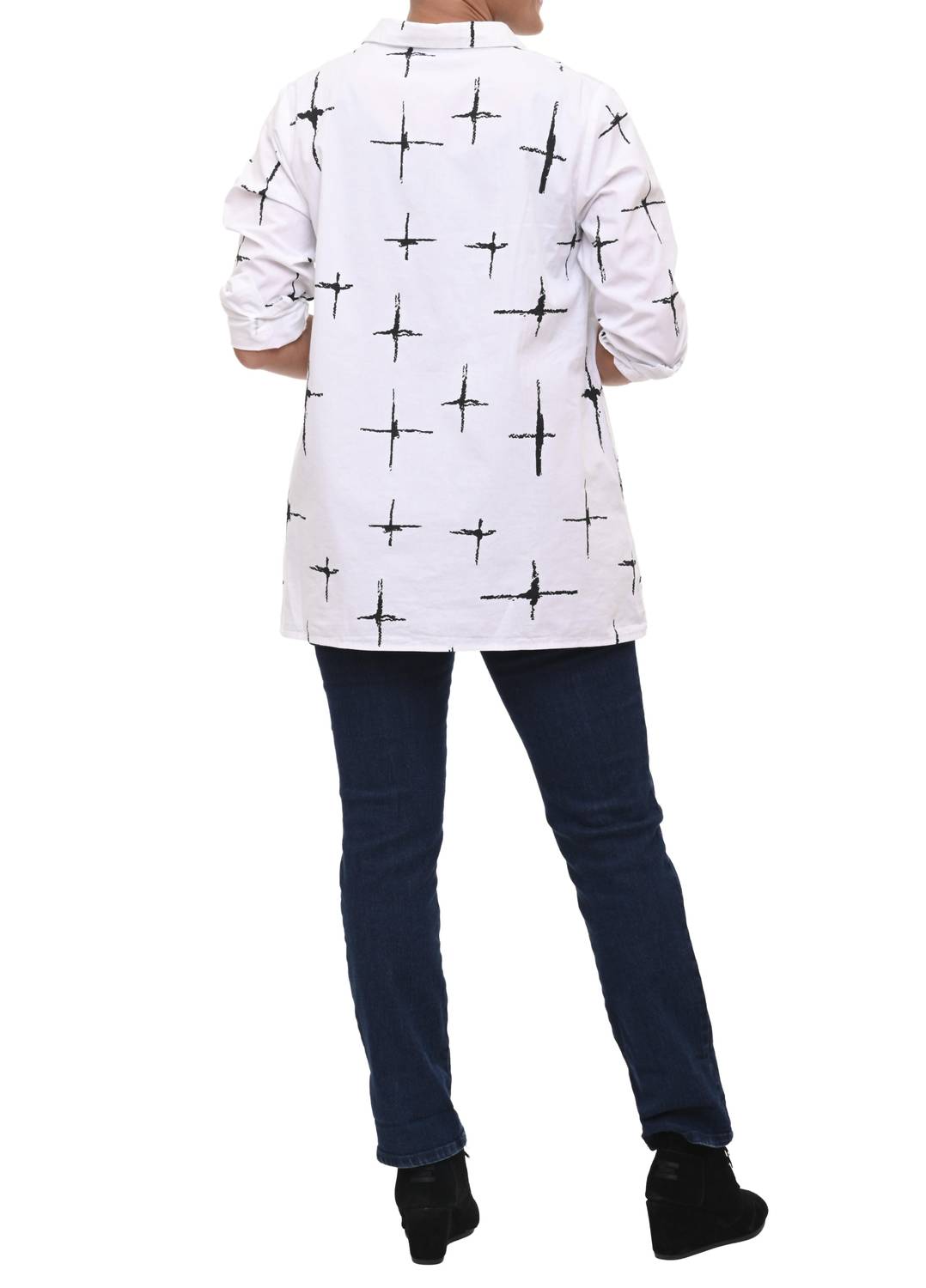 Pair this with your favorite jeans and slides for your next girls night out. Introducing the Blythe Button Down Blouse by Tulip Clothing, a modern staple with a bold black abstract cross print that enhances its classic look. This piece, crafted from 100% crisp cotton, features elbow-length sleeves and a sharp button-up front for a relaxed yet stylish fit. With center lengths varying from XS to XXL, from 30" to 32 1/2", it assures a comfortable fit for every size. Care is easy; just machine wash and line dry for enduring style.