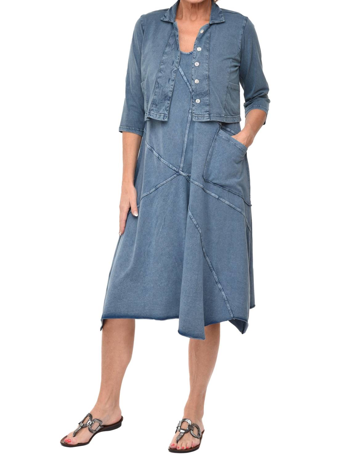 The perfect length dress does exist. The Garrison Sleeveless Dress by Tulip Clothing is crafted from denim lycra in a solid pattern, making it an ideal choice for a trendy summer look. With a composition of 95% cotton and 5% spandex, this A-line midi dress features a decorative neckline, asymmetrical top-stitch seams, a front patch pocket, and a raw hem for a unique appeal. It measures from 45" to 47" in length across sizes XS to XL, and from 37" to 45" in chest measurements, ensuring a comfortable fit. Designed for ease, it has a pull-on closure and is machine washable with a hang dry finish.