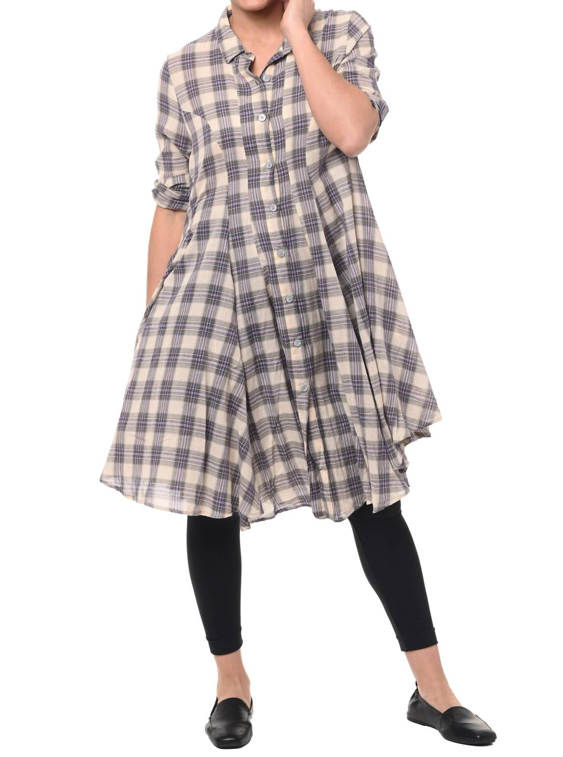 This button down shirt is comfortable yet polished. Discover the Julia Button Down Shirt by Tulip Clothing, a minimalist piece perfect for any wardrobe in Harwich plaid. This long-sleeve, swingy shirt features front and back princess seams, buttoned cuffs, and convenient side seam pockets. Made from 100% cotton, it offers comfort and breathability. Closure: Button closure. Care: Machine wash cold, hang dry. Available in sizes XS to XL with detailed chest and length measurements to ensure a perfect fit.