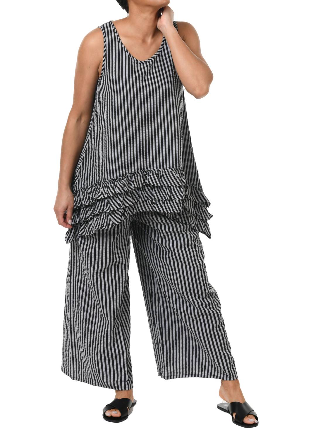 Fit, fabric and functionality. This tank top checks all the boxes. The Lily Tank by Tulip Clothing features a sleeveless design with a scoopneck and is crafted from 100% cotton for breathability. This tank comes in a striking Harrison Seersucker Stripe pattern and offers a relaxed A-line silhouette with a tiered hem finished with ruffle detailing. Designed to fall below the hip, it provides comfortable coverage ideal for minimalist spring styles or vacation wardrobes. Closure: Pull on. Care instructions include machine wash and tumble dry. Available in various sizes, starting from XS (38" Chest, 26.5" Length) to XL (46" Chest, 30.5" Length).