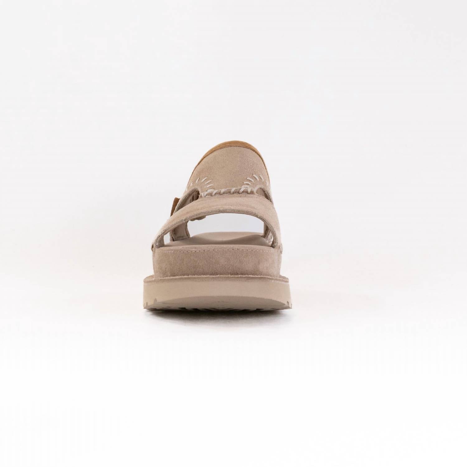This sandal will take you from brunch to dinner and everything in between. Step into summer with style in the UGG Women's Goldenstar Regenerate Sandal, crafted with thoughtfully sourced suede. This open-toe sandal features a secure adjustable heel strap with a hook-and-loop closure and boasts a platform heel for a chic, modern look. It integrates eco-friendly elements such as a contoured EVA footbed and a sugarcane EVA outsole, making it cushioned yet supportive for all-day wear. Perfect for dinner parties or sunny days, this minimalist sandal combines comfort and sustainability, featuring recycled polyester and an anti-odor sockliner treatment.