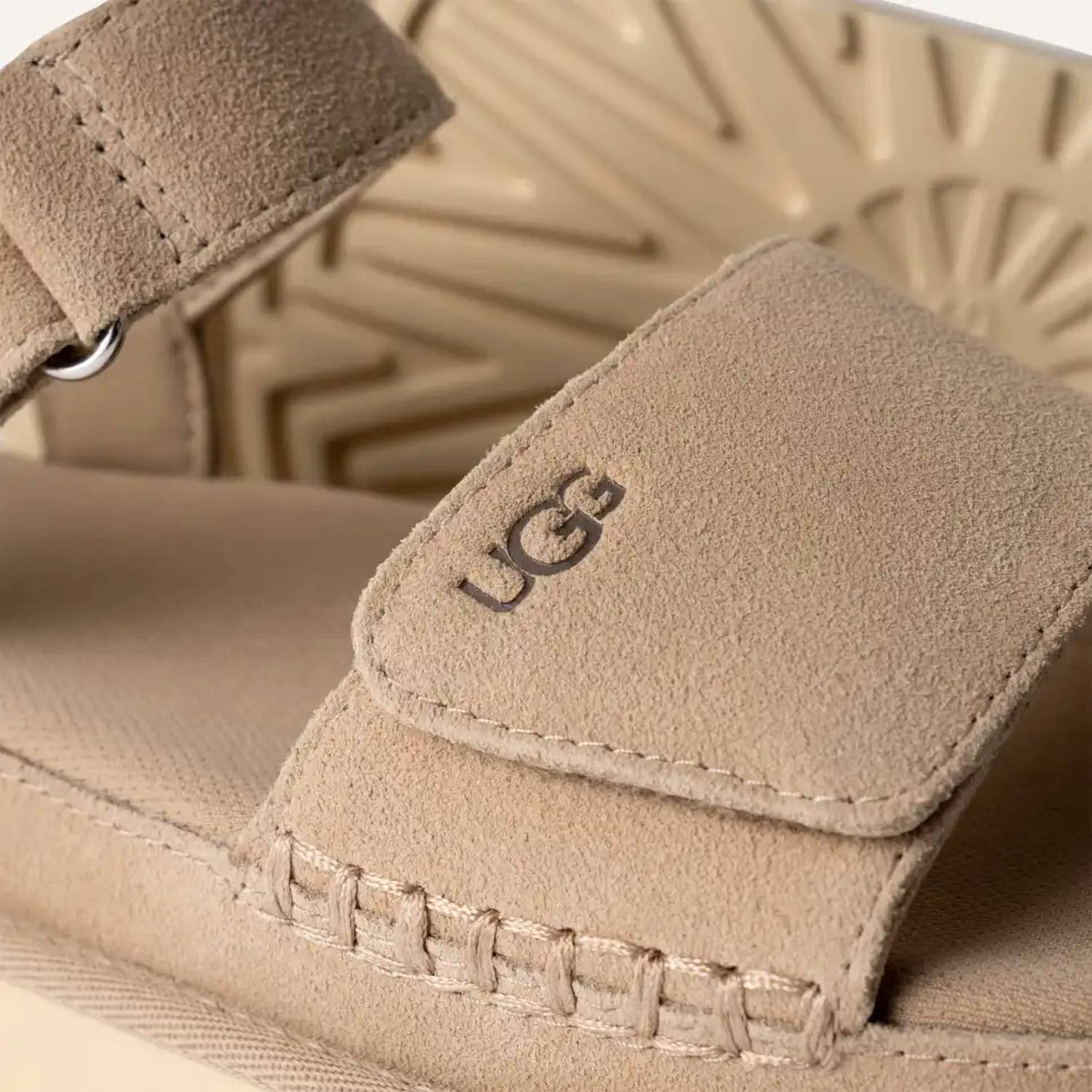 Classicly cute and all-day-wearable. We love this sandal. Step into summer with the UGG Women's Goldenstar Sandals in sand, a boho chic essential perfect for holiday parties. Made from premium suede, these sandals offer an adjustable ankle and vamp strap with a convenient hook-and-loop closure. The lightweight outsole, fashioned from environmentally responsible sugarcane EVA or Treadlite by UGGâ„¢, provides comfort and durability. Designed in a factory supporting women in the workplace, these sandals accentuate an open toe with a platform heel style, making them ideal for your next Thanksgiving gathering.