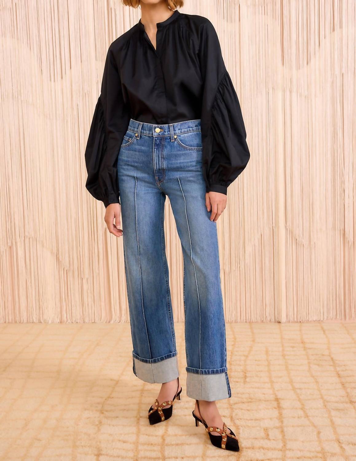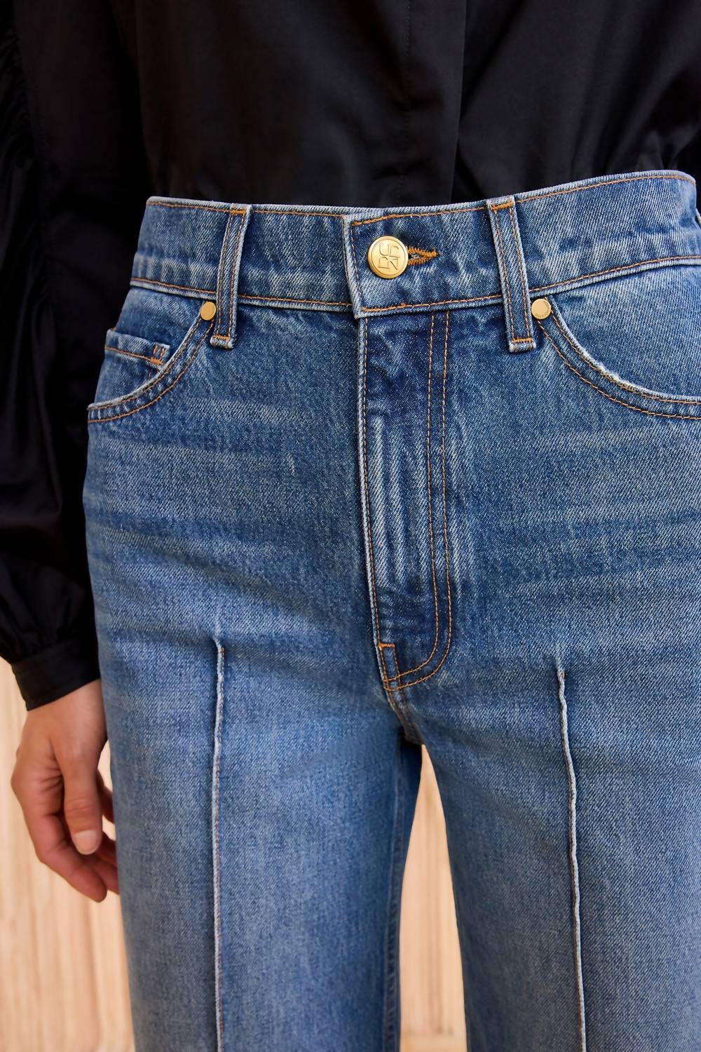 Pair these wide leg jeans with mules, slides or your favorite strappy sandals. Introducing the Ulla Johnson Genevieve Wide Leg Jean in a sophisticated Danube color, perfect for elevating your spring dinner party ensemble. These jeans feature a high-rise waist with a classic, wide-leg fit and are thoughtfully crafted from 100% cotton non-stretch denim. Designed with front button and concealed zip closure, they include a five-pocket construction, signature monogram leather patch, and hand-hammered ring detail. The inseam measures 30" when cuffed, and the jeans are handcrafted in Los Angeles for a polished yet laid-back look.