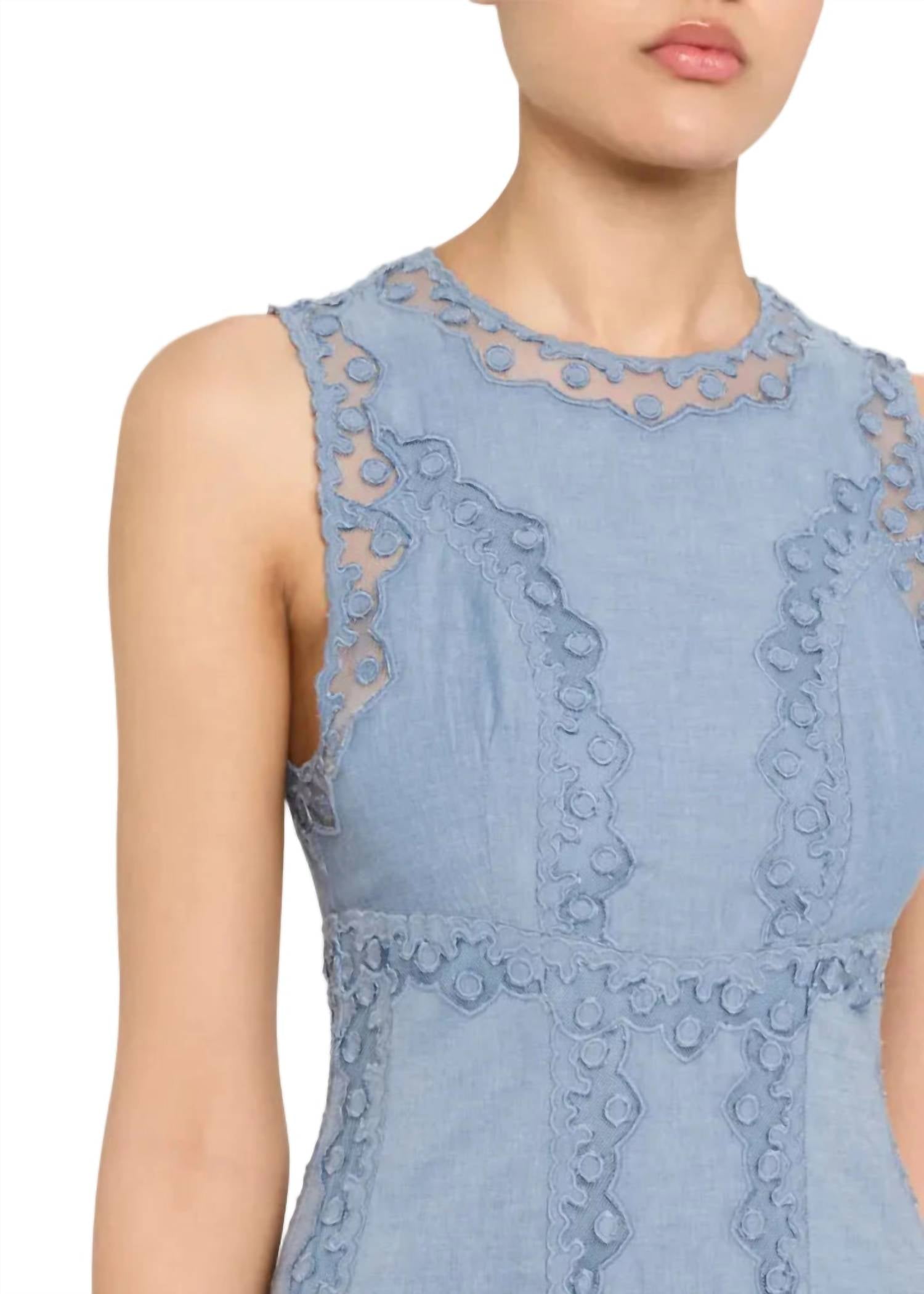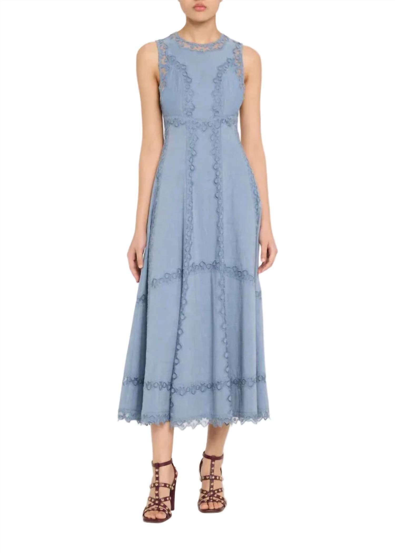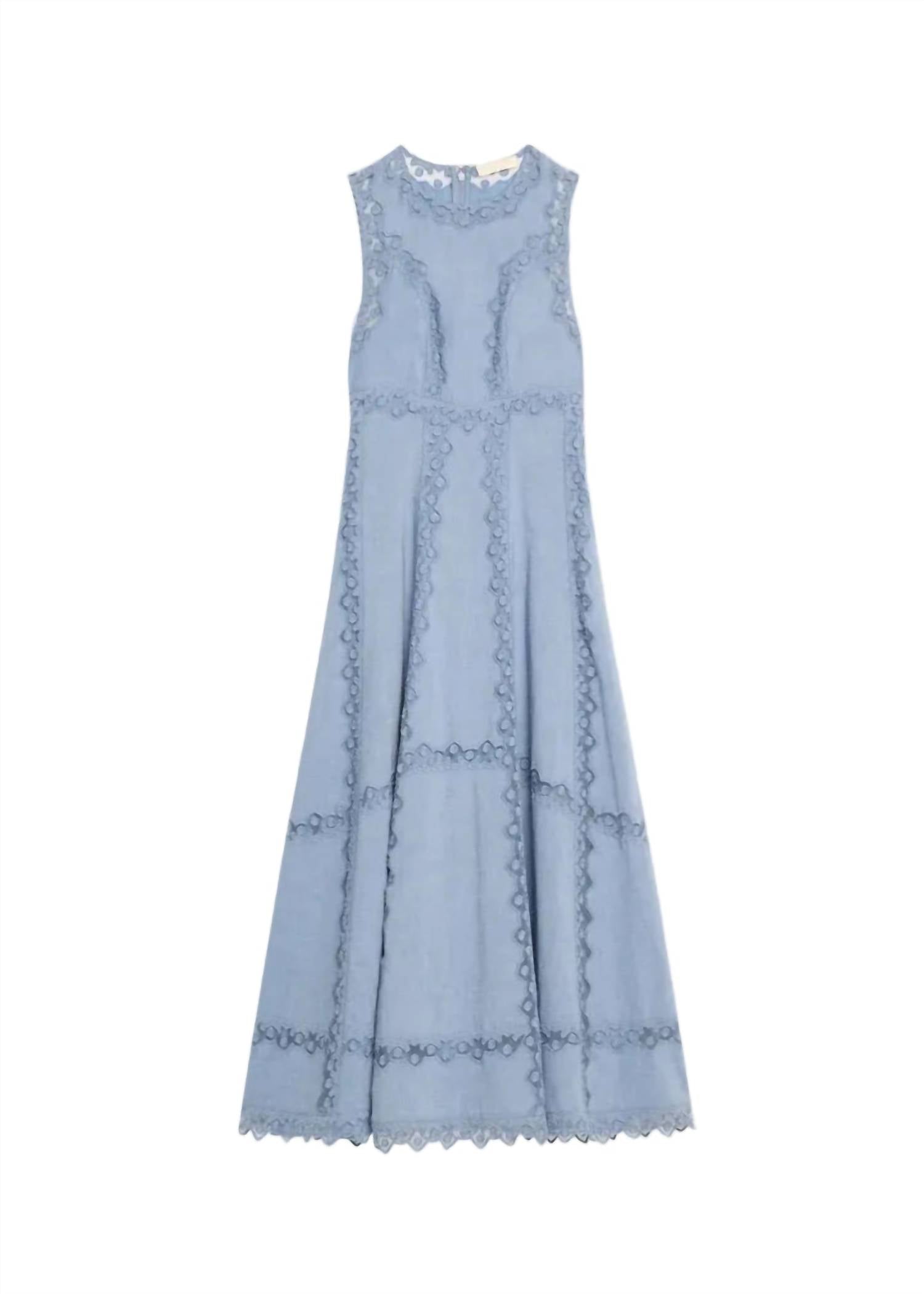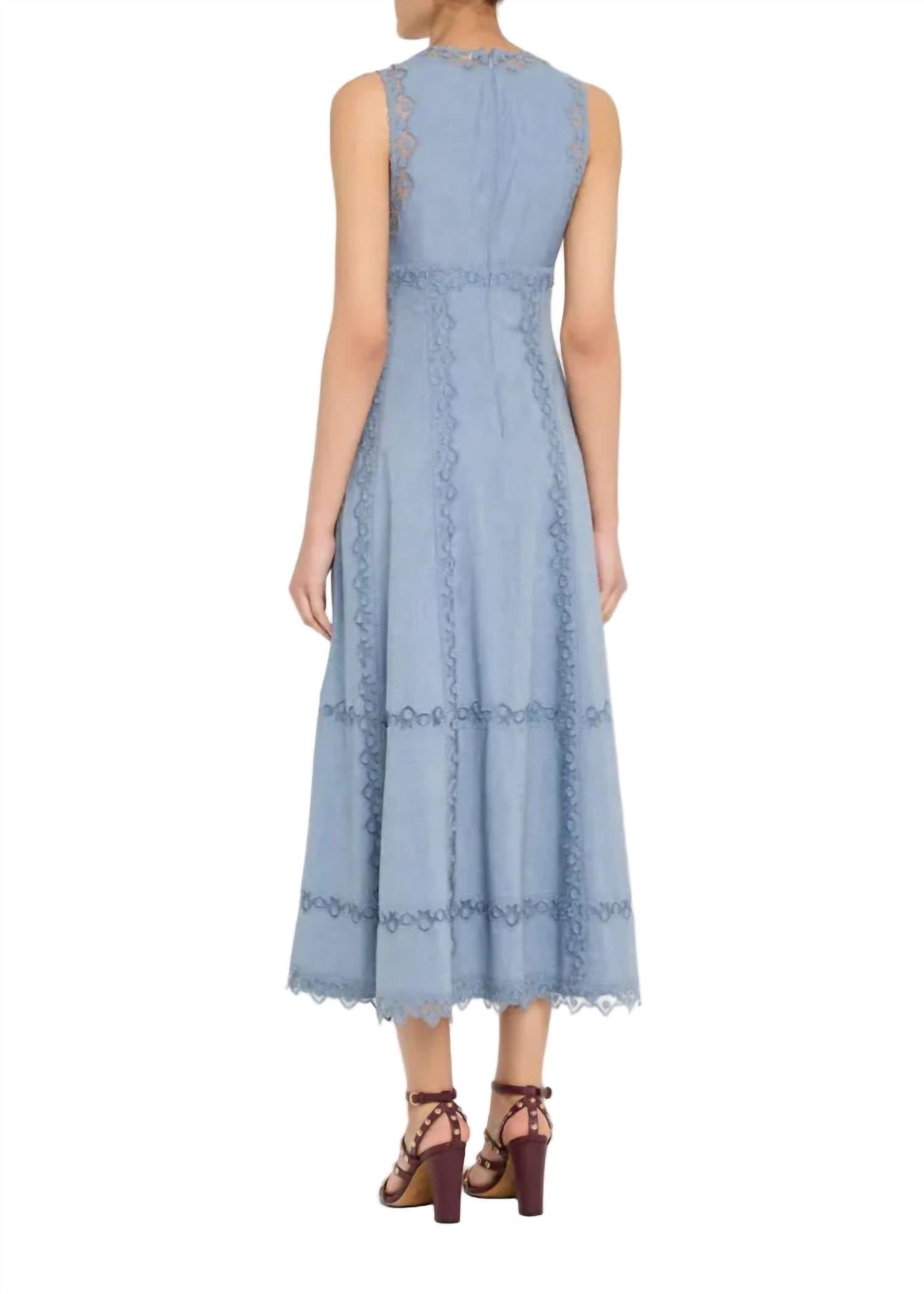 The pefect long sleeve dress for those cooler months. Discover the Anela Midi Dress by Ulla Johnson, a sophisticated evening piece designed for minimalist elegance. Crafted from 100% cotton with a distinct chambray color, this sleeveless dress features a stunning A-line silhouette adorned with tulle appliques and geometric ribbon embroidery. It offers practicality with side pockets and secures with a concealed back zipper. Care for it with machine washing instructions for ease and convenience.