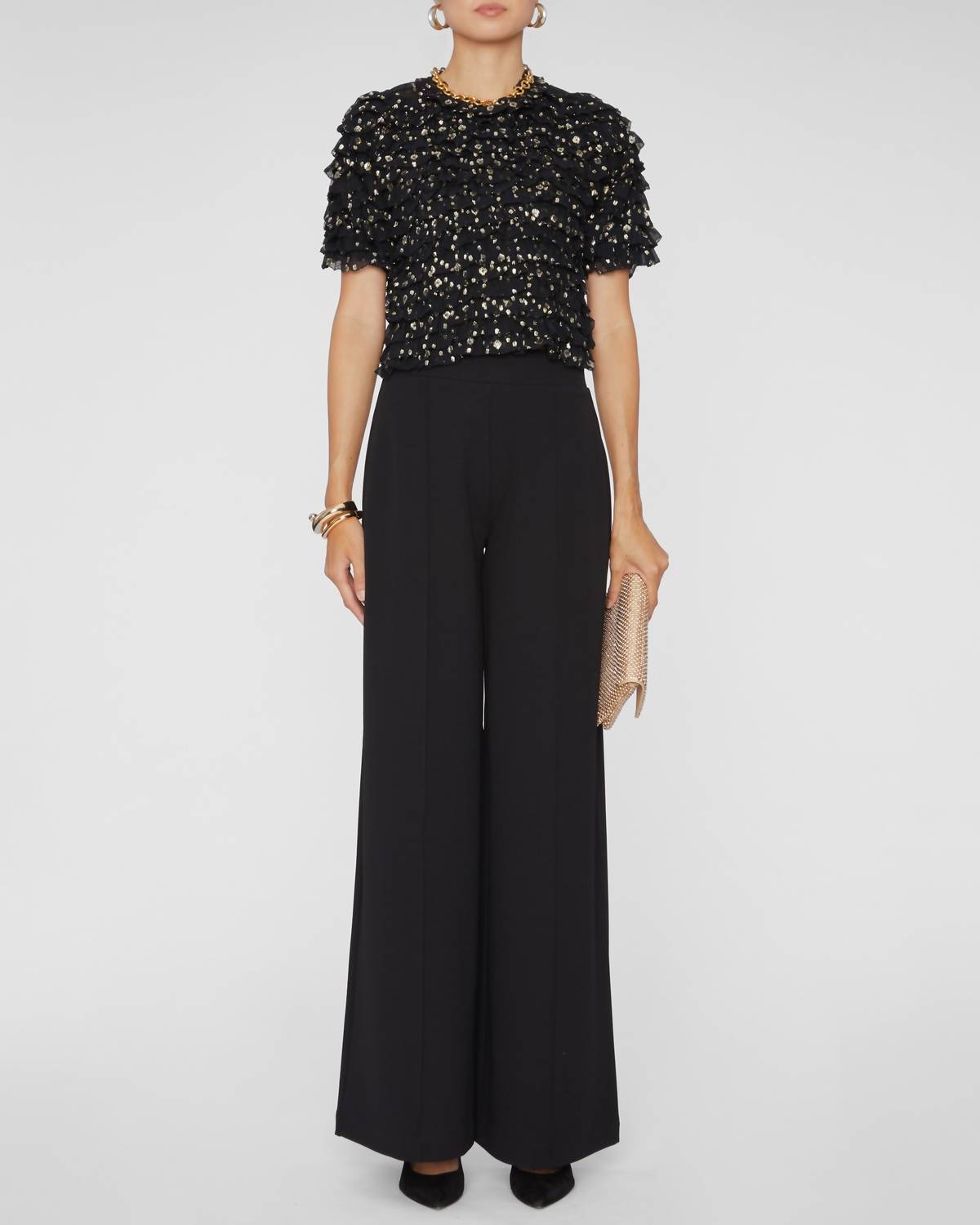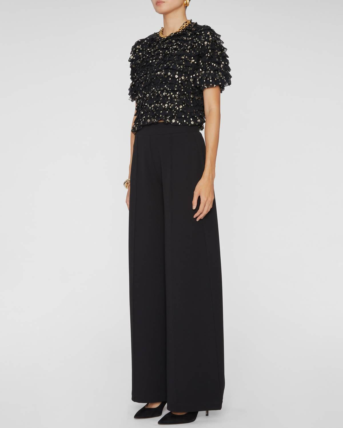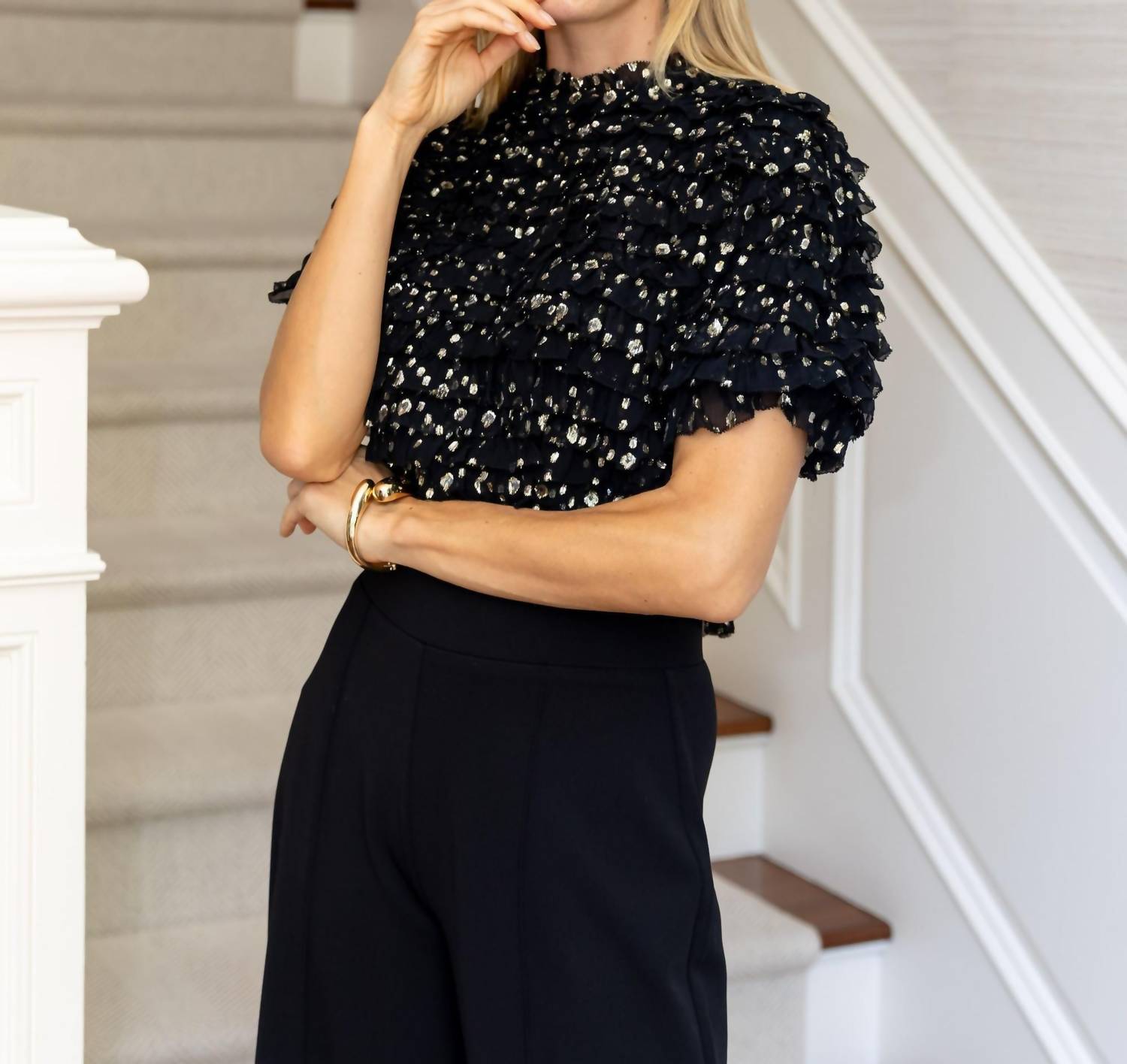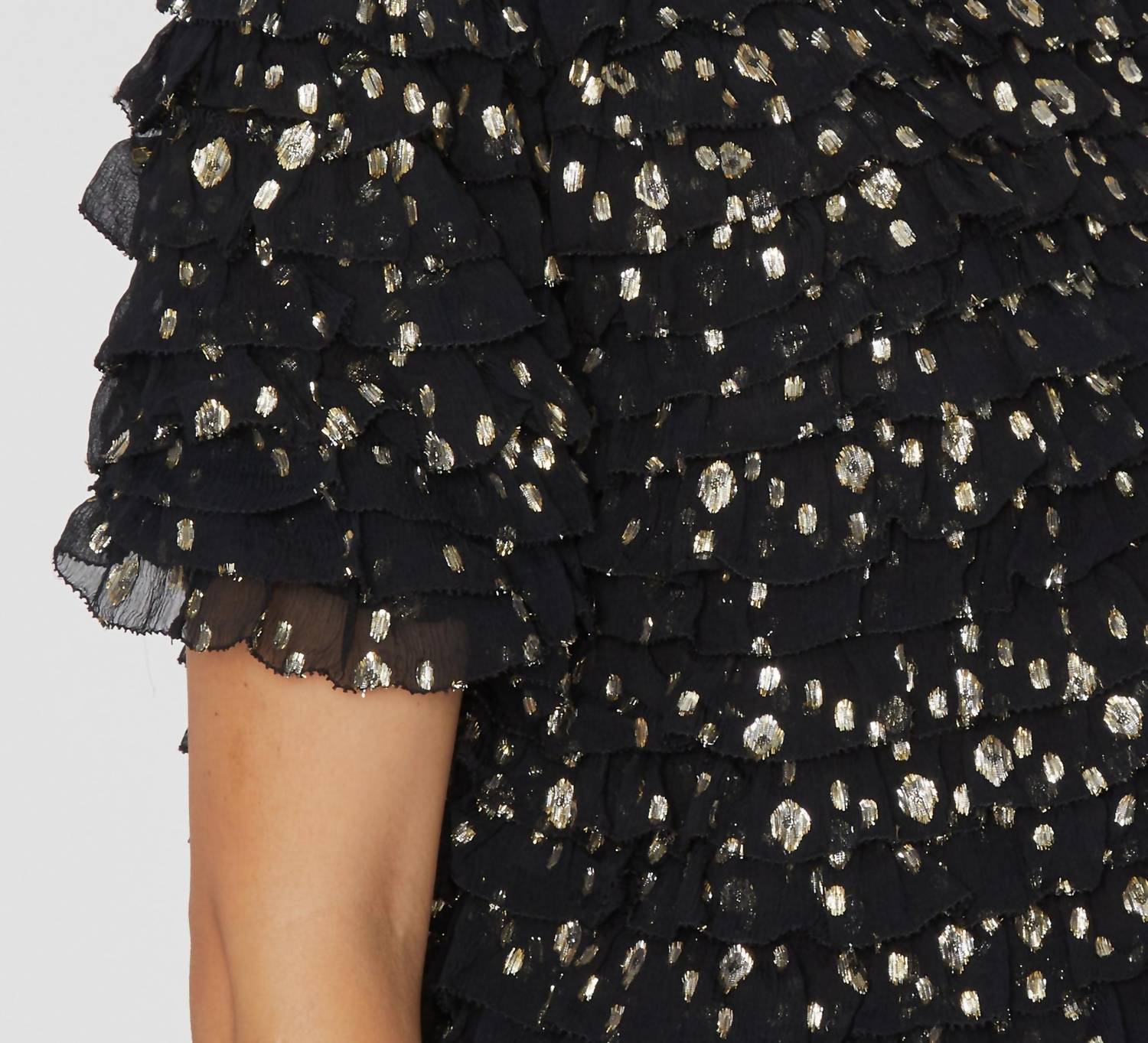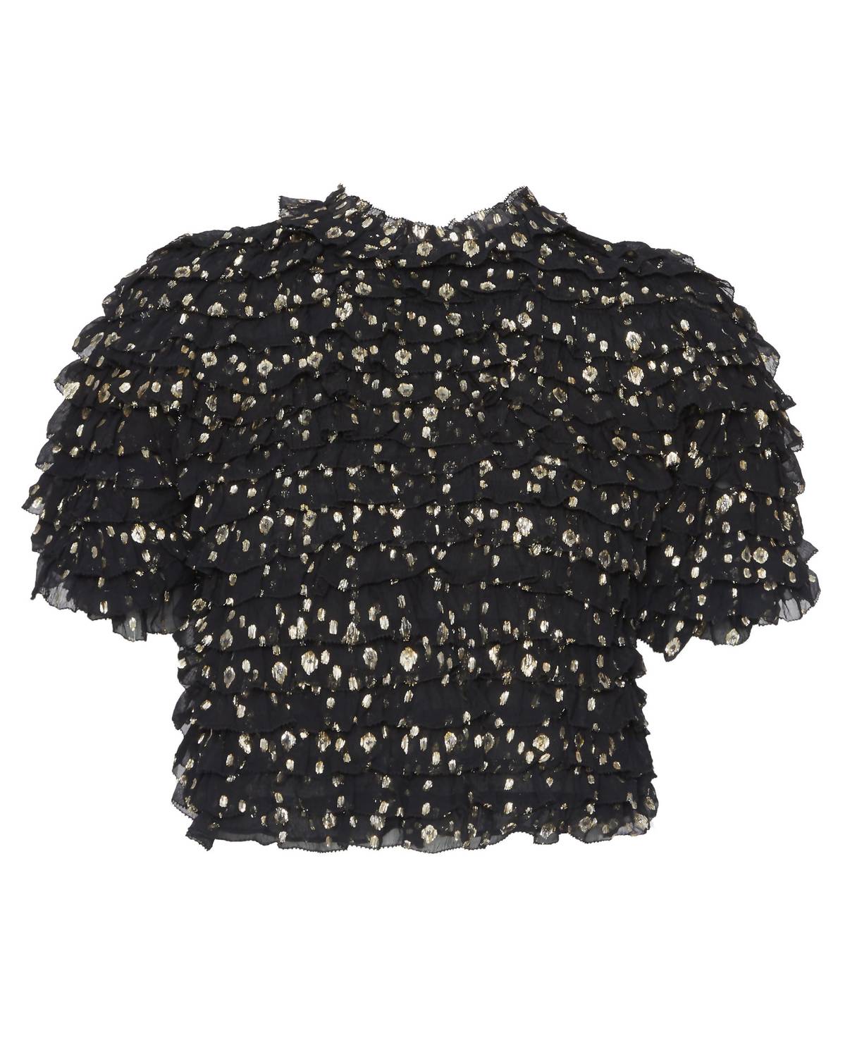A versatile blouse that works from desk to dinner! Elevate your dinner party ensemble with the Carmella Short Sleeve Blouse by Ulla Johnson, a perfect representation of quiet luxury. This elegant blouse in Cosmos features a sophisticated round neckline and short sleeves adorned with allover ruffles. Crafted from a luxurious blend of 92% silk and 8% metallized polyester, it offers a shimmering appeal suitable for any summer occasion. The blouse closes smoothly with a back zipper and requires dry cleaning to maintain its exquisite texture.