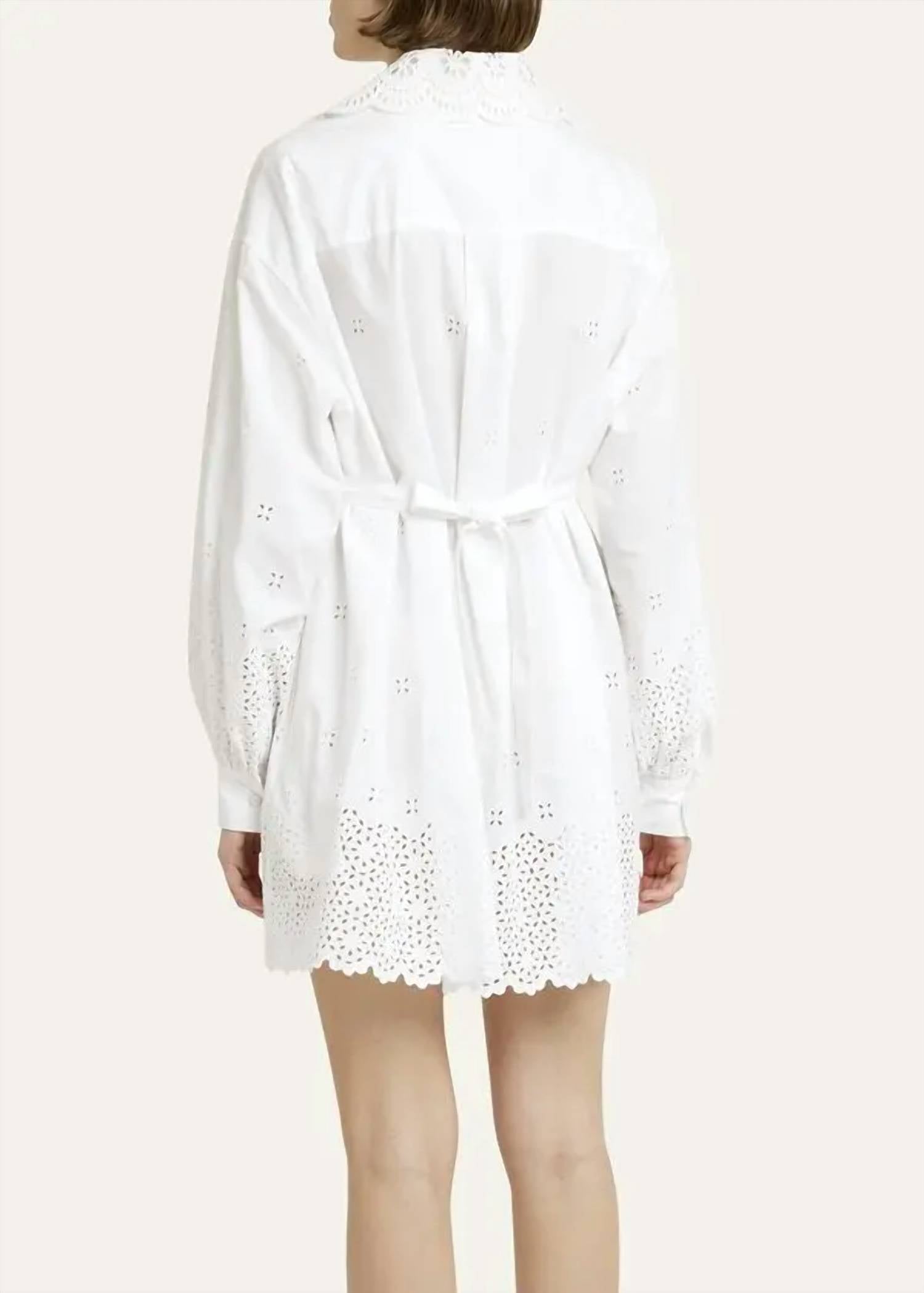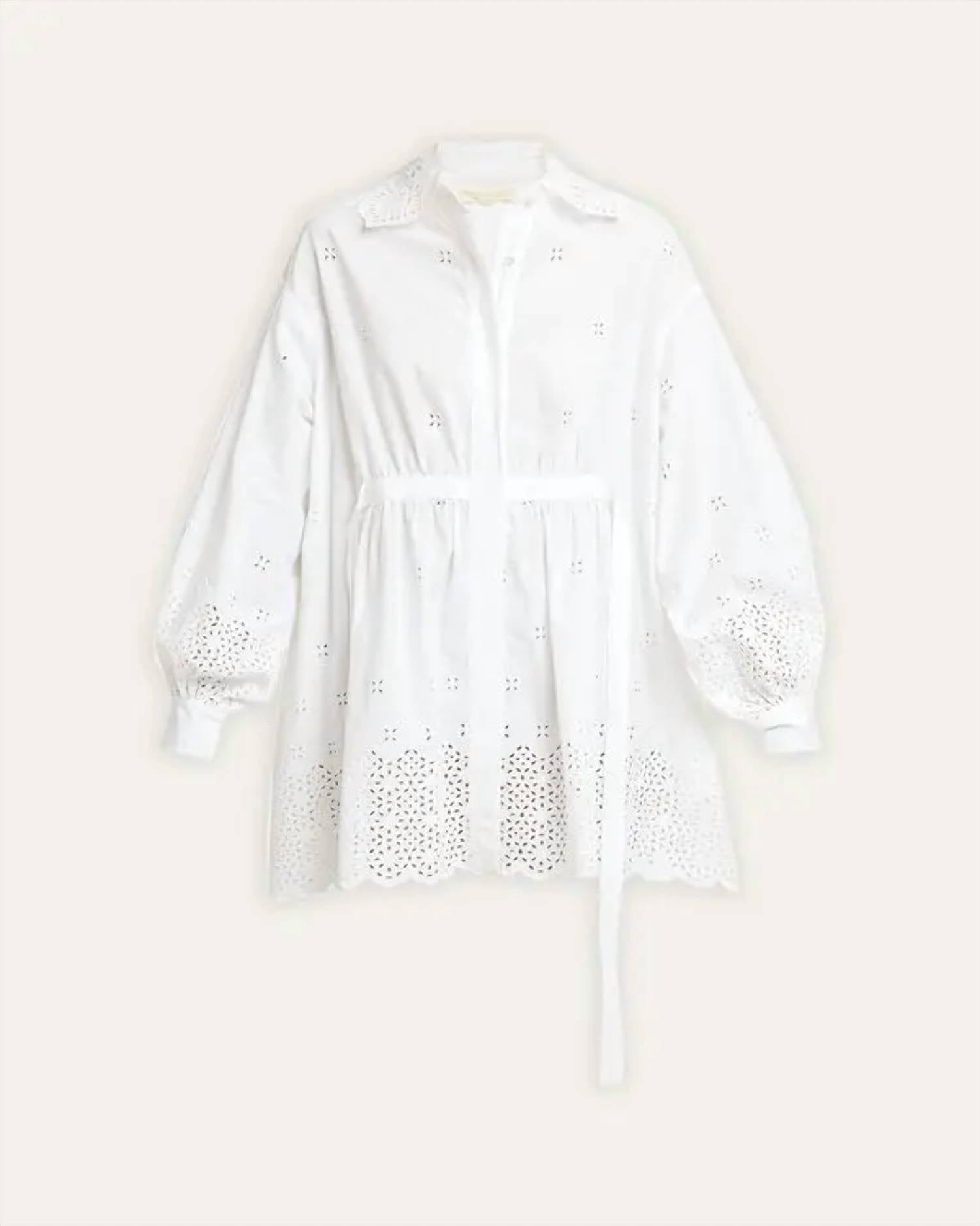The perfect mini dress for those warmer months. Discover the Gemma Dress by Ulla Johnson, a Boho Chic mini dress perfect for weddings. This elegant piece showcases long blouson sleeves with cuffs and a spread collar, highlighting its shirt silhouette. Crafted from 100% cotton eyelet fabric, it features a cinched waist and self-tie at the back for a tailored fit. With a 34.9" garment length and a button closure, this made-for-spring dress must be dry cleaned to maintain its patterned Cowrie charm.
