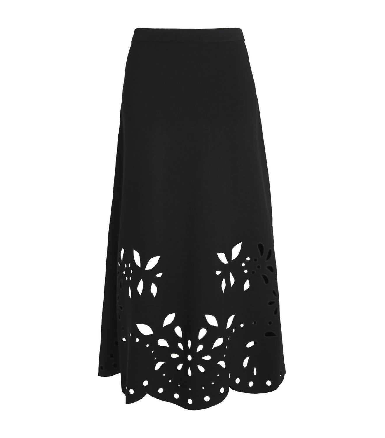 Tuck your favorite tee into this midi length skirt for an effortlessly cool look. The Grace Knit Midi Skirt by Ulla Johnson is a testament to the brand's dedication to luxurious materials and romantic design. Featuring an elasticated waistband and crafted in a comfortable viscose blend - 83% Viscose 17% Polyester, this noir-hued piece showcases stunning petal eyelet embroidery. The skirt is a pull-on style, drawing inspiration from vintage Italian lace, revealing alluring hints of skin through its laser-cut details. Care instructions recommend dry cleaning to maintain the garment's intricate craftsmanship.