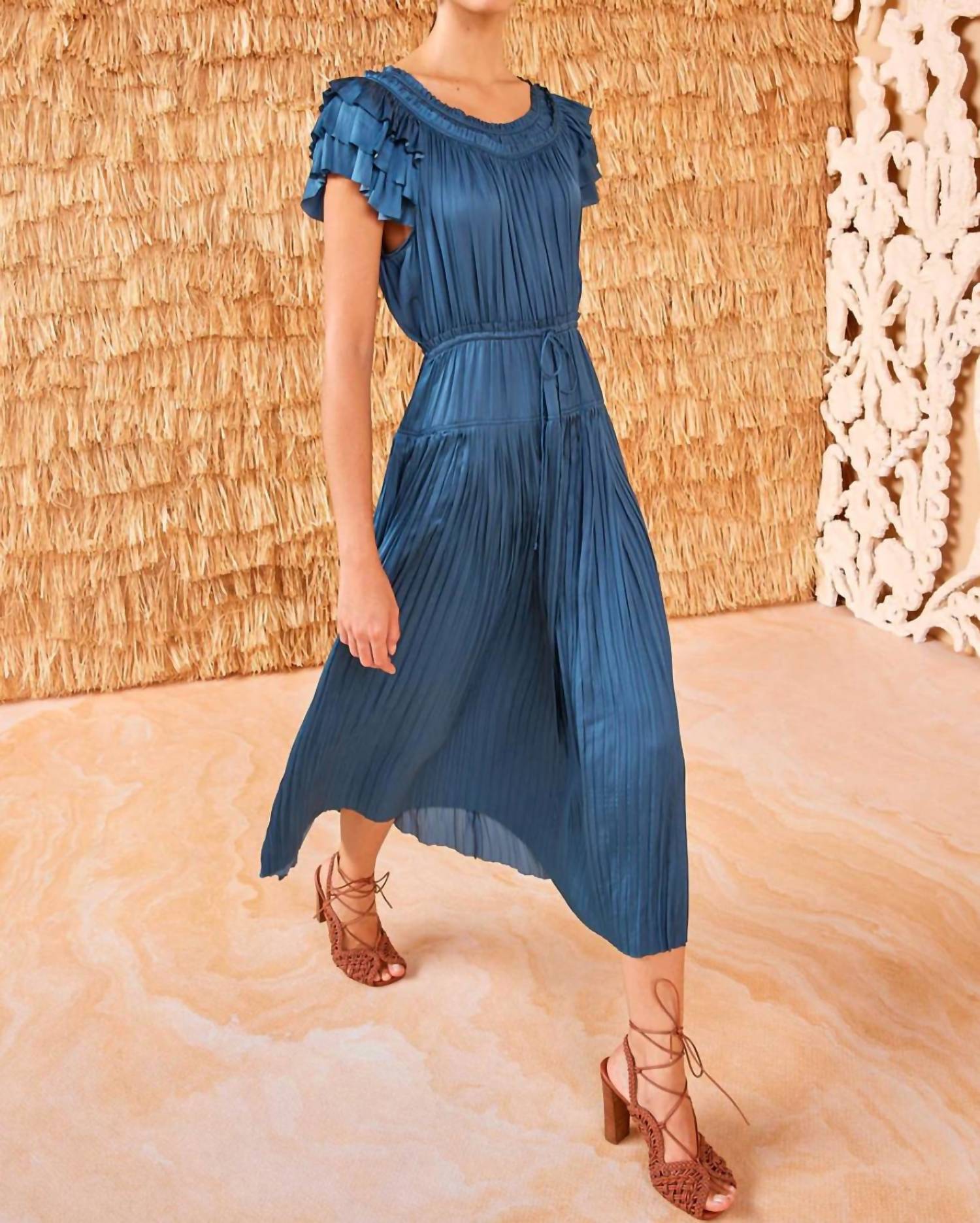A midi dress so versatile, your options for wearing it are endless. Introducing the Ulla Johnson Kalesta Midi Dress, a stunning addition to your summer wardrobe in a monochrome Neptune hue. This elegant A-line dress features micro-pleated short sleeves and a scoopneck, with a flattering drawstring waist ensuring a perfect fit. Crafted from 100% Polyester, the dress flows gracefully to a midi length with a solid pattern. Closure: Pull-on. Care: Dry clean only. Ideal for Easter and other special occasions.