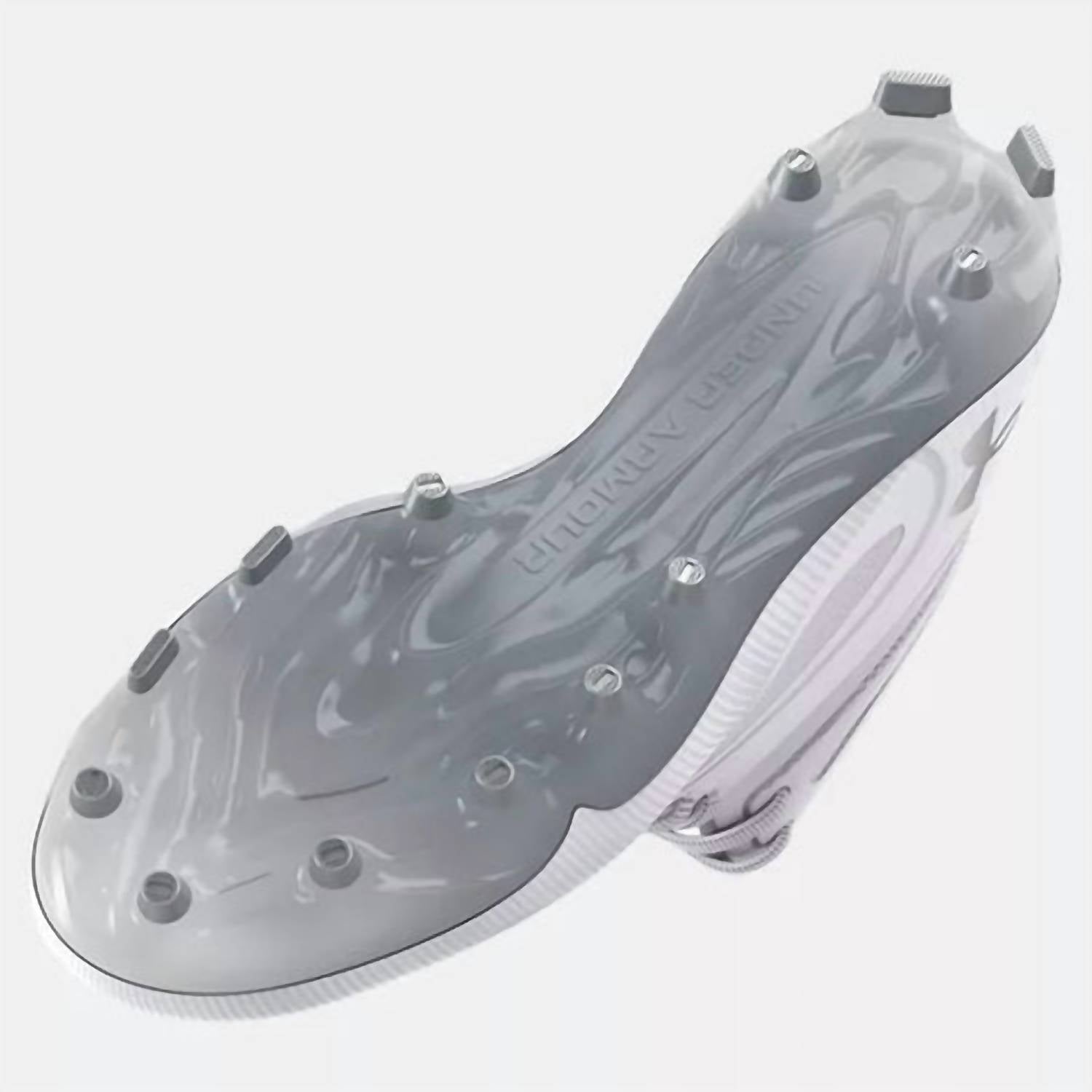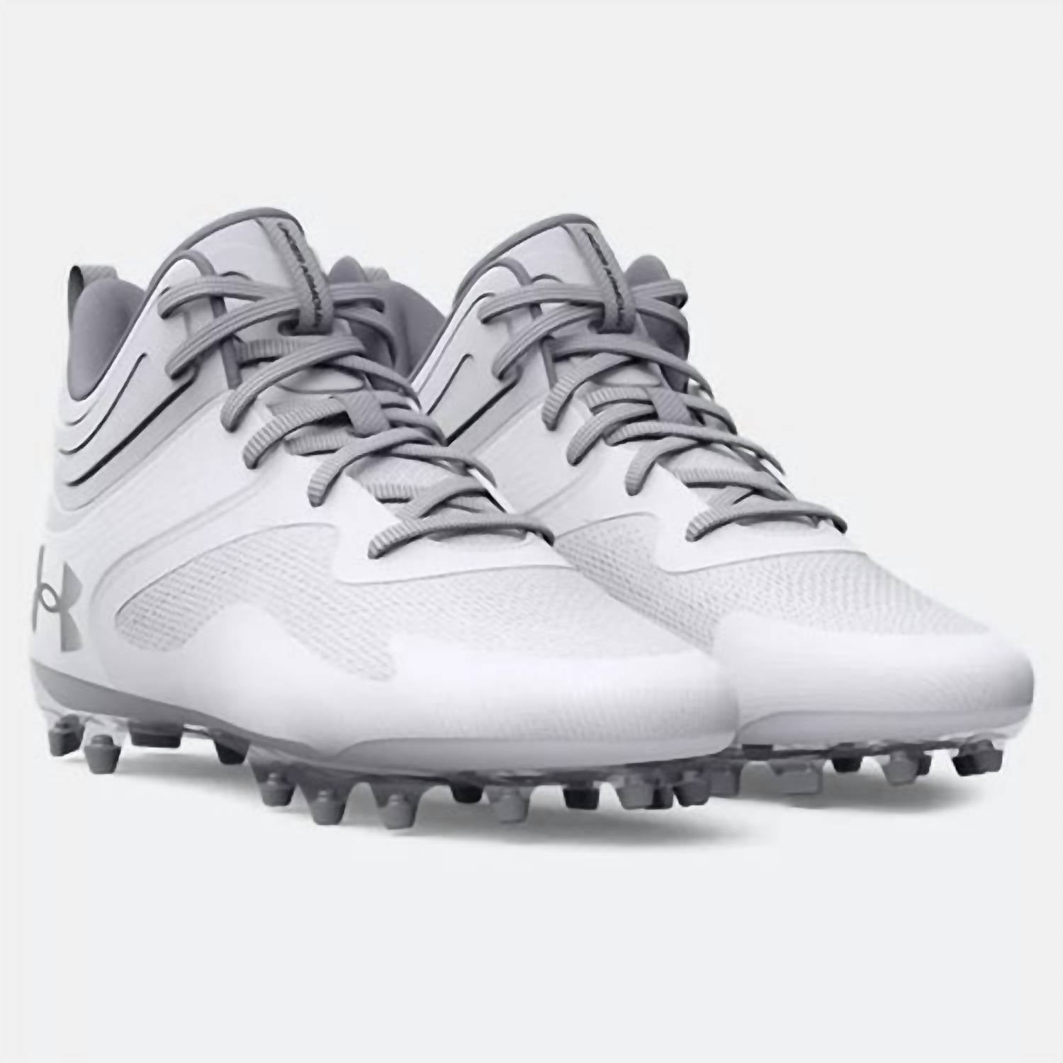 Enhance your athletic prowess with the Men's Command MC Mid Shoes by Under Armour, tailored for performance and durability. These white lacrosse cleats feature a light, breathable Warp Knit upper and strategic TPU overlays for enhanced abrasion resistance. The molded collar and tongue, along with a synthetic heel overlay, provide essential support and comfort, while a 3D-molded sockliner ensures all-day comfort. Equipped with strategically placed bladed and conical studs, these shoes offer superior traction for agile, multi-directional movements.