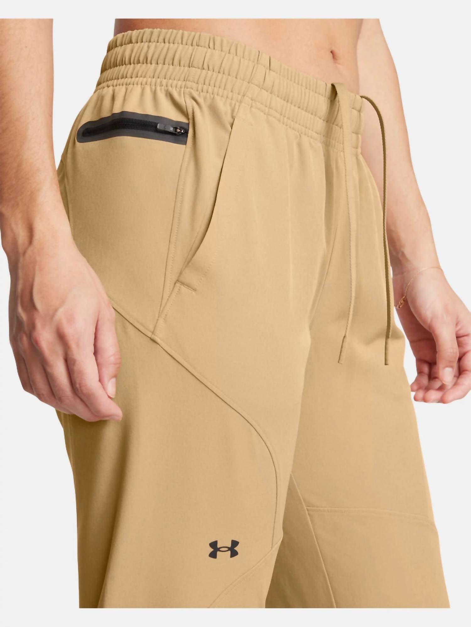 Pair these with your favorite sneakers for an effortlessly cool look. Introducing the UNDER ARMOUR Unstoppable Joggers in Taupe, perfect for your active lifestyle. Designed with a tapered leg and a convenient pull-on closure, these joggers feature a 27.25" inseam for a flattering fit. Their composition of 90% polyester and 10% elastane ensures durability and flexibility, complemented by stretch-woven fabric that wicks sweat and dries rapidly. Created for women and made with at least 90% recycled polyester, these joggers are imported and designed for comfort with an encased elastic waistband and ample pockets, including a secure zip side pocket for your essentials. Care for these activewear pants is simple: machine wash and line dry.