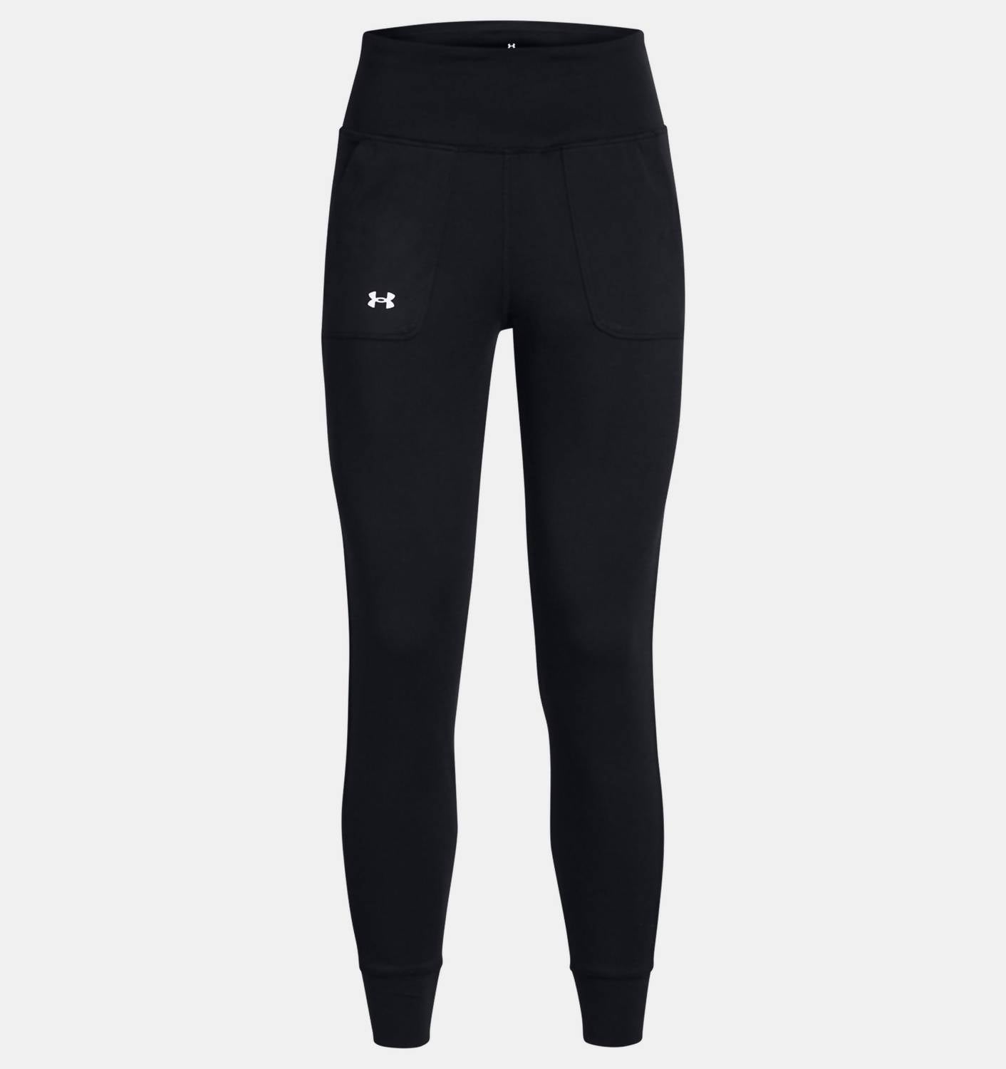 The perfect pant for running around town and looking cool while doing it. Introducing the Women’s Motion Joggers by Under Armour in sleek Black/White, perfect for your active lifestyle. These solid high-rise joggers feature a relaxed fit and tapered leg with a wide, flat waistband for a comfortable pull-on closure. Crafted from 82% Polyester and 18% Elastane, this ultra-soft fabric wicks sweat effectively while offering four-way stretch for enhanced movement. With convenient open hand pockets, the joggers have a 27" inseam for a flattering fit. Care instructions include machine wash and tumble dry.