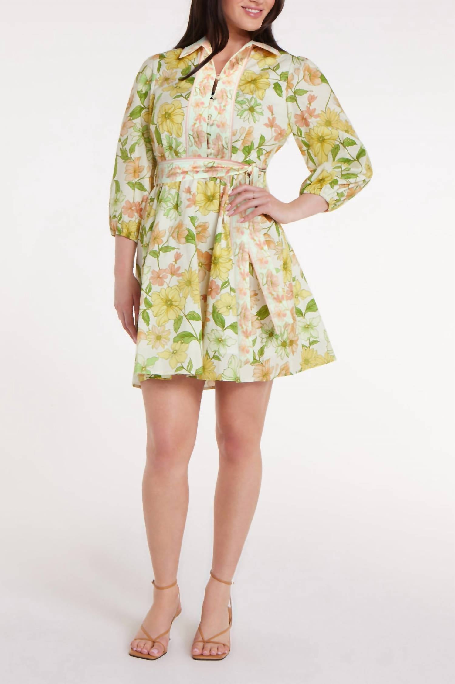 The kind of easy and flattering dress you'll be reaching for all season long. Step into spring with the Halle Mini Dress by Hermoza, an elegant fusion of timeless charm and playful sophistication. This dress features three-quarter puff sleeves and a structured collared neckline, perfect for any engagement. Made from 100% Cotton with an elegant A-line silhouette, it showcases the Sights of Spring print, adorned with painterly florals. Closure: Tie closure.