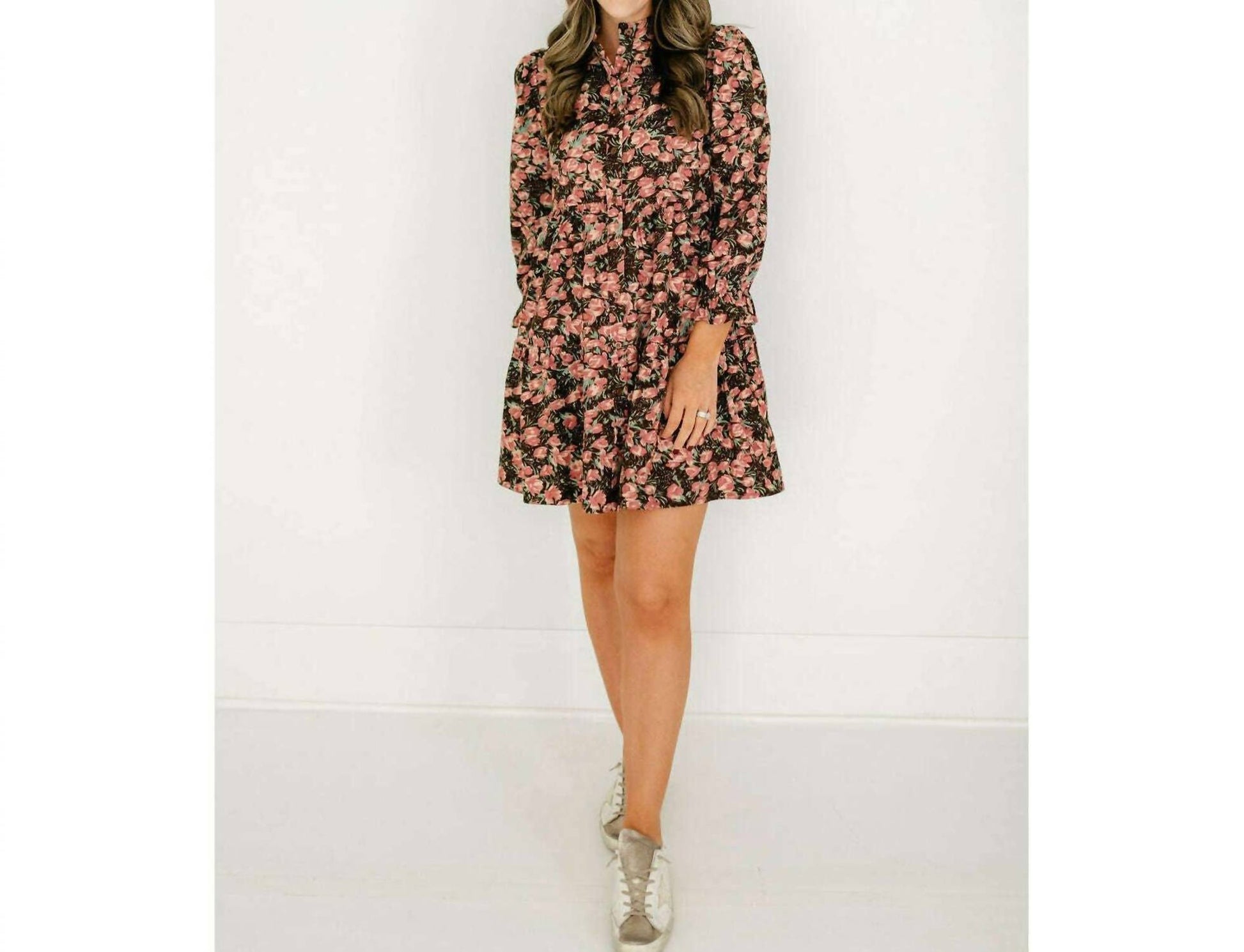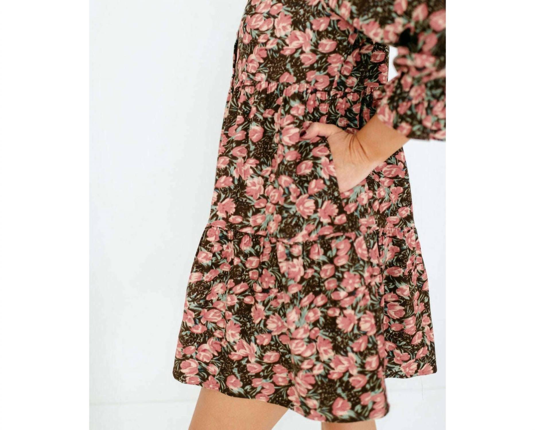 The perfect mini dress for those warmer months. Introducing the Joy Joy Bloom Corduroy Tiered Dress, a stunning mini dress that exudes boho chic with a feminine floral pattern. Crafted from cozy corduroy, it features a flattering A-line silhouette with practical pockets and a classic crewneck. Designed with three-quarter sleeves, this brown dress is perfect for any fall occasion, from Thanksgiving gatherings to travel adventures. Closure: Button closure. Care: Machine wash cold.