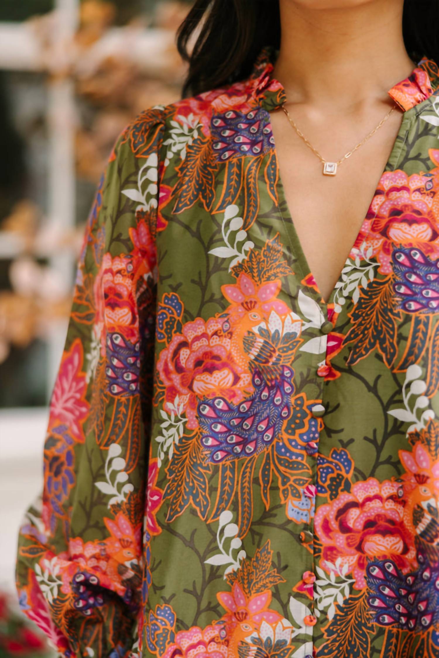 The perfect mini dress for those warmer months. Embrace timeless elegance with the Hayes Floral Mini Dress by J.Marie, a delightful addition to your spring wardrobe. This olive green dress features a charming floral pattern and a V-neckline with a partial button-down front closure, complemented by long sleeves with elastic cuffs. Its tiered drop waist and A-line silhouette provide a flattering fit, while the pull-on closure ensures ease of wear. Originating without a specified country, this mini dress is machine washable for effortless care, making it a perfect choice for Easter celebrations or a dinner party.