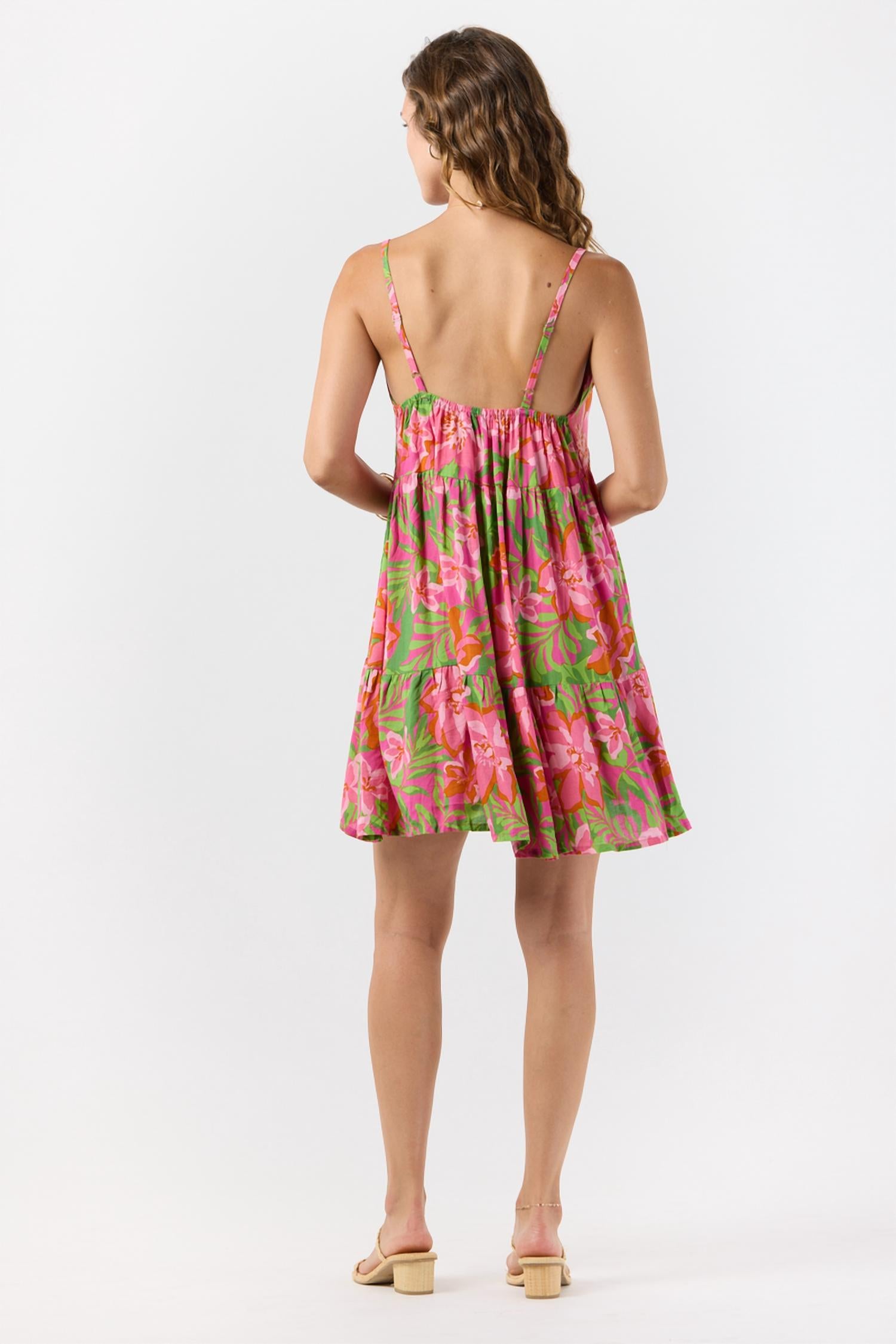 A short and breezy dress for those warmer days. Embrace effortless style with the Jenna Mini Dress by Tiare Hawaii in vibrant Honduras Pink. This A-line dress showcases delicate spaghetti straps and a V-neckline that adds an elegant touch, complemented by a playful tiered skirt. Crafted from 100% Rayon, it offers a flowy fit perfect for vacation or a casual day out. Closure: Pull on. Care: Hand wash cold, lay flat to dry.