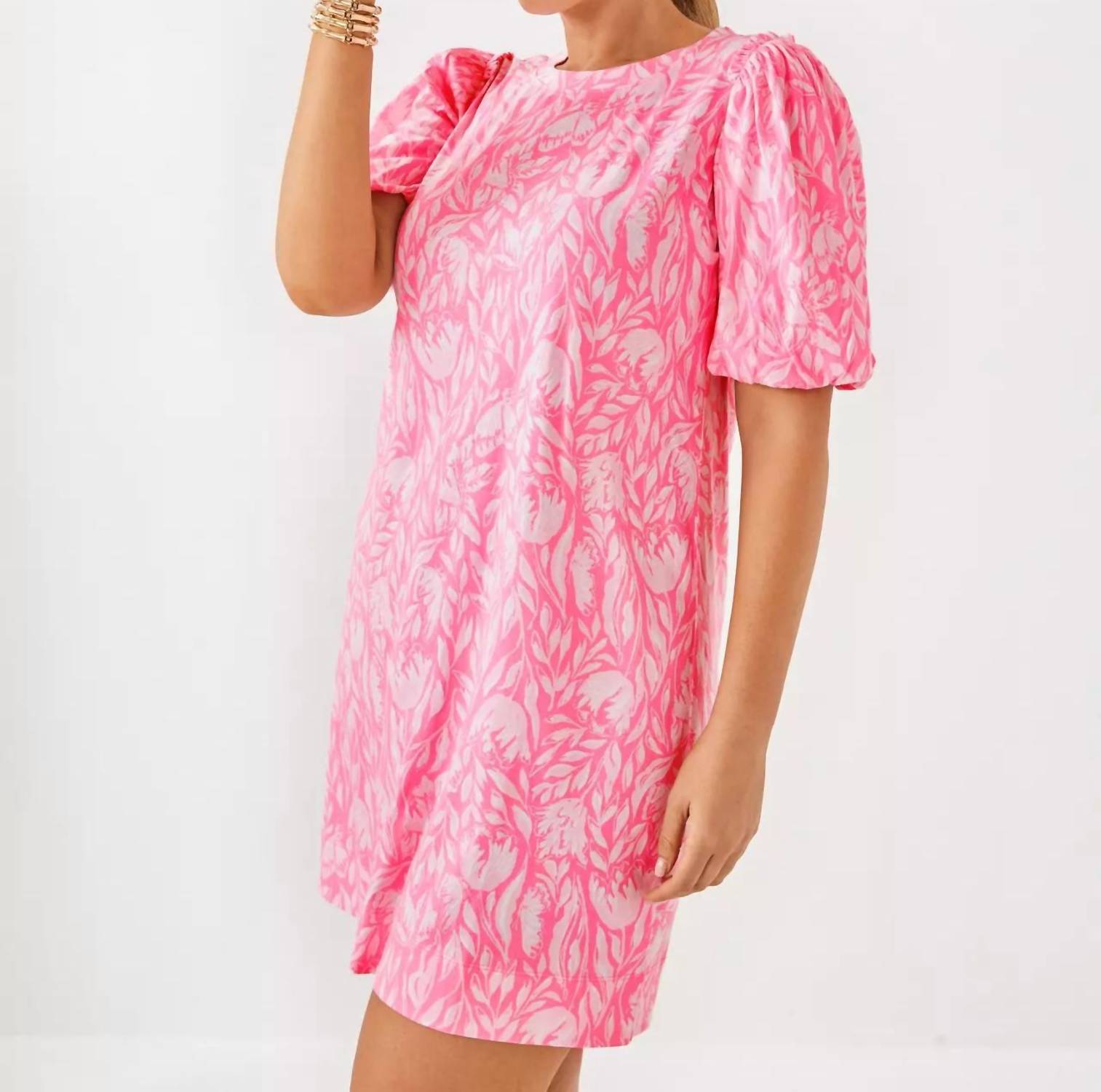 The kind of easy and flattering dress you'll be reaching for all season long. Enhance your wardrobe with the playful Mercer Mini Dress by Lilly Pulitzer, perfect for a vibrant dinner party look. This floral A-line dress in Rousseau Pink Tulip To Tango features short bubble-hem sleeves and a flattering crew neckline. Made from 100% Supima Cotton Jersey, it measures 36" from the shoulder to hem in a size small/4, with a straight fit that flatters the chest and hips while providing more room at the waist. Easy to wear with a pull-on closure, this imported piece is machine washable on a delicate cycle or can be dry-cleaned.