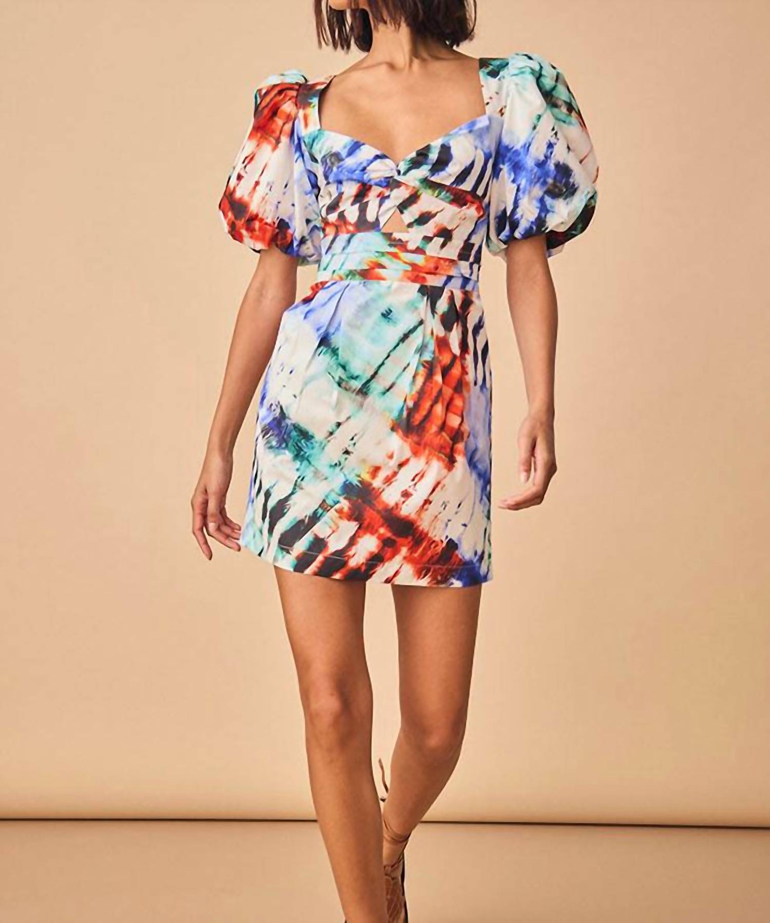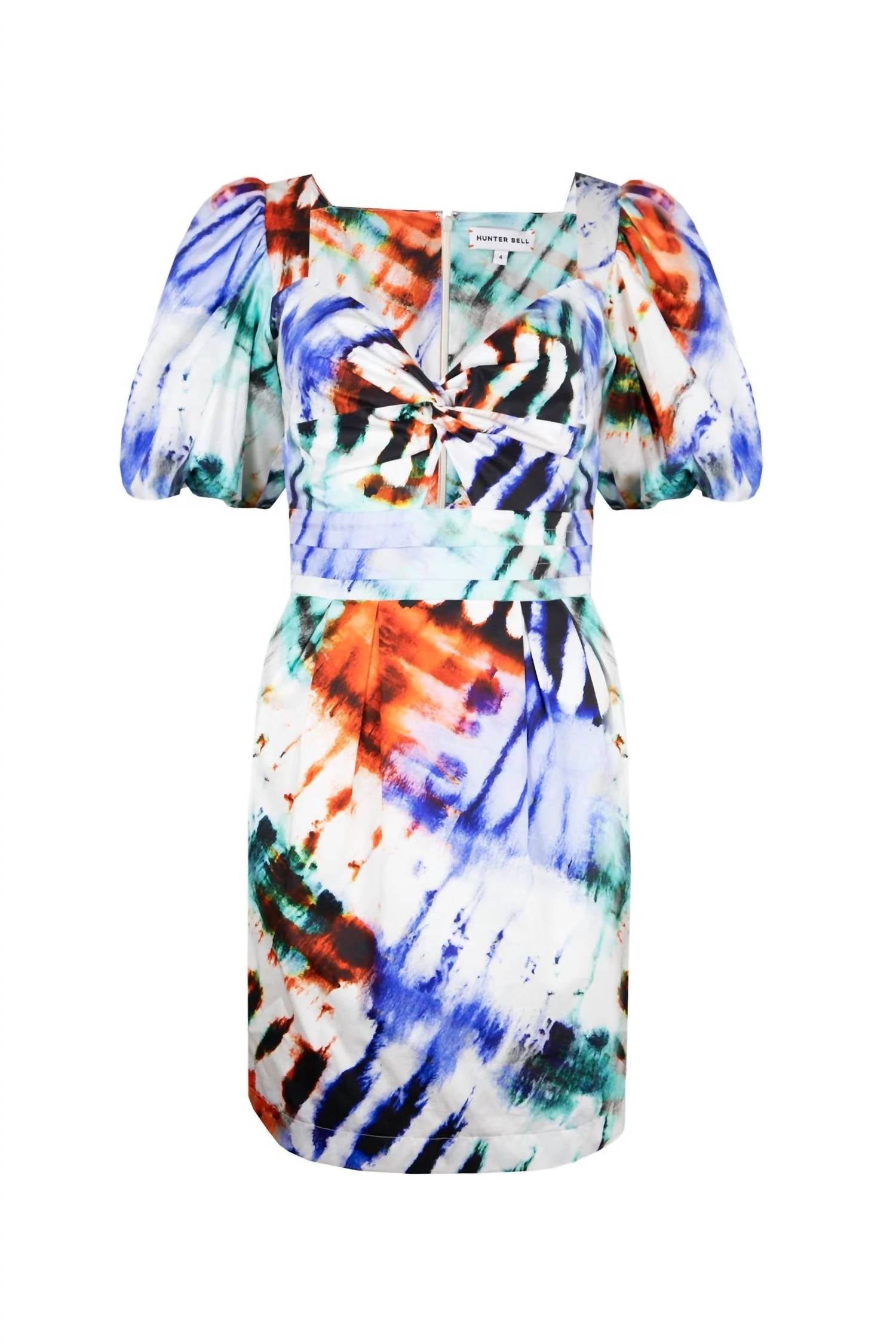 The kind of easy and flattering dress you'll be reaching for all season long. The Tilly Dress by HUNTER BELL captures the essence of spring with its playful electric tie-dye design. This mini dress is crafted from cotton and features a charming sweetheart neckline with short bubble sleeves. The standout details include a knot front with a daring waist cutout, complete with an invisible back zipper and hook & eye closure. Perfect for women seeking a spirited, flirtatious look.