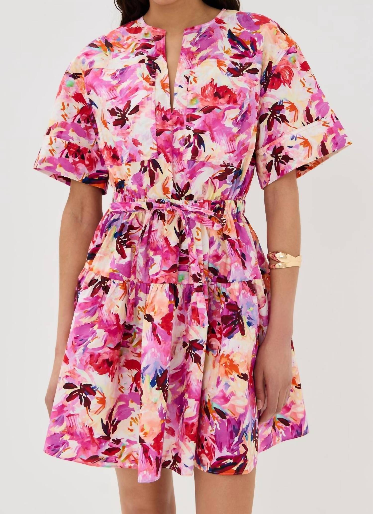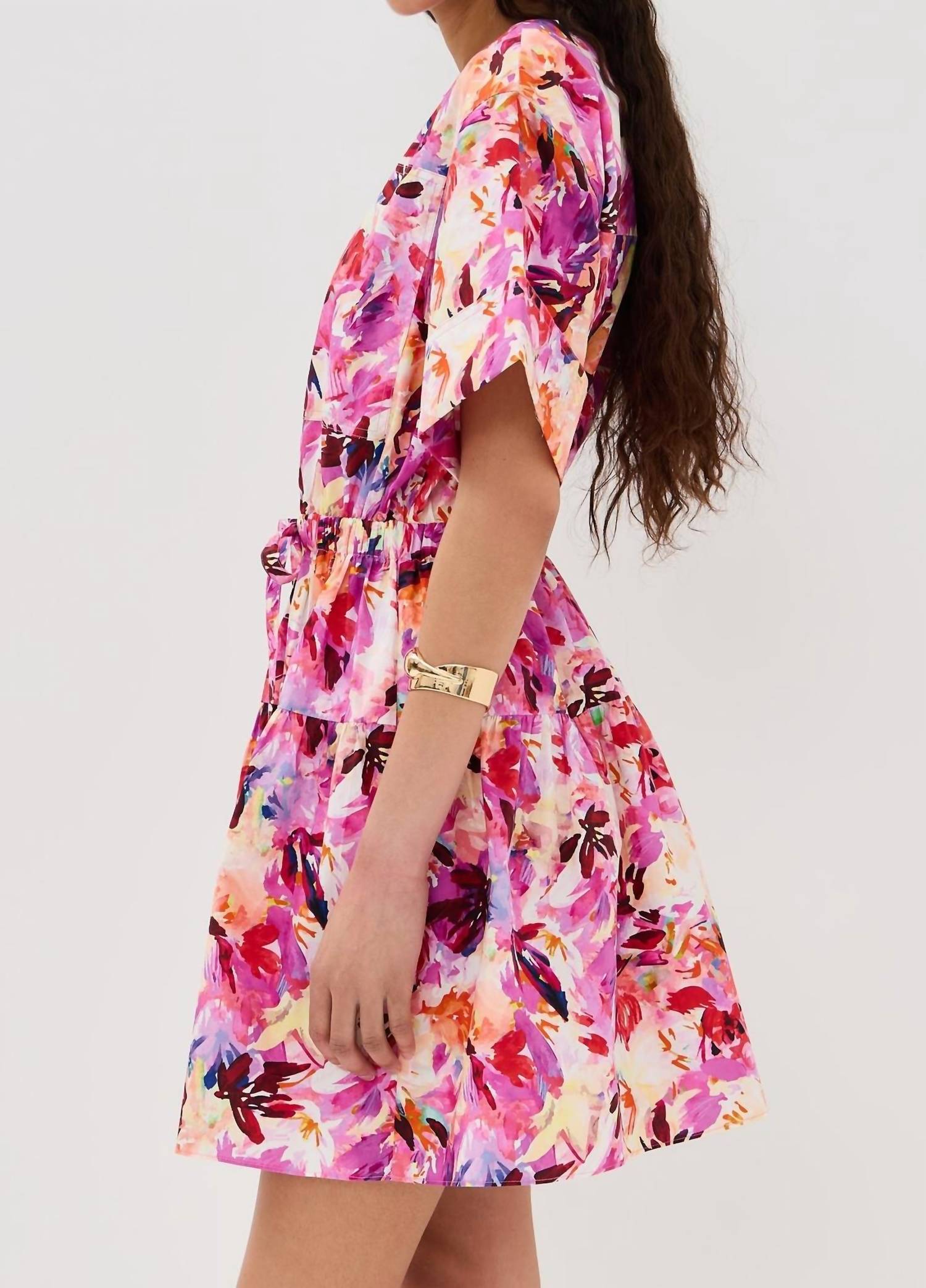 The kind of easy and flattering dress you'll be reaching for all season long. Boho chic mini dress in a vibrant Azalea hue, perfect for your holiday parties. Designed with short sleeves and a V-neckline. A-line silhouette offers effortless style with its floral print. Made from 100% cotton. Features a covered elastic waist with a drawstring and on-seam side pockets for practicality. Pull on closure. Hand wash. Length: measures 33.75 inches (86.0 cm) from shoulder. For those considering fit, runs large and wide, so sizing down is recommended for a slimmer fit. Model Anisa (5'8.5") is wearing size 0.