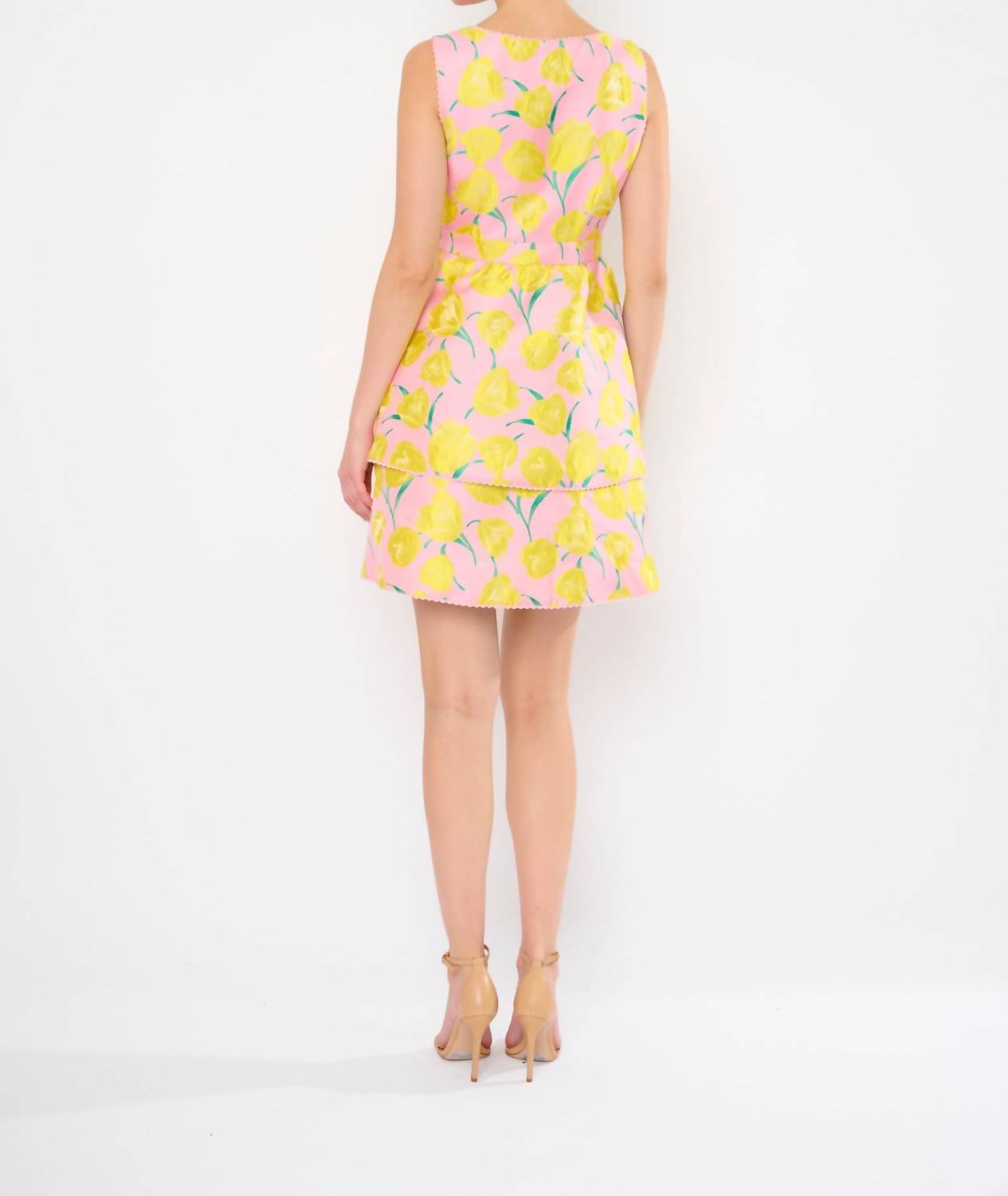 A short and breezy dress for those warmer days. The Terina Dress by Flora Bea is a charming addition to your spring wardrobe, showcasing a sleeveless V-neck design perfect for sunny days. This mini dress is crafted from jacquard fabric with a lovely floral print in the Tulip Day hue, layered for a playful touch. Made with a shell of 100% polyester and a lining of 92% polyester and 8% spandex, it features a shine effect and hits just above the knee for a youthful silhouette. Closure: Side zipper.