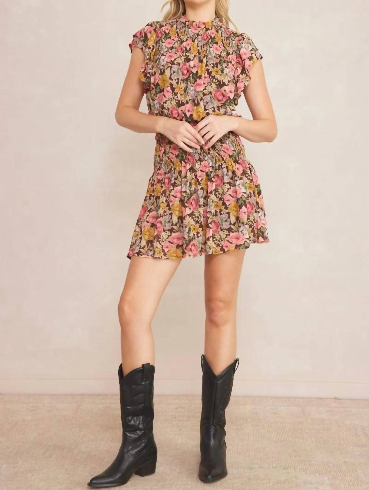 The perfect mini dress for those warmer months. Embrace a boho-chic summer look with the Floral Smocked Dress by Entro, featuring a whimsical floral pattern in warm brown tones. This mini A-line dress is crafted from 100% polyester with cap sleeves and a flattering mock neck, perfectly lightweight and lined for comfort. Made without pockets, its back button closure keeps things streamlined and elegant. Care for it with machine wash instructions, perfect for effortless vacation styling.