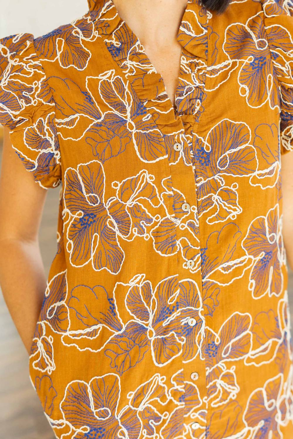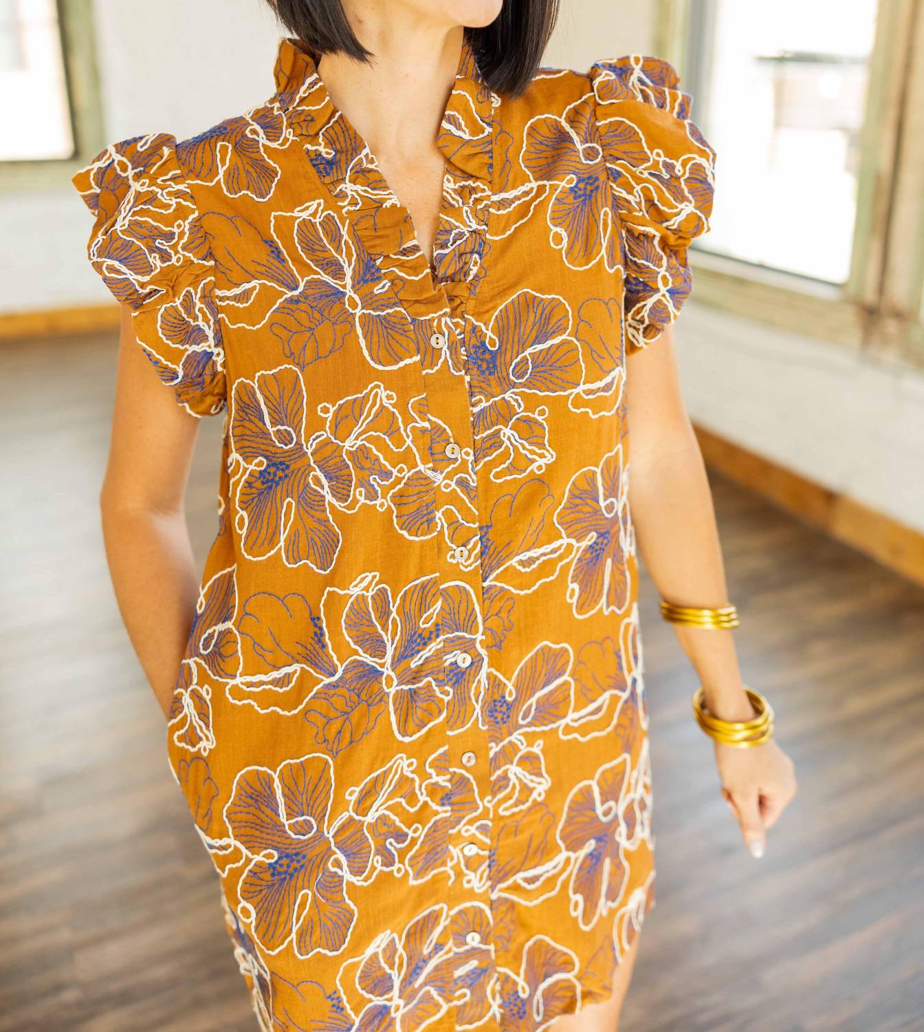 The perfect mini dress for those warmer months. Introducing the Women's Elle Embroidered Cap Sleeve Mini Dress by Entro, a chic addition to your wardrobe perfect for spring. This shift dress in a warm camel hue features charming cap sleeves and intricate floral embroidery in deep blue and ivory, offering texture and boho chic flair. Made from a blend of 70% nylon and 30% linen, it includes practical pockets and a comfortable lining. The dress boasts a button closure and is ideal for effortless style during vacation or casual outings.