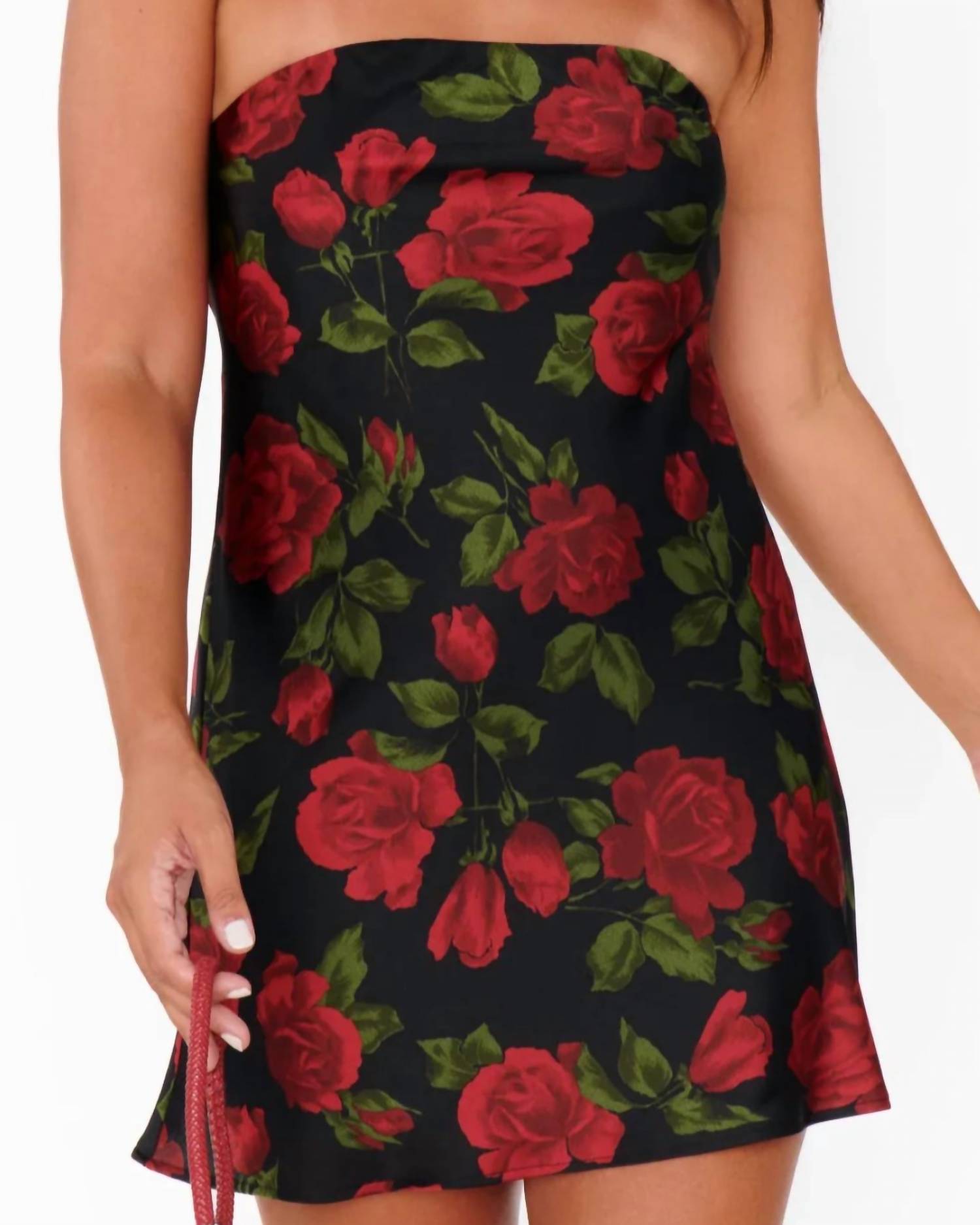 A short and breezy dress for those warmer days. Unveil a sophisticated charm with the Taylor Tube Mini Dress by Show Me Your Mumu, an epitome of romance and elegance in the Send Me Roses hue. This strapless silhouette is crafted from luxurious satin-like polyester with a subtle floral print and features a handy shelf bra with elastic for support. Measuring 32 1/2" from shoulder to hem, it is lined for a flattering fit perfect for spontaneous outings or cocktail soirées. Care instructions suggest hand washing to maintain its silky finish.