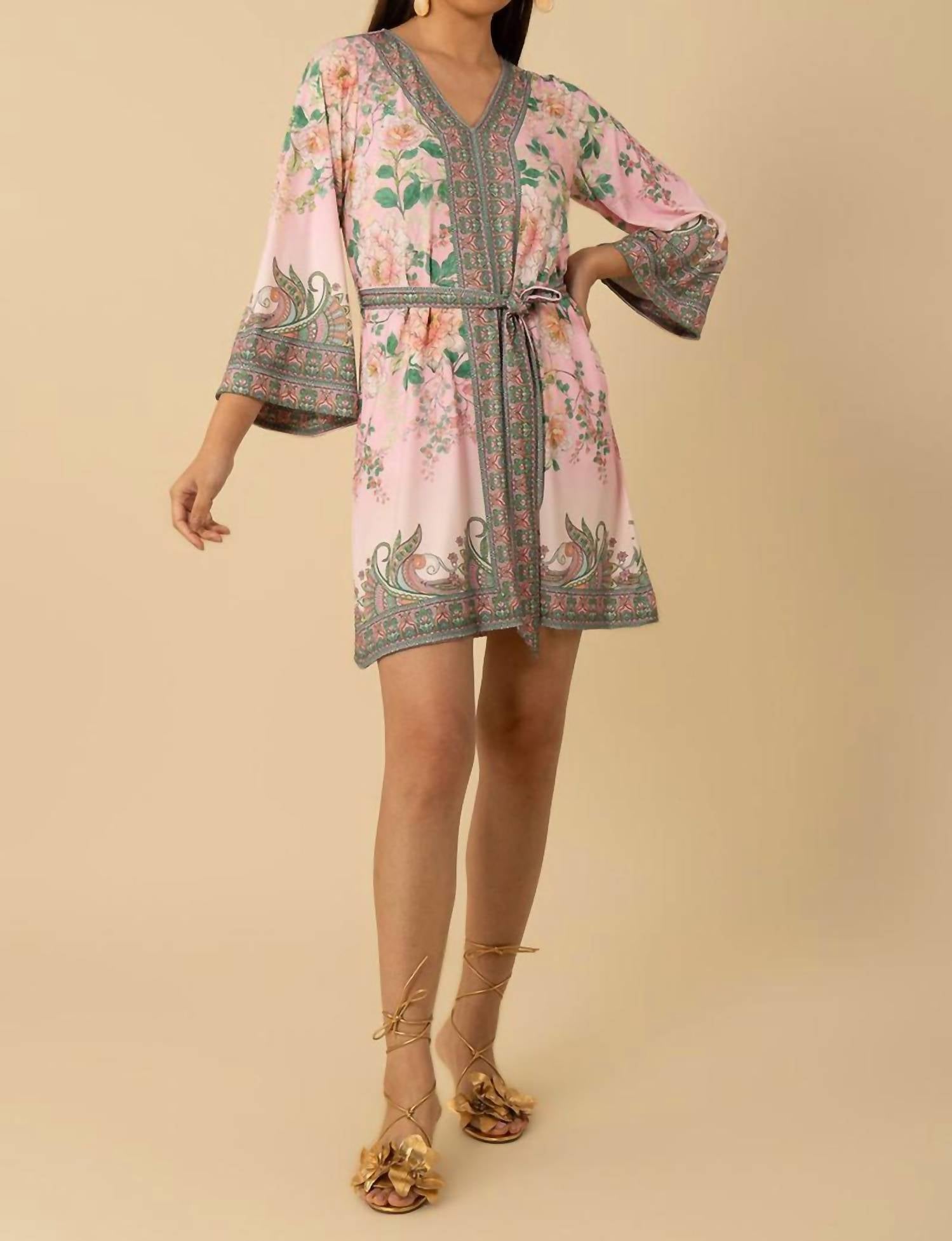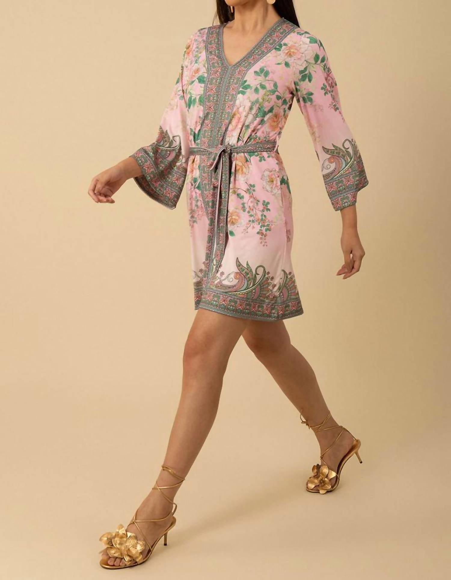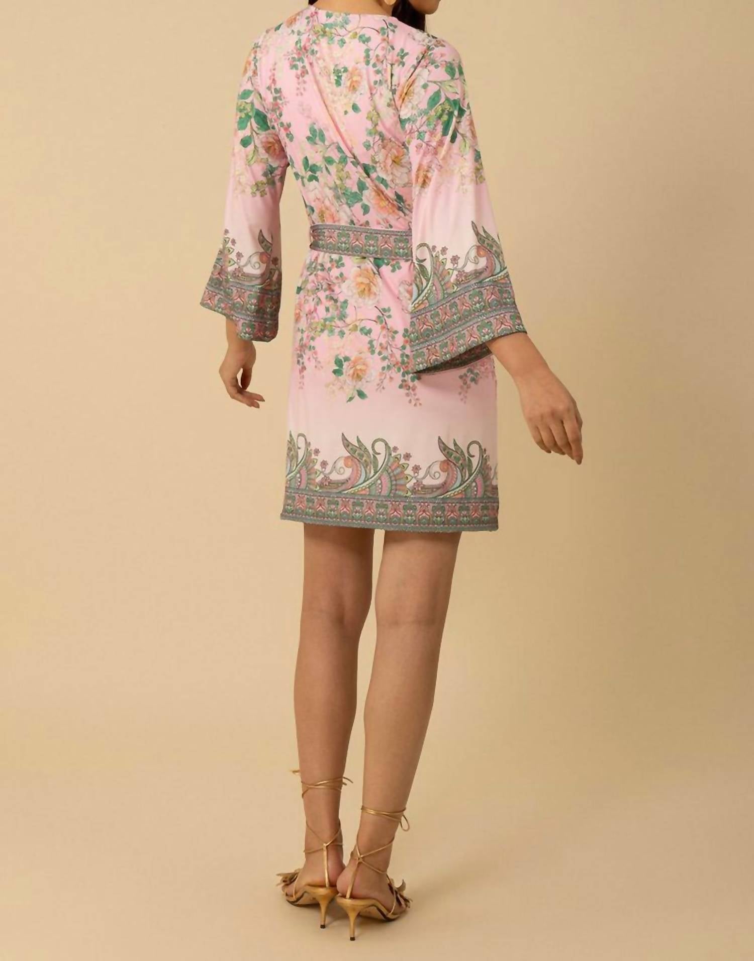 The perfect mini dress for those warmer months. Introducing the Kaliyah Jersey Dress by HALE BOB, a vibrant floral mini dress in pink that promises both style and comfort. Featuring three-quarter bell sleeves and crafted from 96% polyester with 4% spandex, this dress offers a playful shift silhouette with an above-the-knee length of 35.5 inches. Convenient pockets at the hips and a tie belt complement the chic v-neck design, while the pull-on closure ensures ease of wear. Perfect for your vacation wardrobe, this dress is designed for effortless elegance with the care instruction of do not wash.