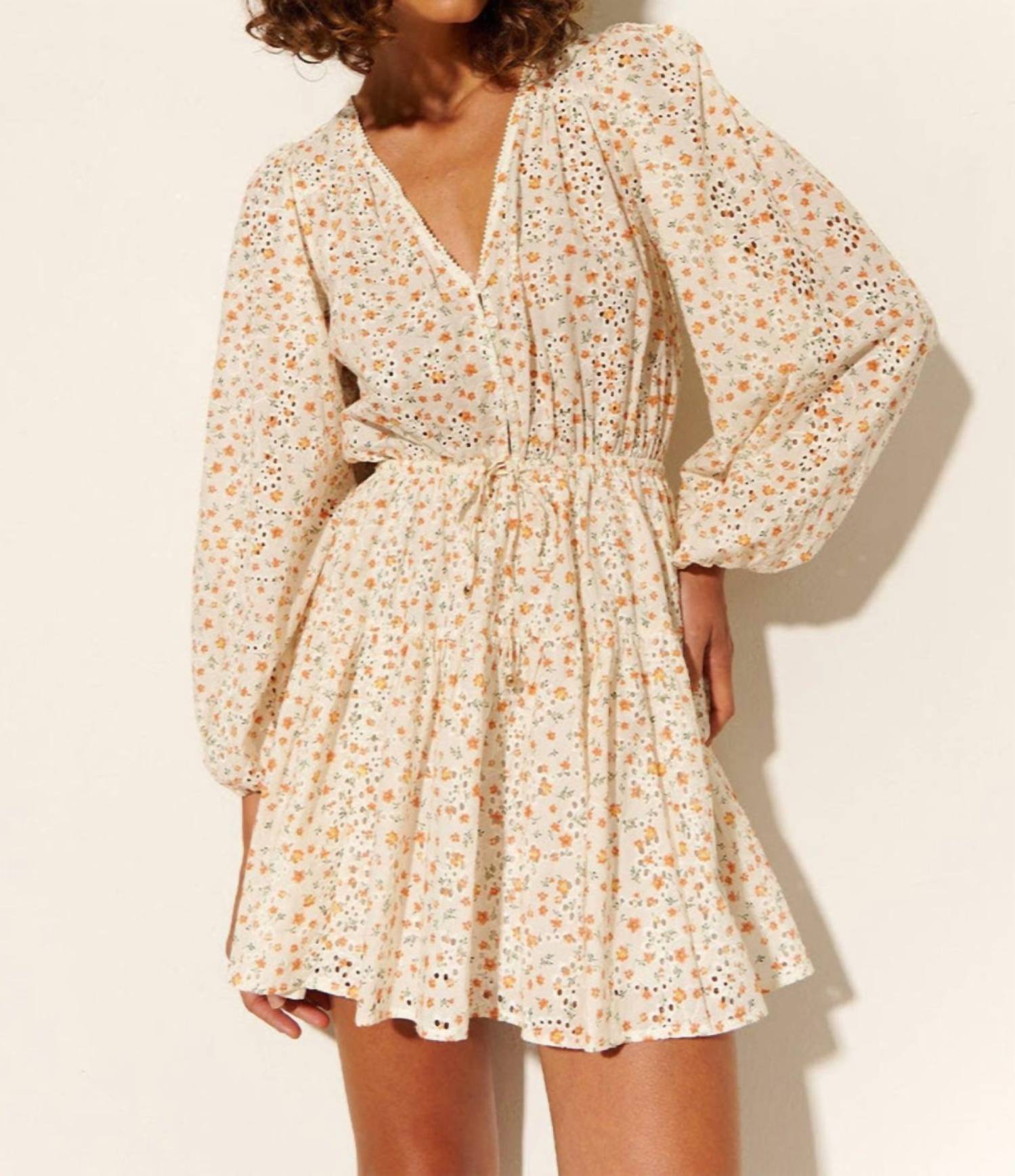 The perfect mini dress for those warmer months. Introducing the LUCIE MINI DRESS by KIVARI, a vibrant orange floral ensemble perfect for your boho chic wardrobe. This mini fit and flare dress features long blouson sleeves with elasticated cuffs and a gathered tiered skirt for an elegant silhouette. Made from 100% cotton, it offers adjustable elastic waist ties and a button closure for a customizable fit. Care instructions include machine washing and tumble drying for easy maintenance.