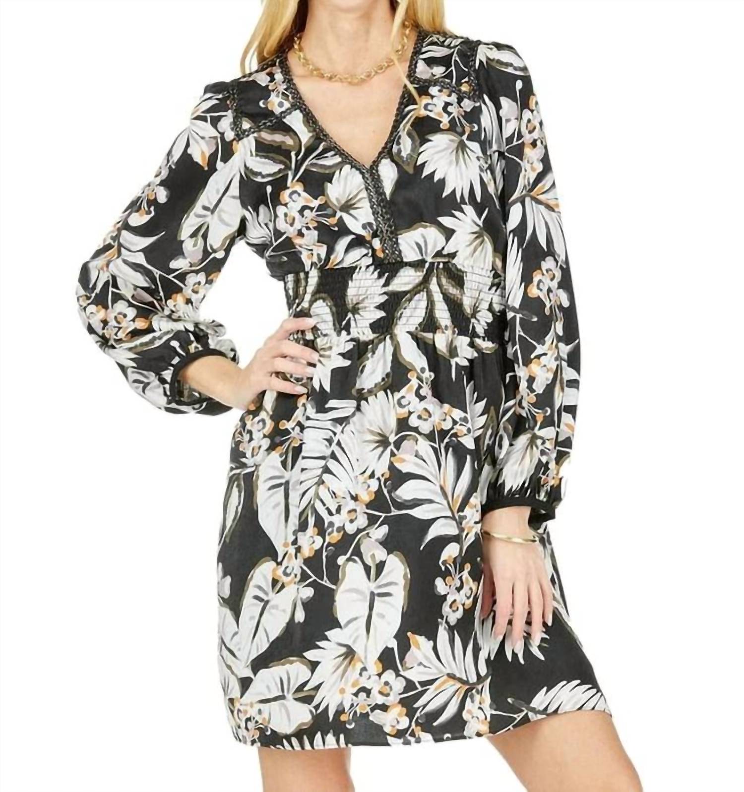 The perfect mini dress for those warmer months. Introducing the Foliage Dress by Joy Joy, an eye-catching Beige/White mini with a playful floral print designed to make a statement. This women's A-line dress features long sleeves and a flattering V-neckline, perfect for a Thanksgiving dinner party. Pull-on for easy wear. Ideal for adding a touch of joy and style to your fall wardrobe.