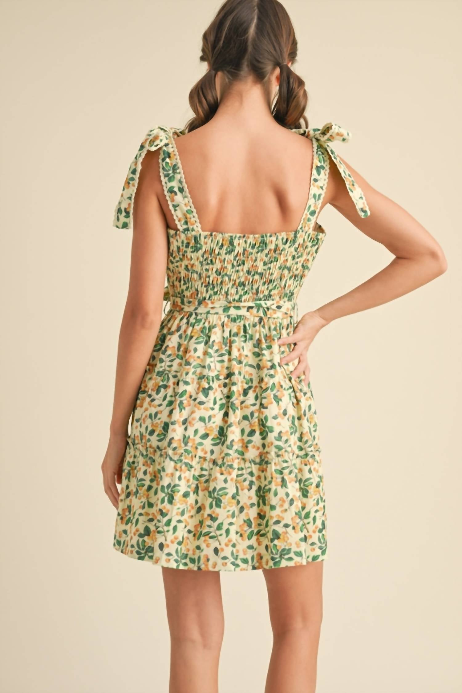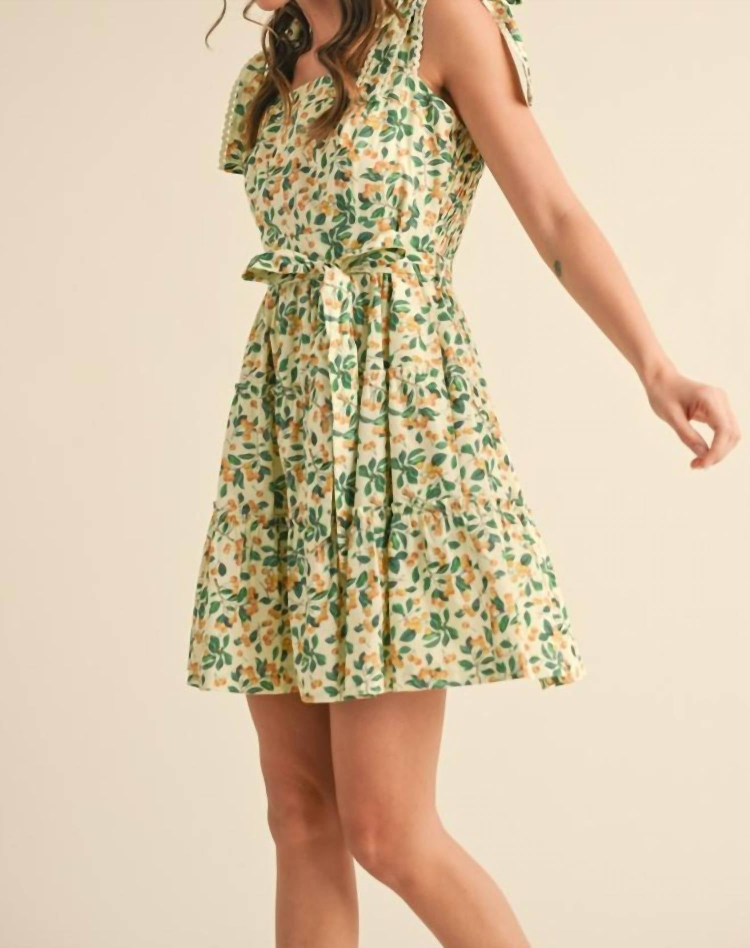 The perfect mini dress for those warmer months. Elevate your summer wardrobe with the Cherries Crochet Lace Trim Tie Strap Tiered Mini Dress by Merci, showcasing a vibrant cherry print on cheerful yellow. This sleeveless dress features wide tying shoulder straps adorned with crochet lace trim and a flattering square neckline. Crafted from 100% cotton, it boasts a smocked elastic back and a side zipper closure for a perfect fit, complete with a playful ruffle tiered mini hem and a fitted waist with a tying sash. Made in China, it embraces a carefree vacation vibe while offering practical pockets, and is easy to maintain with hand washing and line drying.