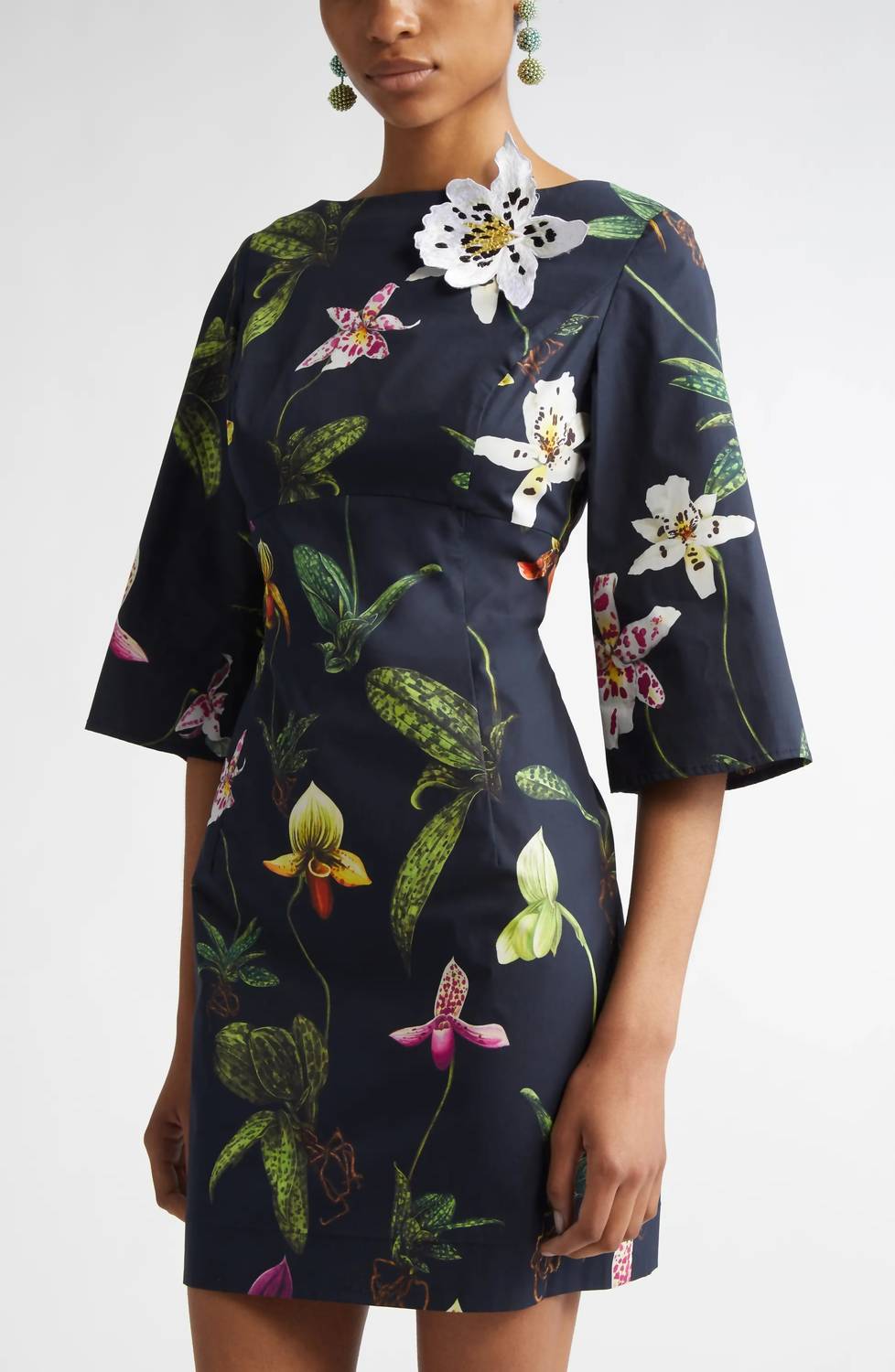 A short and breezy dress for those warmer days. Introducing the Oscar de la Renta Three Quarter Bateau Neck Poplin Dress, a statement piece perfect for spring festivities. This dress features three-quarter sleeves and is crafted from a cotton blend composed of 97% cotton and 3% elastane, offering comfortable stretch in a chic A-line silhouette. This navy multi mini dress is adorned with a 3D orchid applique, accentuated by a bateau neckline and low cut square back, ensuring a flattering fit. Closure: Concealed back zip closure. Care: Hand wash and line dry.