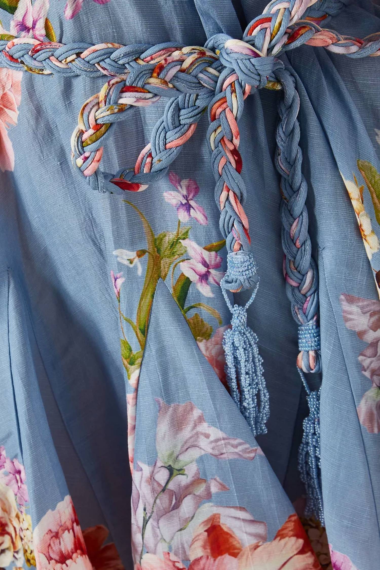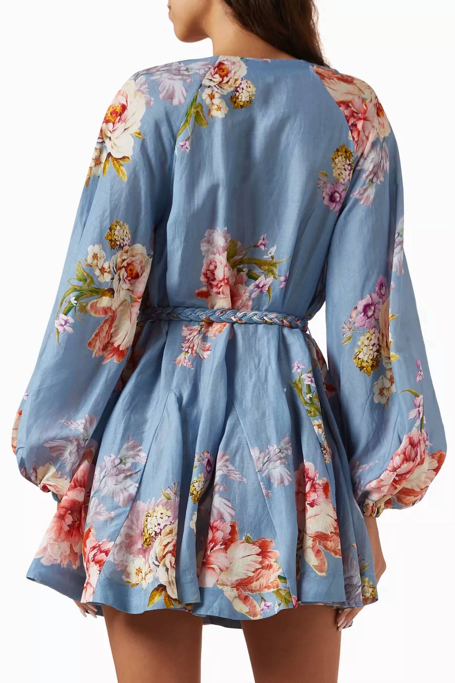 The perfect mini dress for those warmer months. Step into effortless style with the Short Dress With Braided Belt by Hemant & Nandita, a charming piece in a vibrant Pink Blue Mix. This floral mini dress features long sleeves and a flattering V-neck, creating an elegant A-line silhouette. Crafted from a breathable viscose blend with organza and linen, it features a braided belt for added style. Perfect for your next vacation or 4th of July celebration.