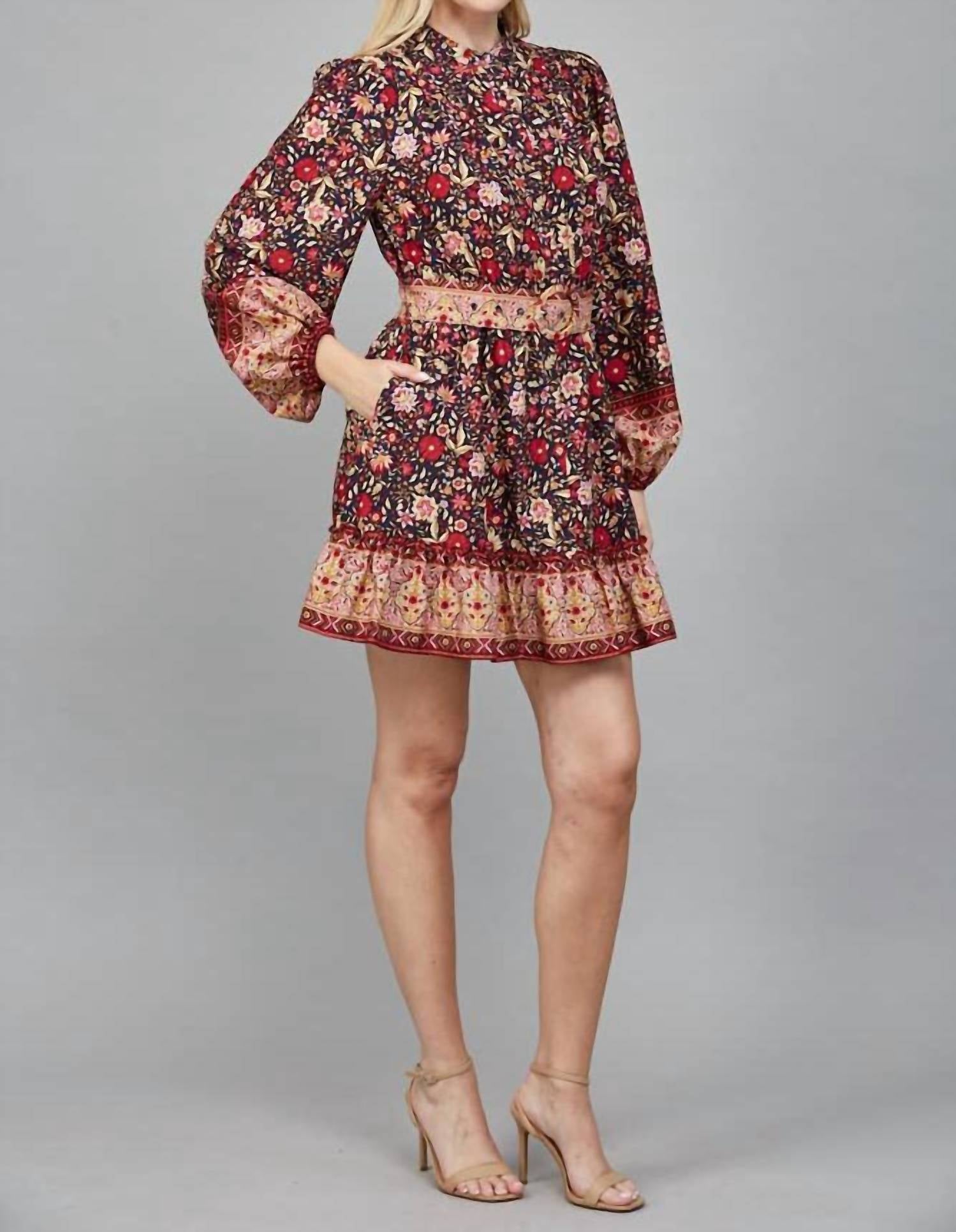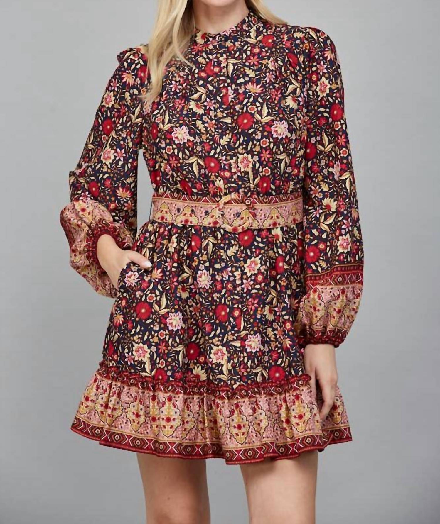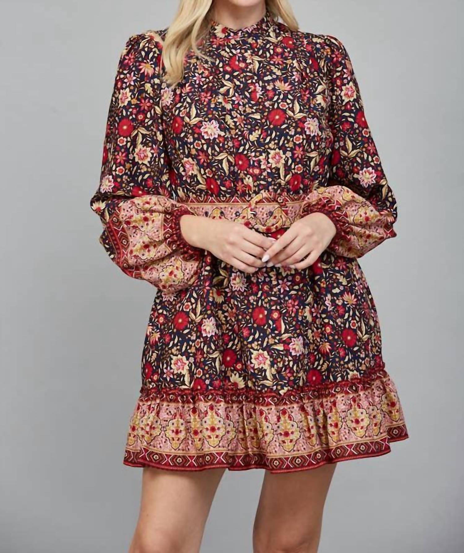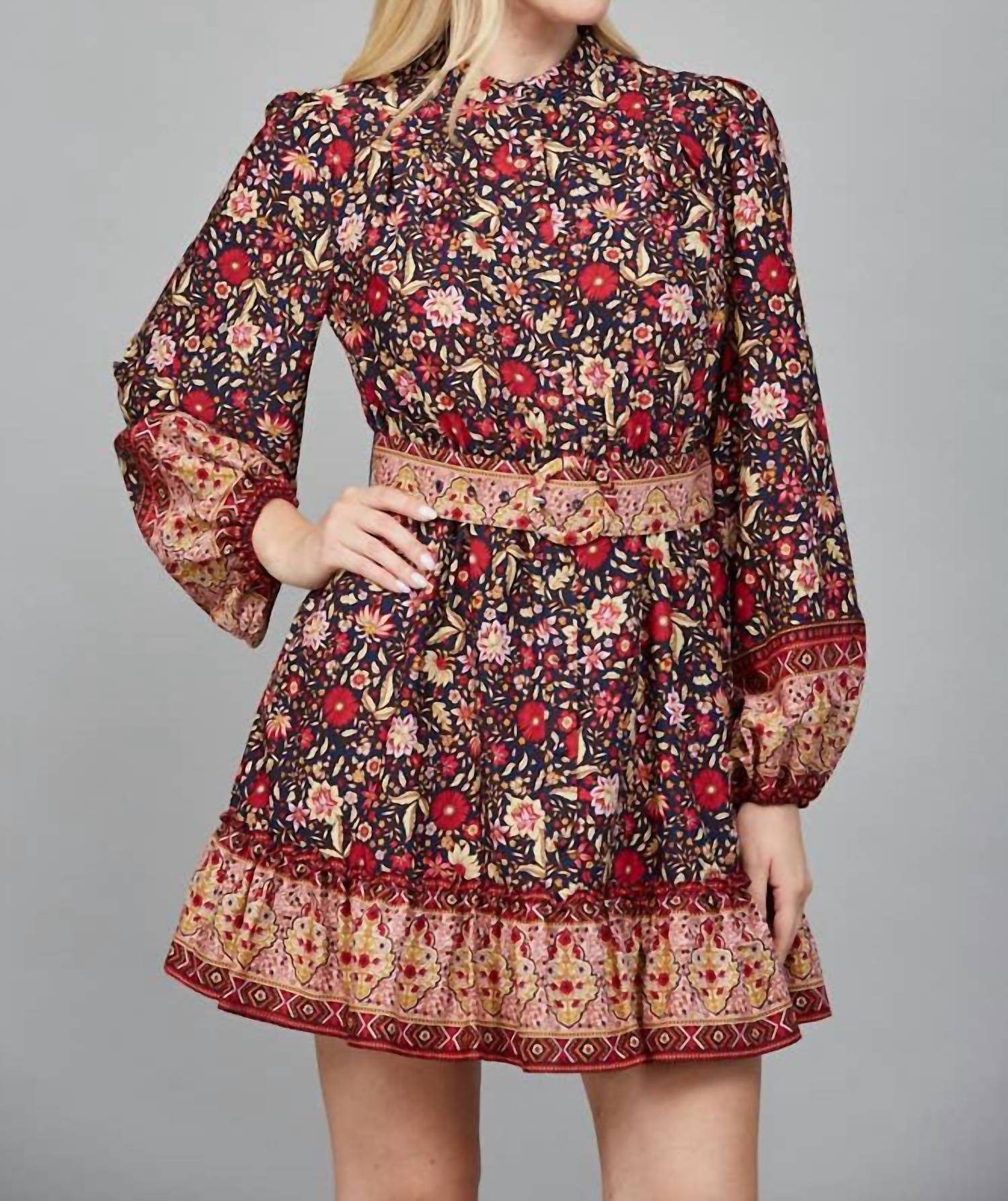 A short and breezy dress for those warmer days. Embrace effortless chic with the Floral Smocked Waist Mini Dress from Fate, perfect for your holiday parties. This navy multi A-line dress features long blouson sleeves with elastic cuffs, complemented by a high neckline and a playful tiered ruffle hem with a contrasting border print. The polyester fabric ensures a flowy silhouette, while the smocked waist offers a comfortable and flattering fit, complete with a button closure and handy pockets. Care instructions: Hand wash, line dry.