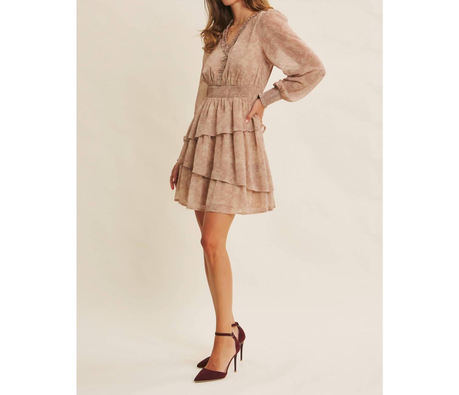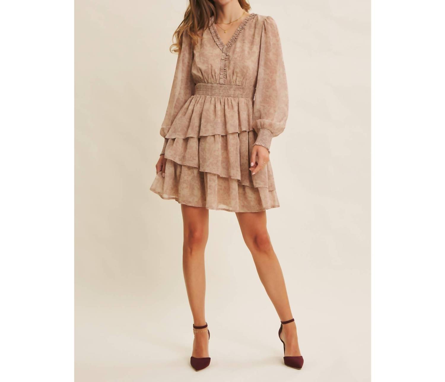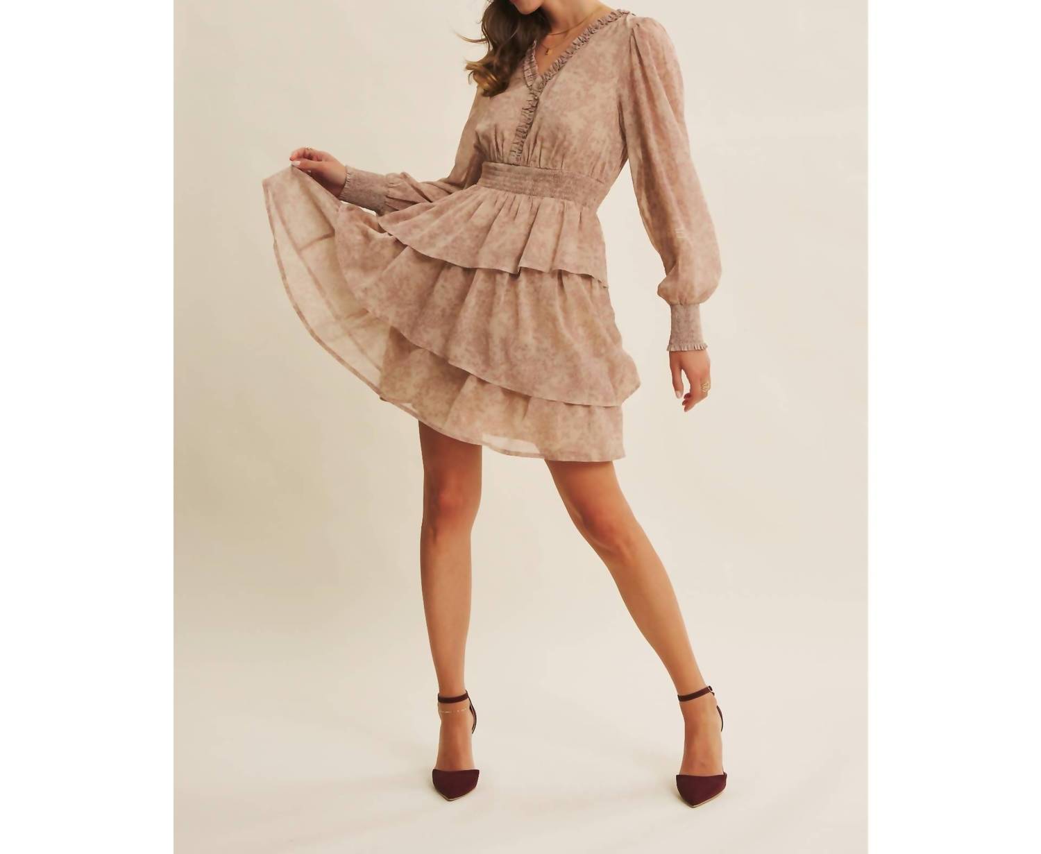 A short and breezy dress for those warmer days. Embrace the vintage charm of the Floral Tiered Ruffle Mini Dress by In February, ideal for those seeking a maximalist style. This dress features elegant long balloon sleeves and a ruffled v-neckline, exuding femininity with its smocked waist and cuffs. Crafted from 100% polyester, the dress showcases an asymmetrical tiered skirt and is fully lined for comfort. Closure: Pull on. Perfect for spring vacations or romantic evenings, it highlights a delicate floral pattern in Brown Wine. Model is 5’9.5" and wearing a size small.