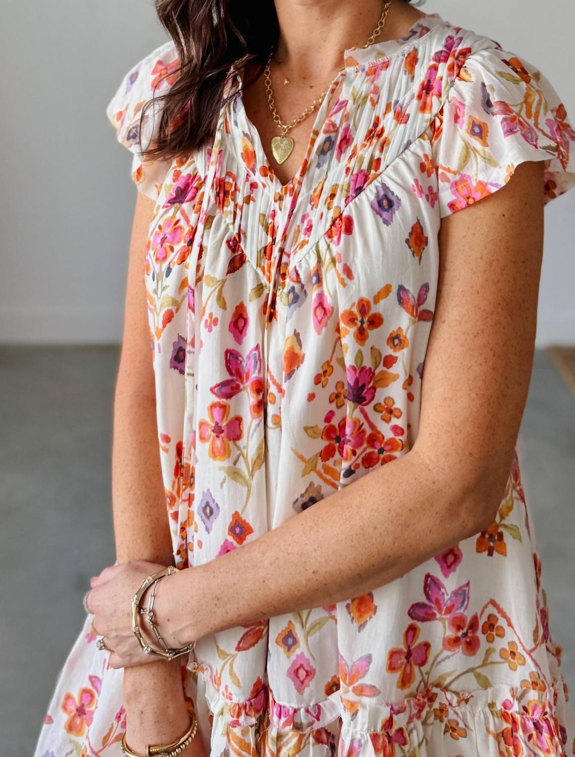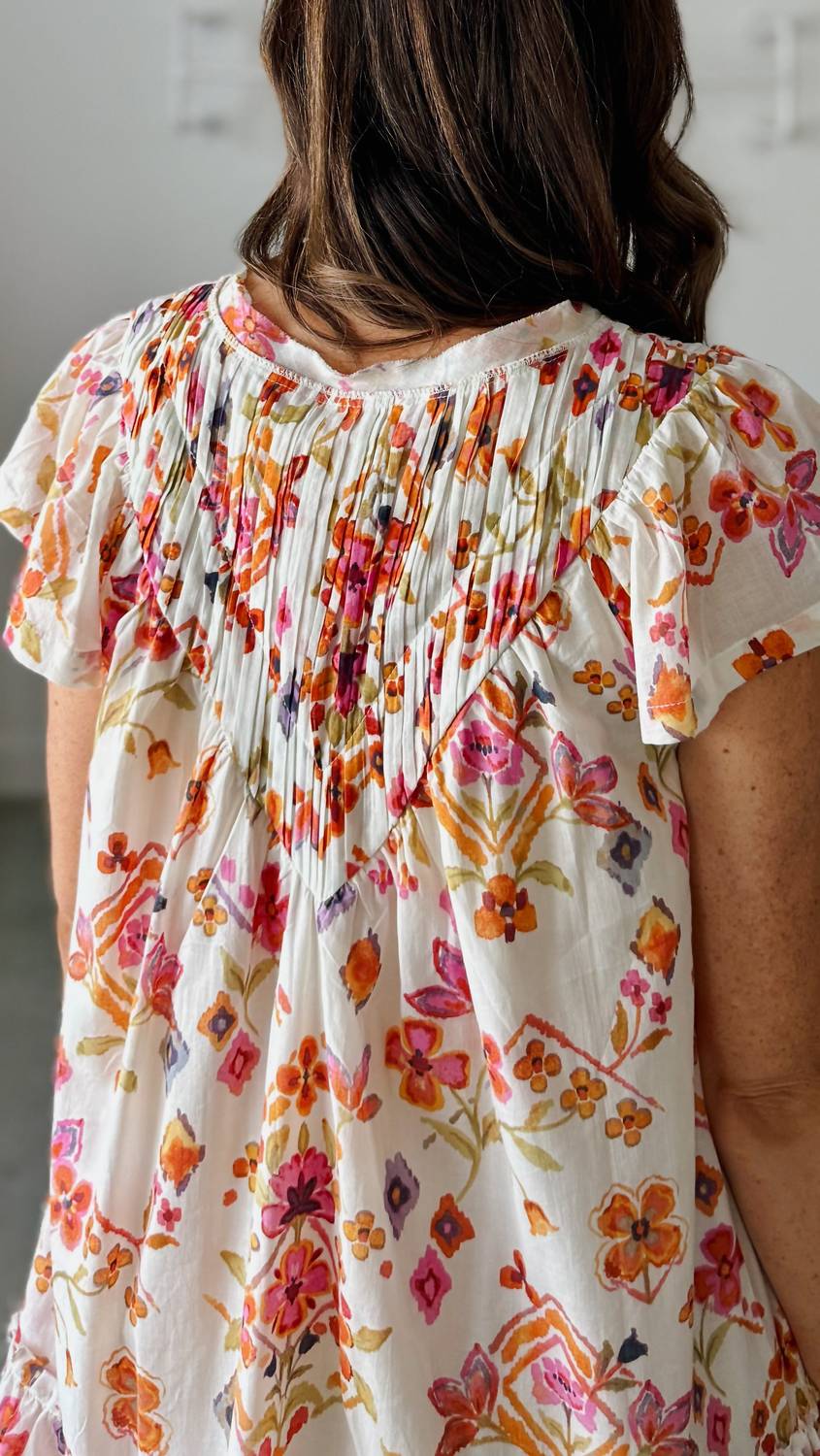 The kind of easy and flattering dress you'll be reaching for all season long. Welcome the Spring Days Pintuck Mini Dress by Fate into your wardrobe, a delightful cream multi floral piece perfect for Easter and vacation occasions. This mini dress showcases short flutter sleeves, a V-neckline, and a unique pintuck detail yoke for added flair. Made from 100% cotton, it features a neck tie closure, raw cut seam details, and a tiered hemline with ruffle accents. Care for this lightweight, lined dress by hand washing cold and laying it flat to dry.