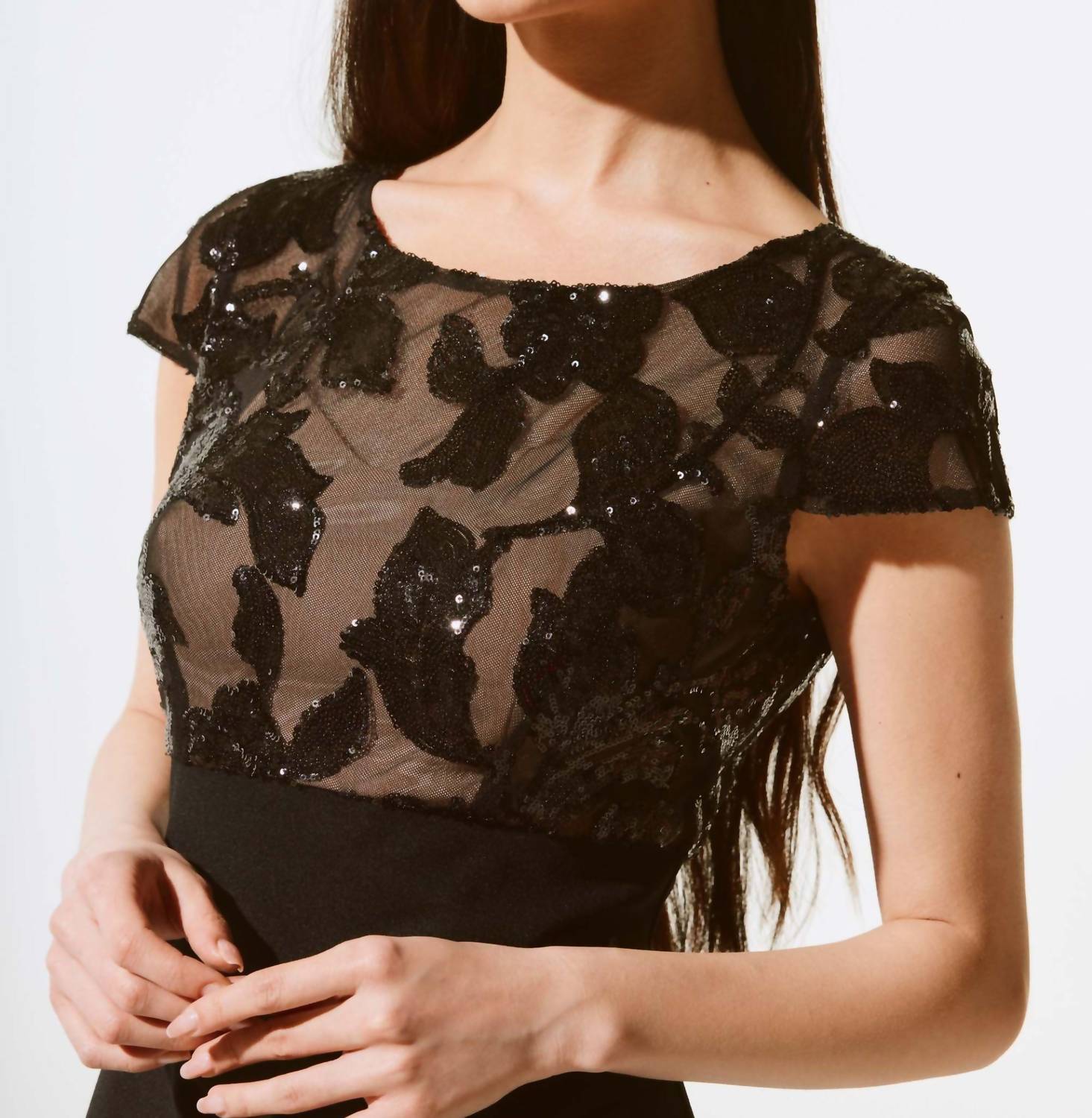 The perfect mini dress for those warmer months. Elevate your wardrobe with the Joseph Ribkoff Floral Sequined Mesh Cap Sleeve Sheath Dress in elegant black. This dress boasts cap sleeves and a knee-length hem, featuring a sophisticated floral-sequined mesh top paired with a silky knit skirt. Crafted from 95% Polyester and 5% Spandex, it ensures a comfortable fit. Made in Canada, it closes with a secure back zipper. Maintenance is a breeze with hand washing in cold water and laying flat to dry.