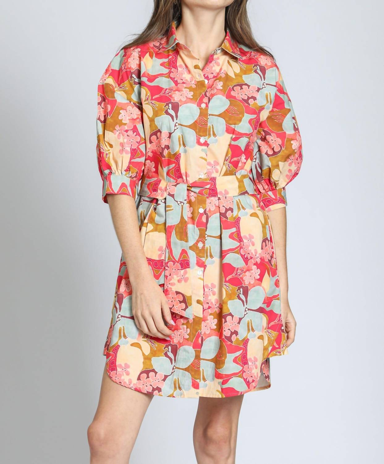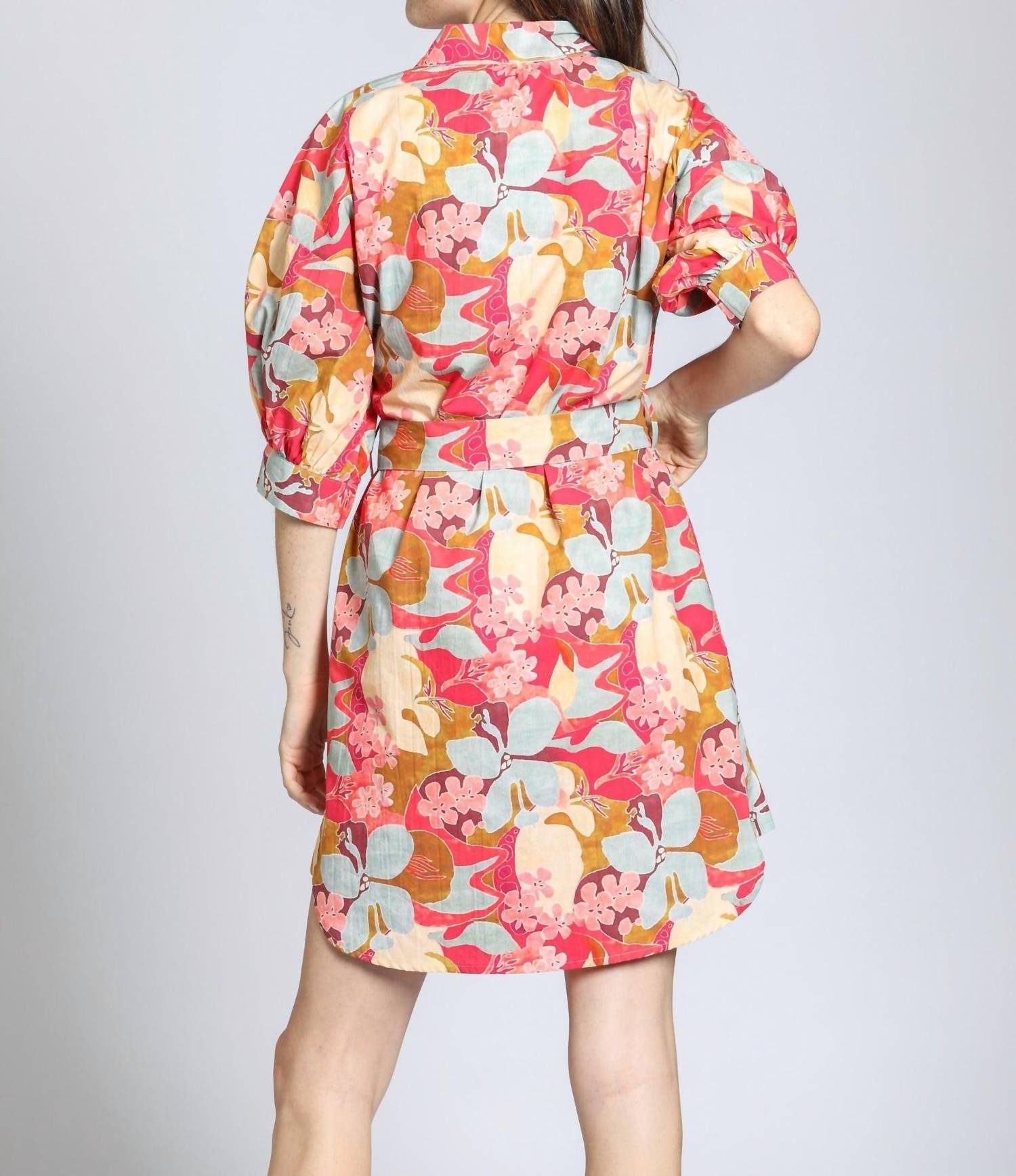 The perfect mini dress for those warmer months. Elevate your spring wardrobe, showcasing an enchanting Garden Party print. Featuring 3/4 puff sleeves. Made from 100% cotton. Offers a flattering fit with its shirt silhouette and button closure. Adjustable fabric belt accentuates the waist, while the vibrant floral design adds a playful touch. Care for this beautiful piece by machine washing it cold and simply hang to dry. Model is 5'9" and wears a size small, with the dress hitting above the knee for a charming look.