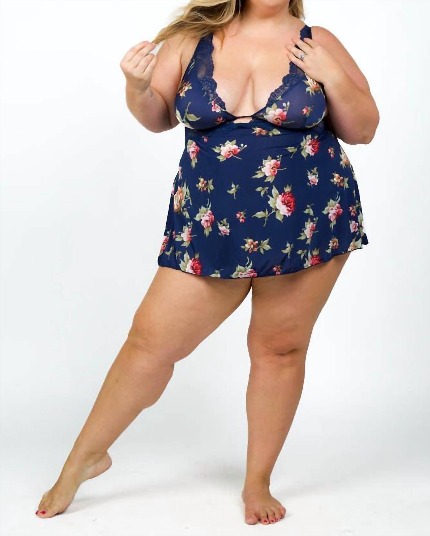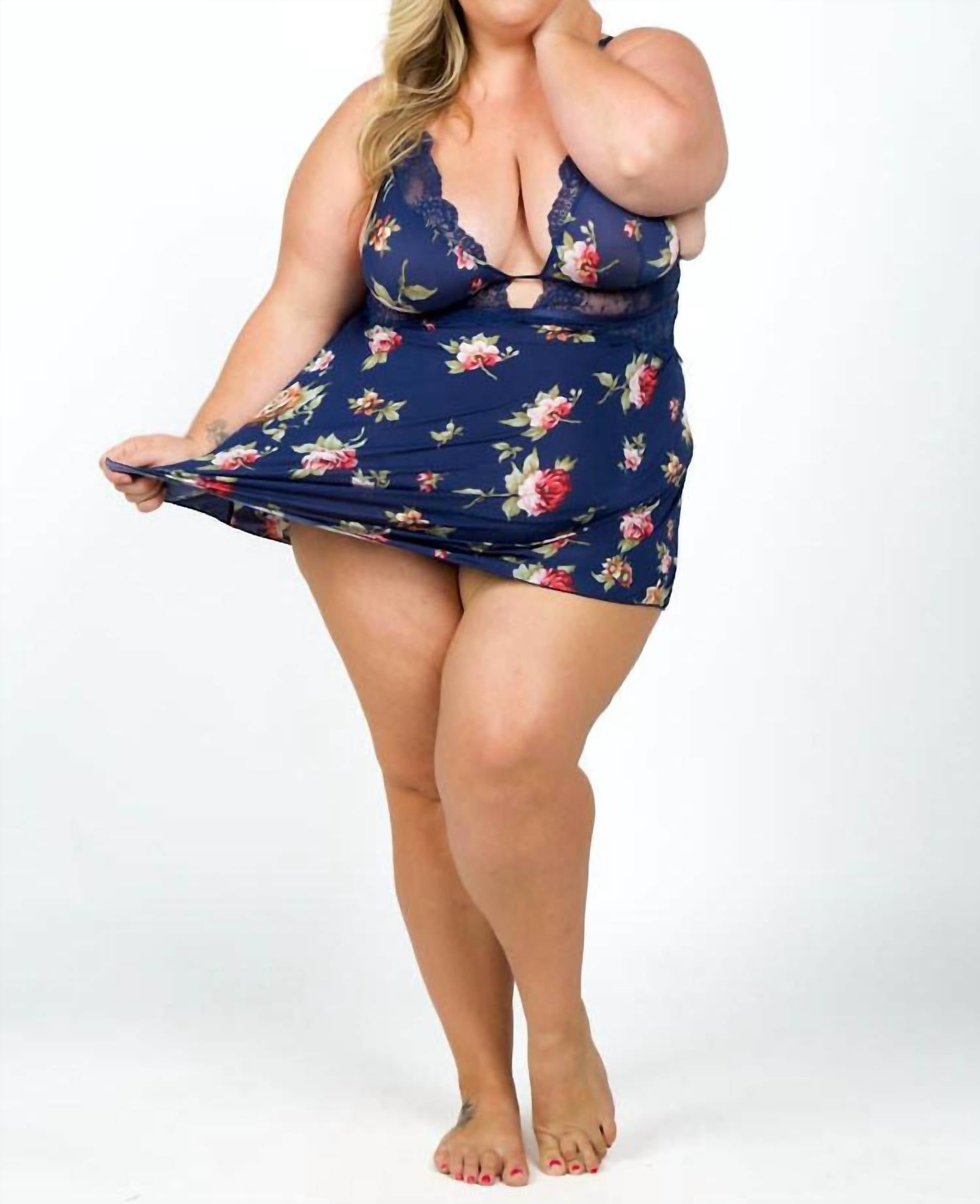 The kind of easy and flattering dress you'll be reaching for all season long. Introducing the Naeva & Lace Babydoll Dress by Oh La La Cheri, a captivating sleeveless piece adorned with a blue floral pattern. This bodycon mini dress is crafted from soft microfiber and features exquisite wide scalloped lace detailing, complemented by a stylish scoopneck. With seductive adjustable cross-over back straps and a convenient tie closure, it’s perfect for a boho chic beach day. Designed for women in plus sizes, this dress seamlessly blends sensuality and femininity.