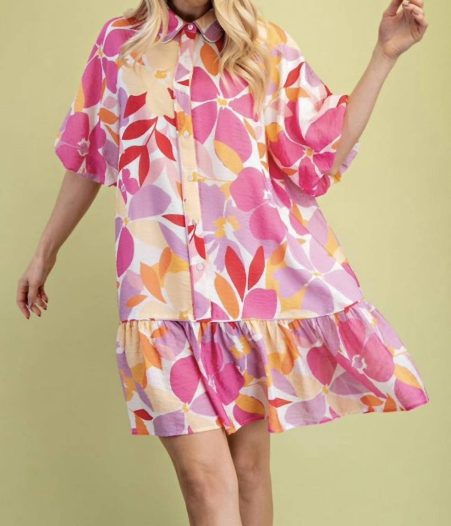 The perfect mini dress for those warmer months. The Sunset Petals Mini Dress by GiGiO is your go-to choice for summer with its playful boho chic style. Designed with short puff sleeves, this A-line mini dress is crafted from lightweight, breathable materials featuring a vibrant floral pattern. The dress features a button closure and a charming collared neckline with a tiered ruffle hem for added flair. Perfect for beach vacations, brunches, or any warm-weather adventures.