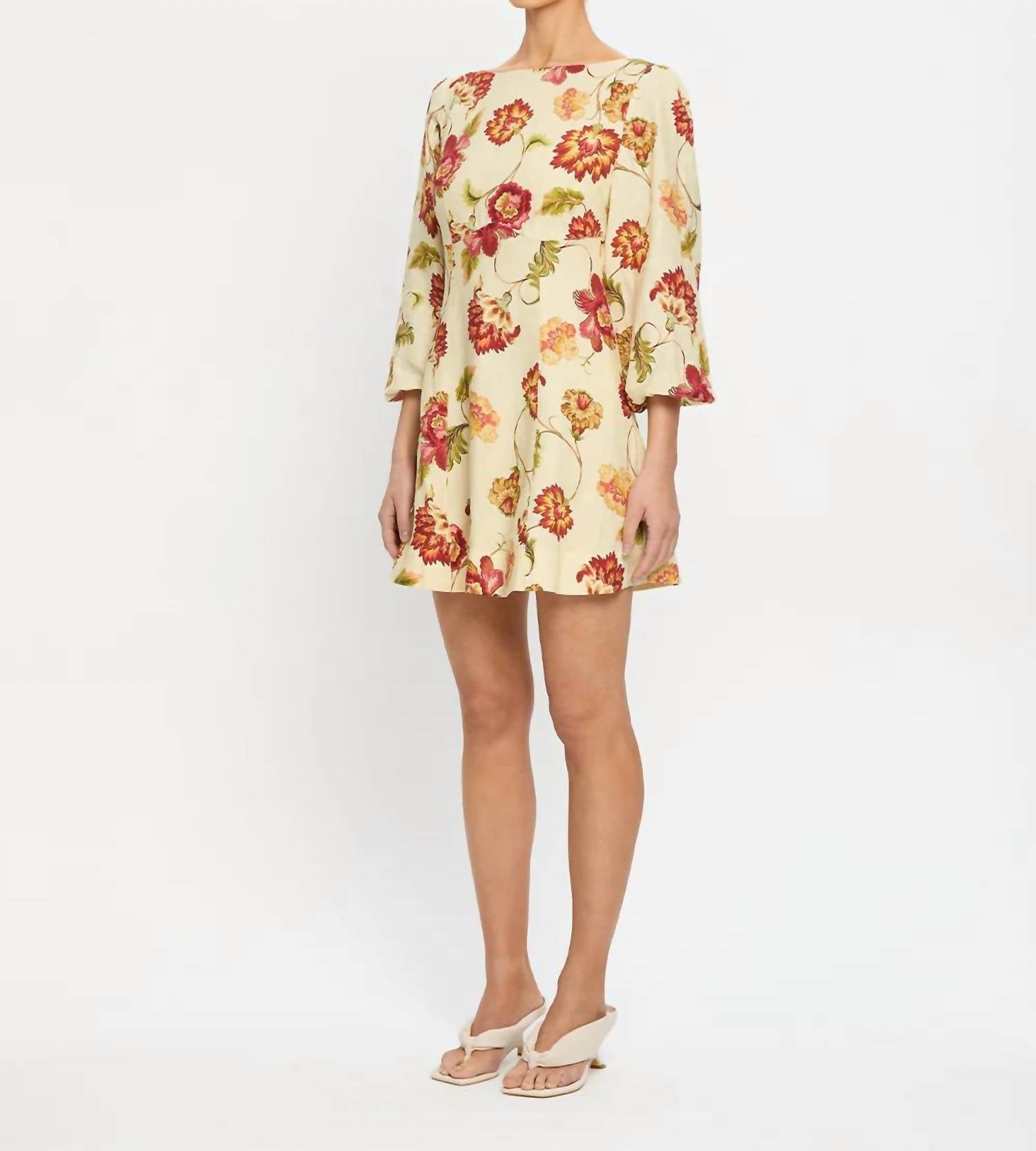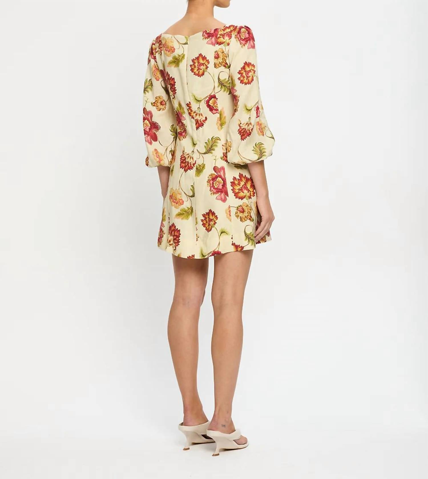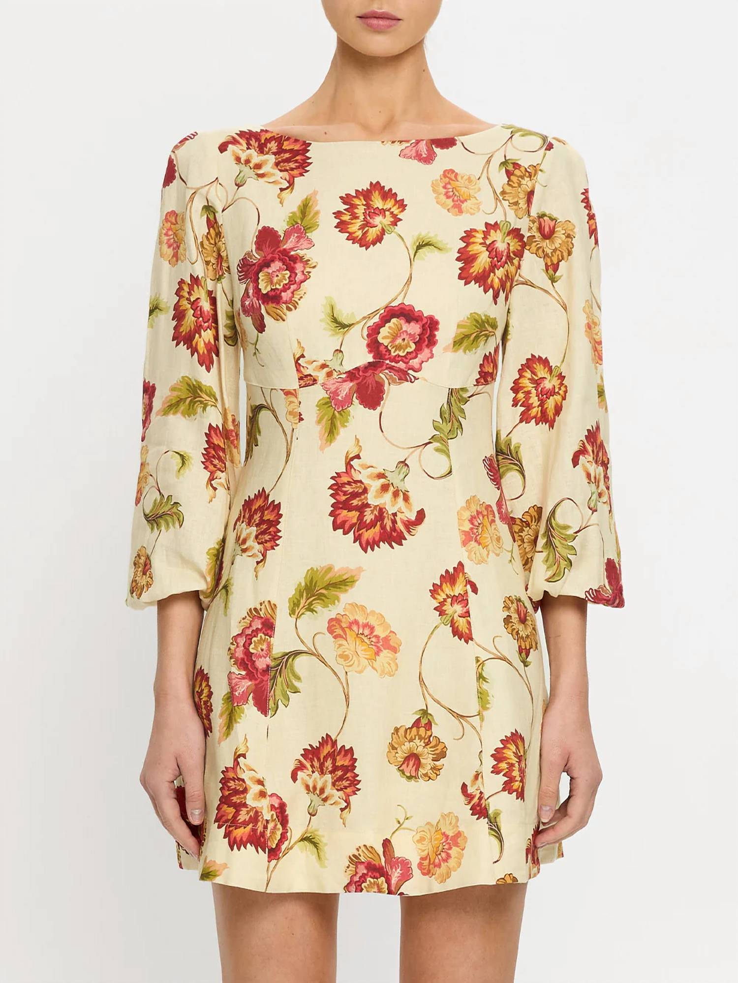 The kind of easy and flattering dress you'll be reaching for all season long. Stunning choice for your spring holiday parties. Sheath dress features three-quarter blouson sleeves with elasticated cuffs. Crafted from 100% linen. Showcasing warm red and orange vine florals on a soft yellow base. Designed with a flattering boat neckline and curved under bust seam detailing, offers a fit and flare silhouette with a back zip closure. To maintain its beauty, cool hand wash separately with mild detergent, do not bleach, dry clean, or tumble dry, and line dry in the shade with a cool iron on the reverse side. The studio model wears a size 8 and stands 178cm tall.