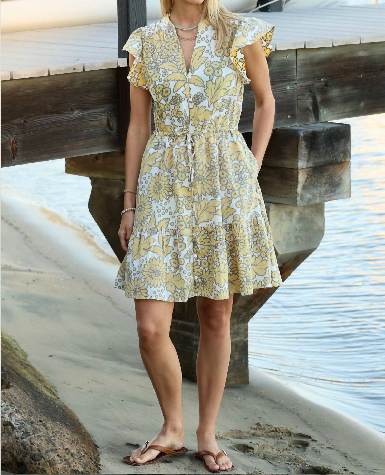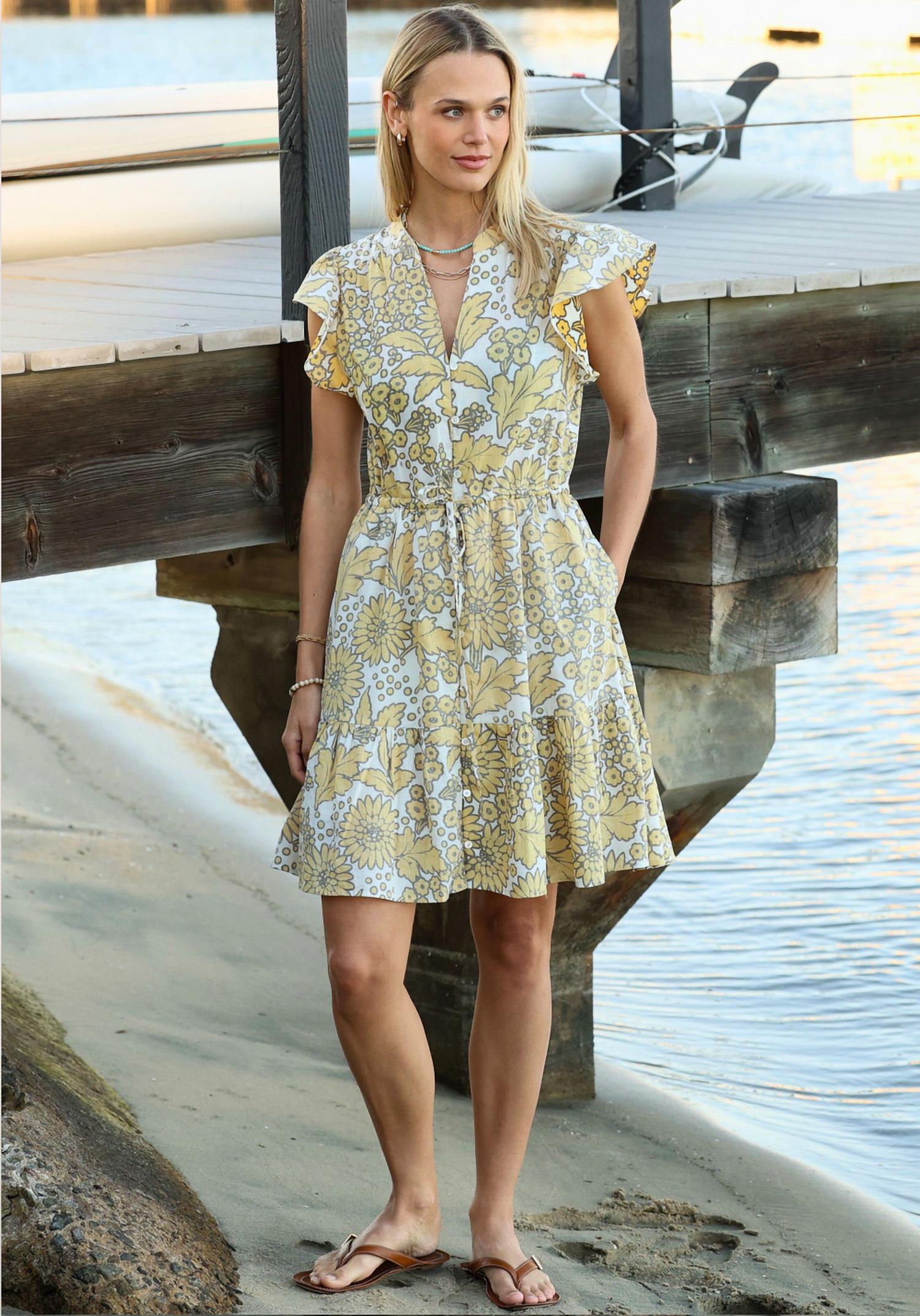A short and breezy dress for those warmer days. The Gia Dress by Dylan offers a refreshing touch of summer with its sunflower floral design. This women's mini dress features cap sleeves and a flattering V-neckline, all tailored in soft cotton. The above-the-knee A-line silhouette is accentuated by a shell button front and an adjustable tie waist, complete with pockets for added convenience. Closure: Button closure. Perfect for a boho chic vacation, it’s designed without specific care instructions to provide you with carefree styling.