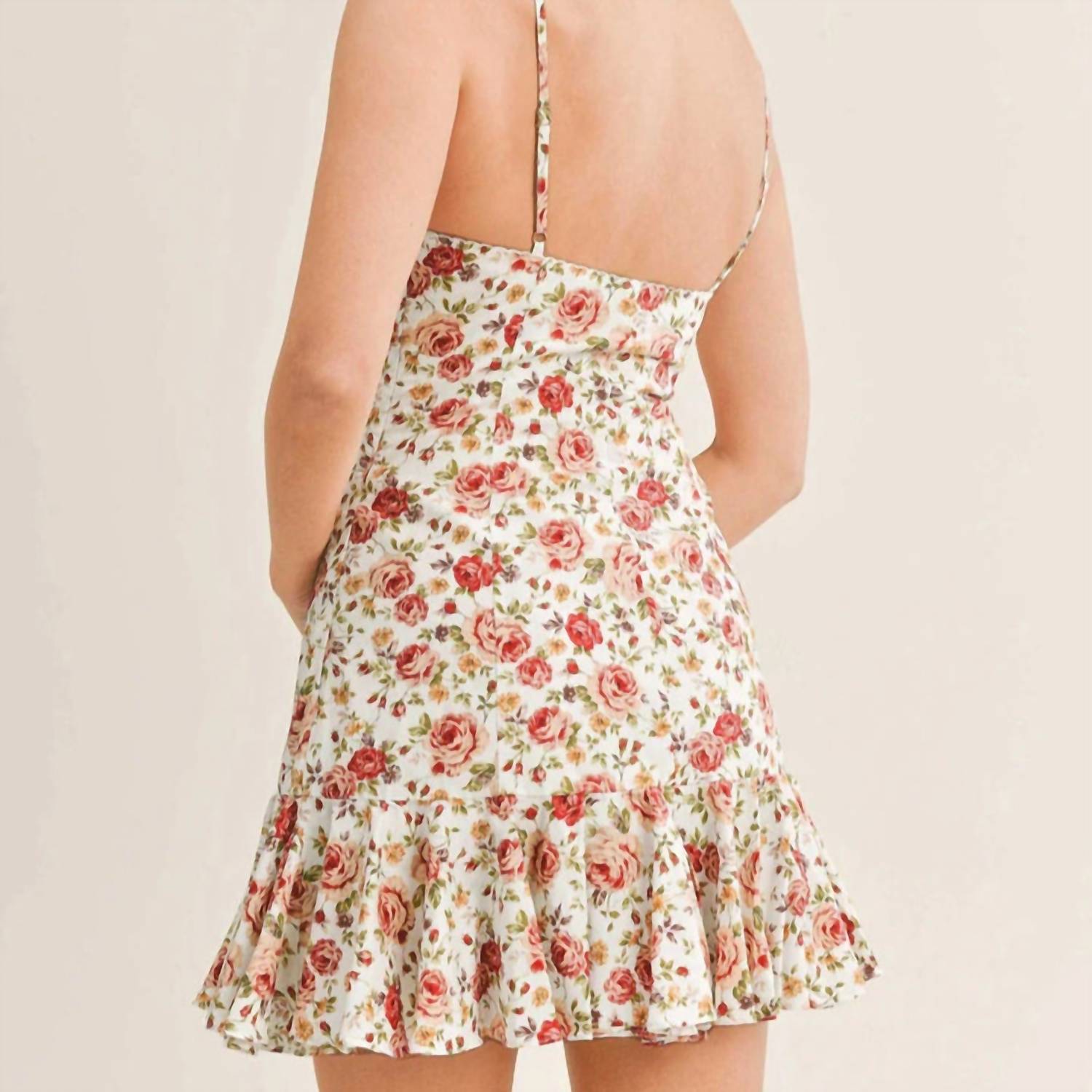 The perfect mini dress for those warmer months. Embrace effortless elegance with the Floral Print Mini Dress by MABLE, designed for a chic, party-ready look. This spaghetti strap dress is crafted from 100% cotton and showcases a timeless floral pattern in vibrant red. It features a charming square neckline, a fit-and-flare silhouette with a ruffle hemline, and an enclosed side zipper for a flattering fit. Perfect for summer, it pairs beautifully with accessories for any holiday gathering. Melissa is 4'10" and wearing a size medium.