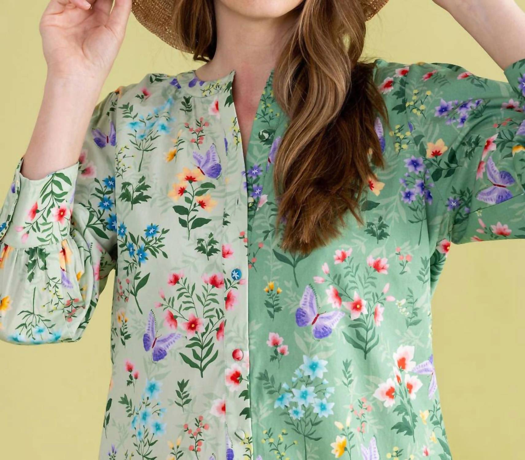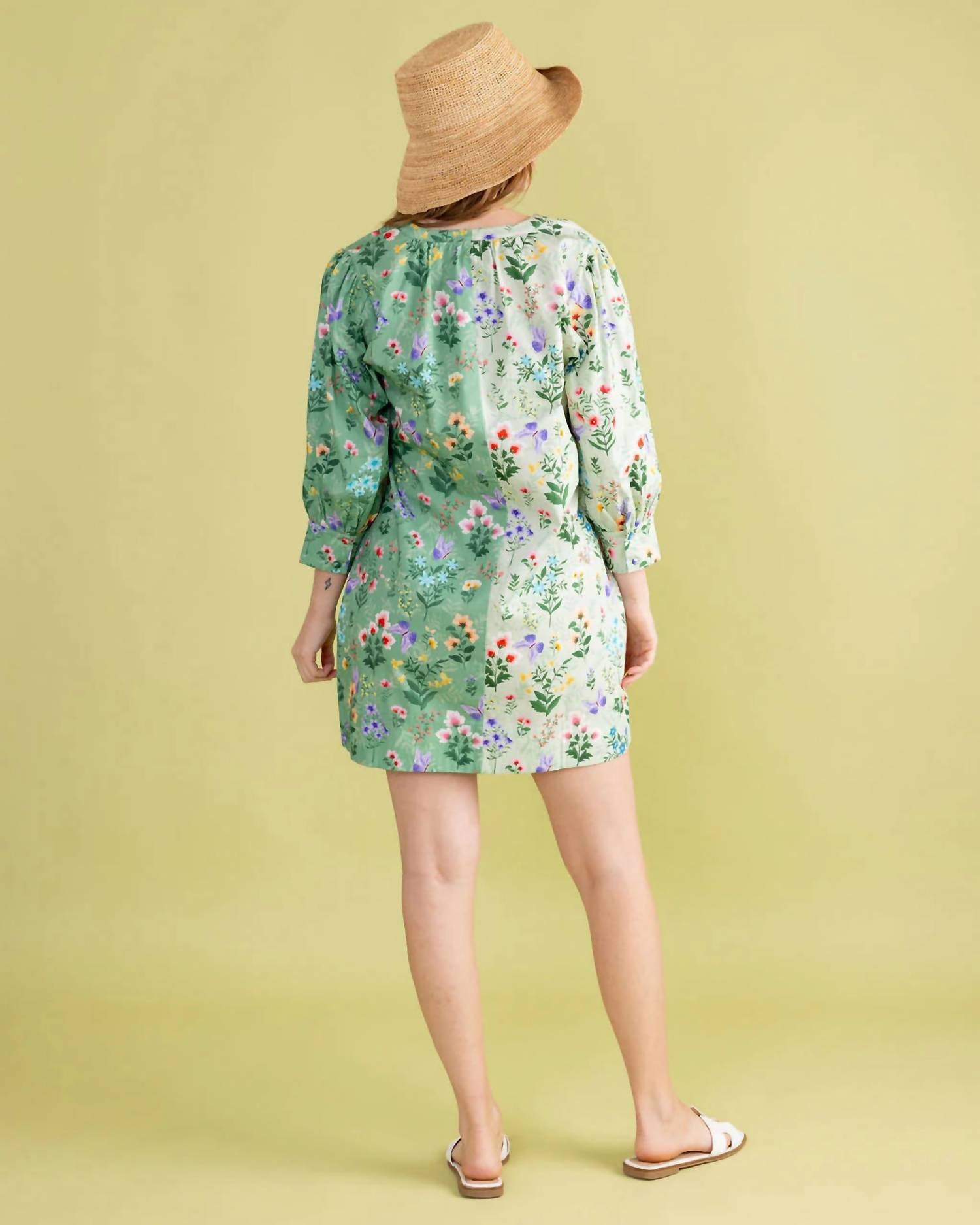 A short and breezy dress for those warmer days. Discover effortless elegance with the Paloma Floral Mini Dress by Double A, perfect for summer vacations or Easter celebrations. This women's dress features long sleeves, a stylish crewneck, and a flattering shift silhouette with a mixed botanical floral pattern. Crafted from 100% cotton poplin, this piece ensures comfortable wear, complete with a button closure for a relaxed fit. Care instructions recommend machine washing and laying flat to dry. Model is wearing a size small.
