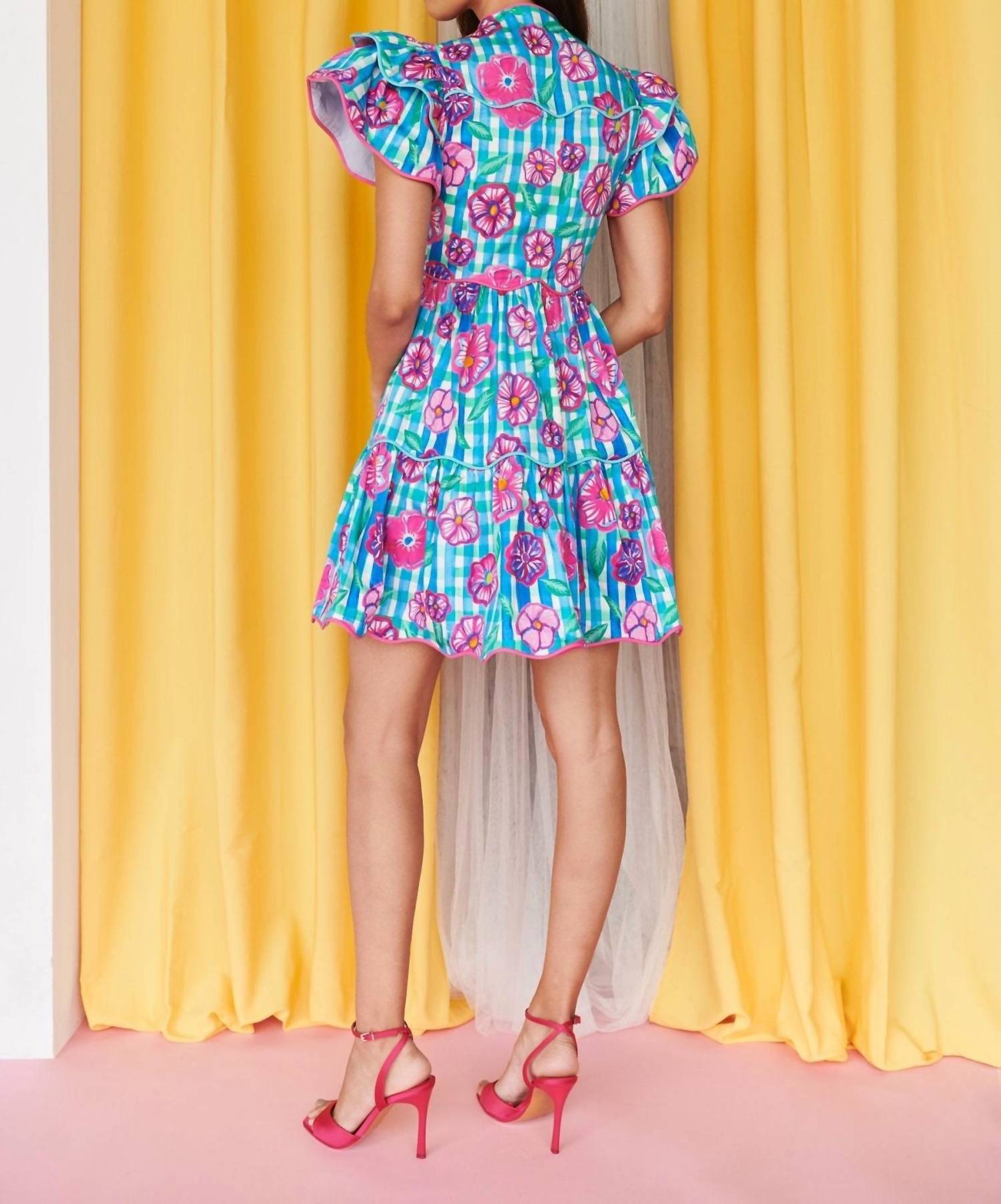 The perfect mini dress for those warmer months. Enhance your wardrobe with the Baba Voyager Short Dress by CELiA B, crafted in a vibrant floral and gingham print. This blue multi mini dress features charming short sleeves with ruffles and a classic collared neckline. Made from a comfortable cotton blend, it includes a front button closure and a waist tie for a flattering fit. Care instructions recommend dry cleaning or hand washing separately in cold water and ironing on low to maintain its lively appeal.
