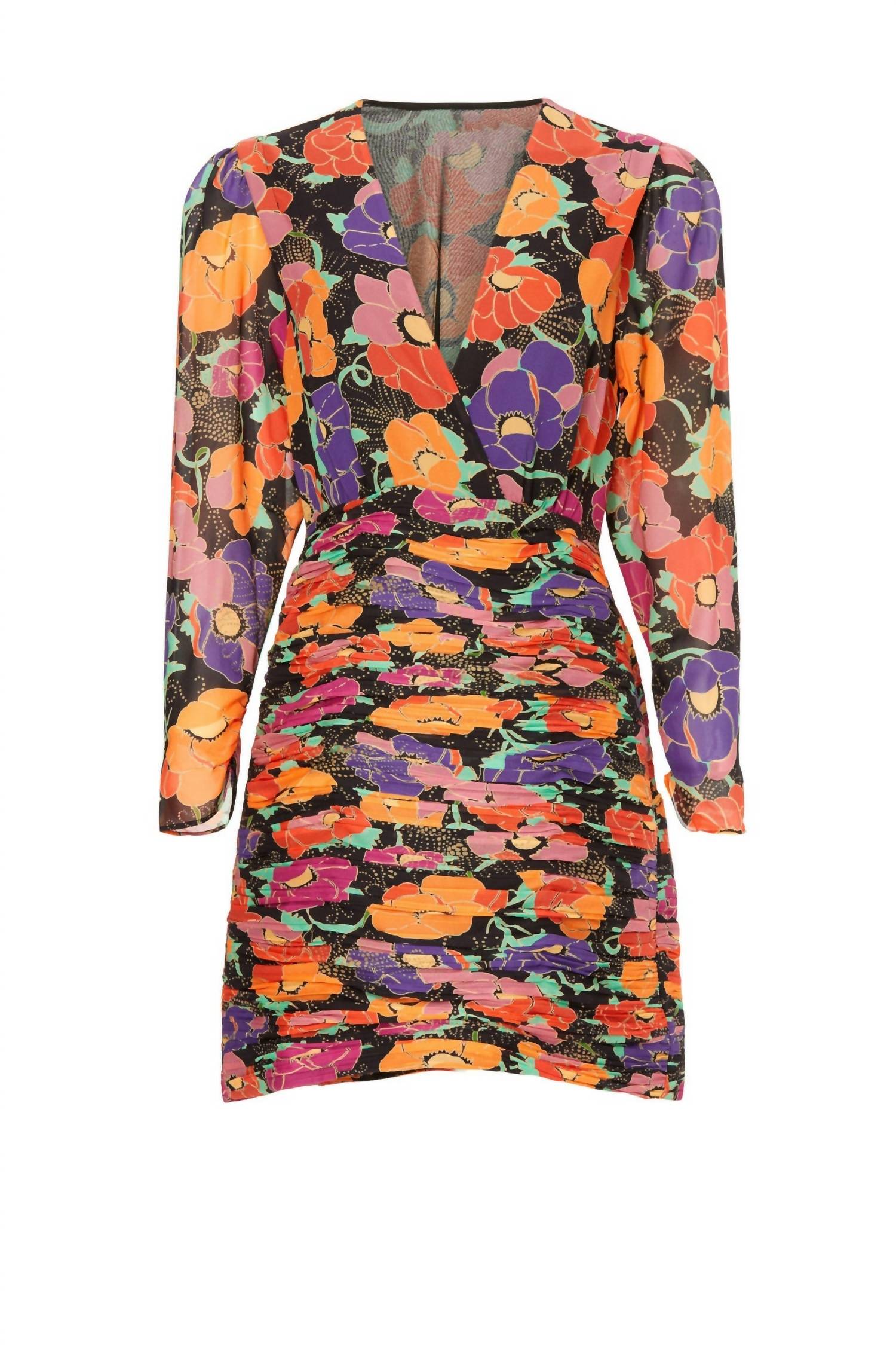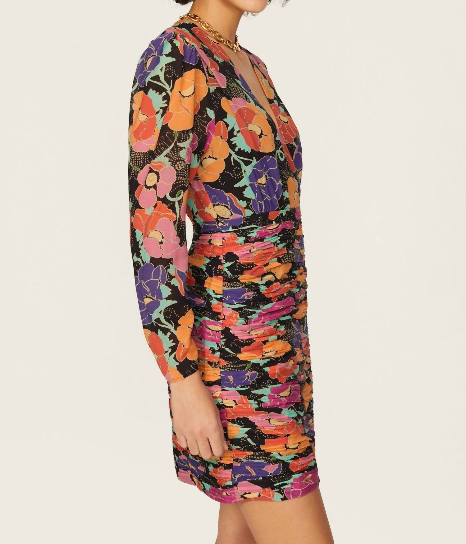 The kind of easy and flattering dress you'll be reaching for all season long. Make a statement at your next evening event with the Golden Floral Dress by RIXO, a striking piece that embraces the maximalist trend. This sheath silhouette mini dress is crafted from 100% viscose crepe de chine, featuring a multicolored floral pattern for a vibrant spring look. It boasts long sleeves and a flattering V-neckline, ensuring both comfort and style. The dress is finished with a convenient side zipper closure and measures 34 inches in length, perfect for a chic, effortless ensemble.