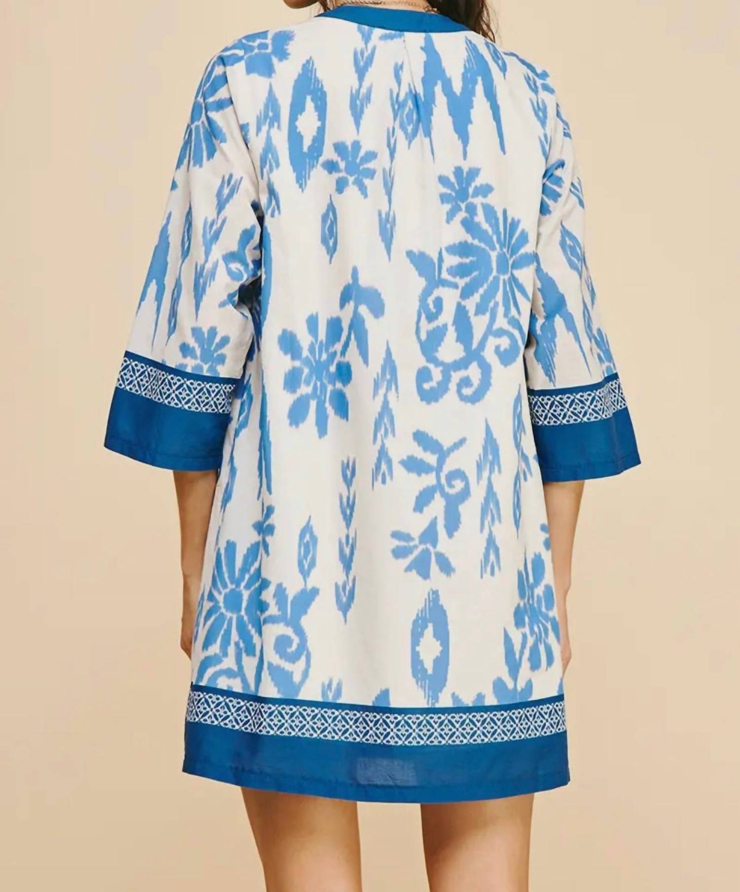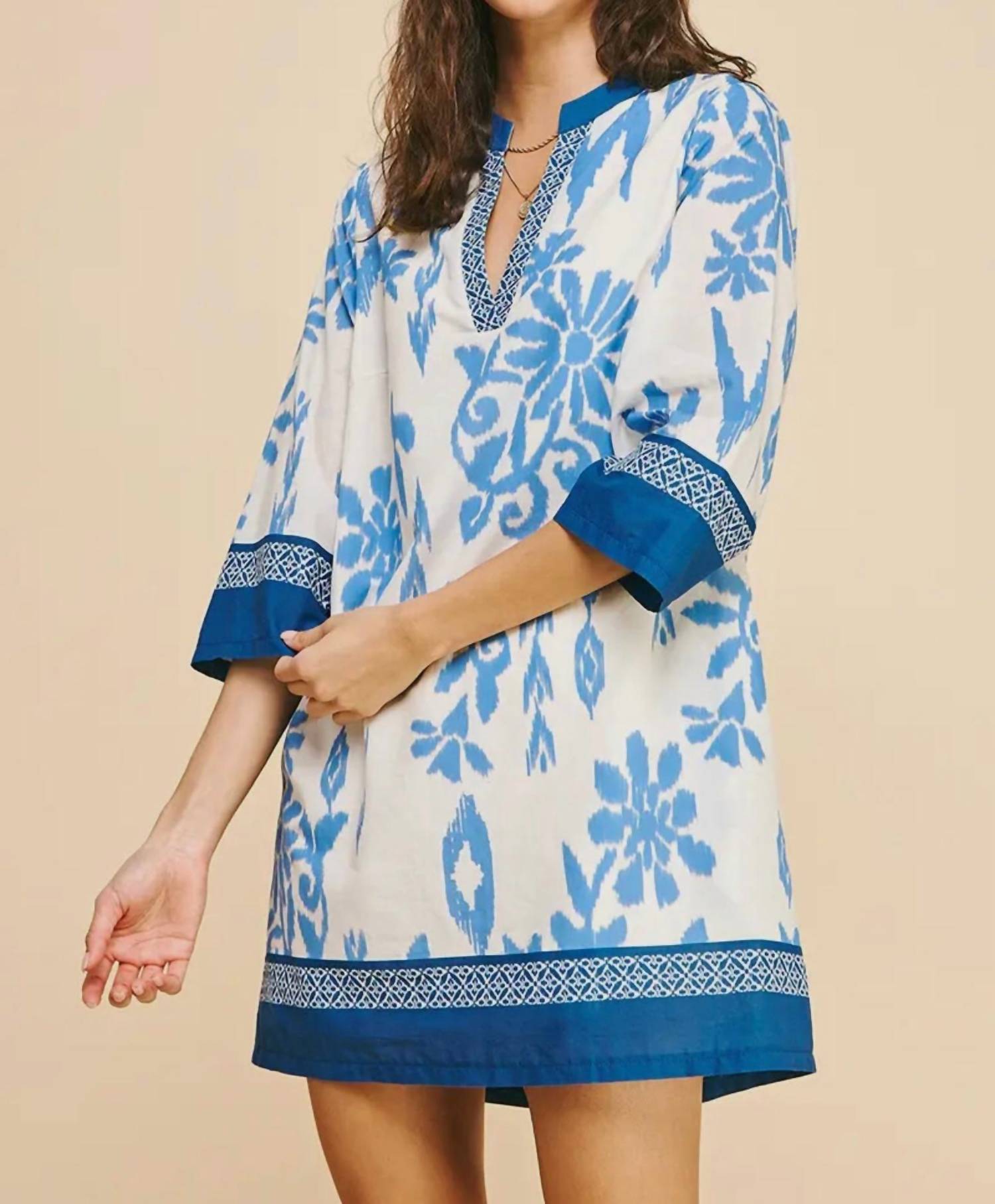 The kind of easy and flattering dress you'll be reaching for all season long. Elevate your wardrobe with the Contrast Floral Print Mini Dress by PINCH, a stunning piece in a Blue Multi pattern. This dress features elegant three-quarter sleeves and a flattering V-neckline, making it ideal for holiday parties or any summer occasion. With a playful shift silhouette, it easily slips on and ensures comfort and style without compromising elegance. Care for this boho chic dress is straightforward with instructions to machine wash and tumble dry.
