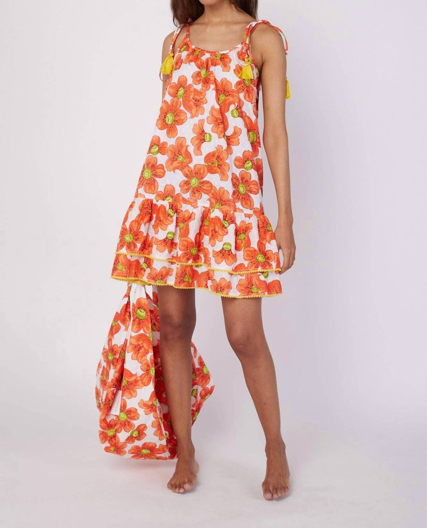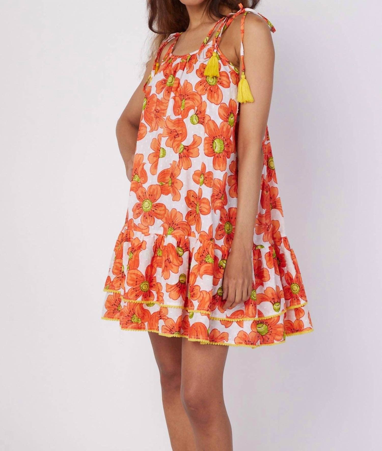A short and breezy dress for those warmer days. Discover the Tonia Resort Spring Summer Dress by MODAPOSA, designed for a perfect blend of sophistication and ease. This sleeveless mini dress is crafted from 100% cotton swiss dot, ensuring all-day comfort in its breathable and soft texture. Featuring a tie closure with adjustable shoulder ties and accented by tassel detail, ruffle skirt, and pom pom trim, it is adorned with a vibrant red poppy floral print. Hailing from India, this A-line silhouette flatters all figures and is machine washable with a recommendation to line dry. Measurements for size M: Bust 40 in (101.6 cm) and Length 32 in (81.28 cm). Model Theodora (5'9", 33" bust, 23" waist, 35" hips) wears a size M.
