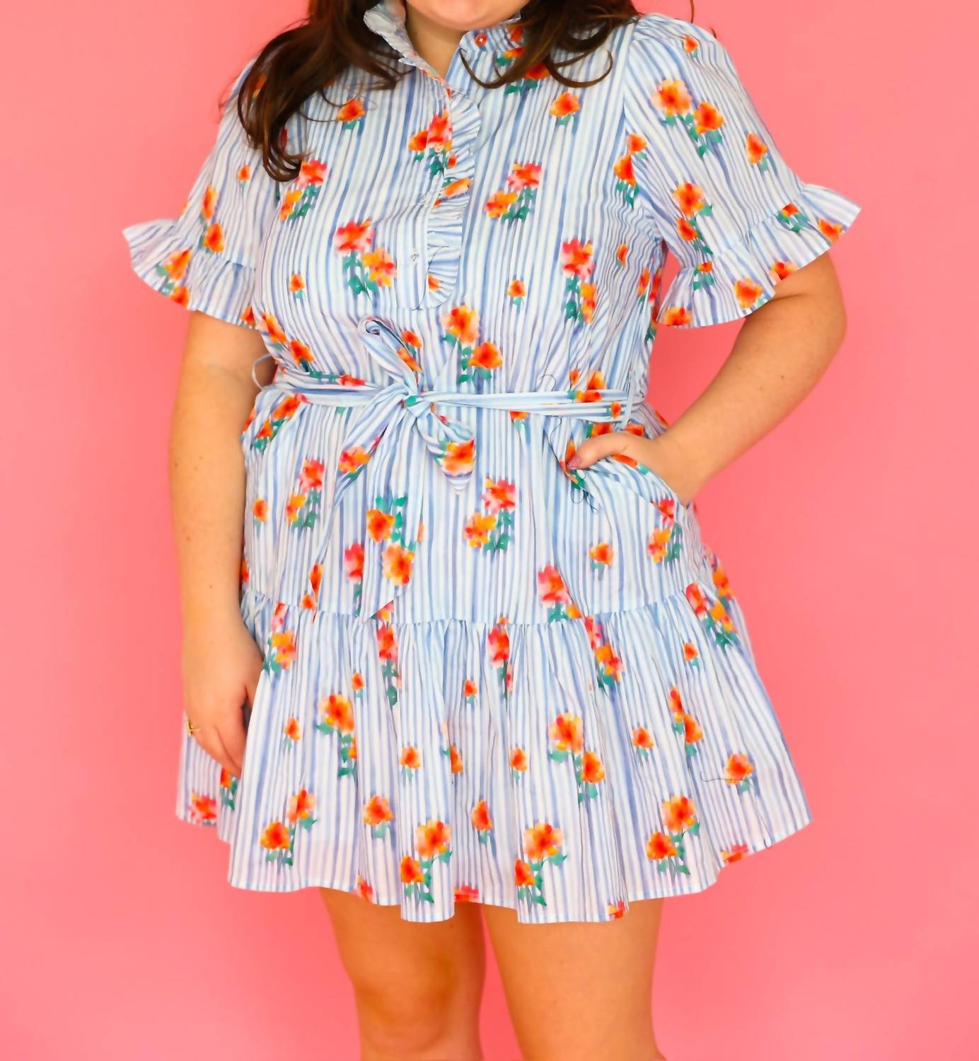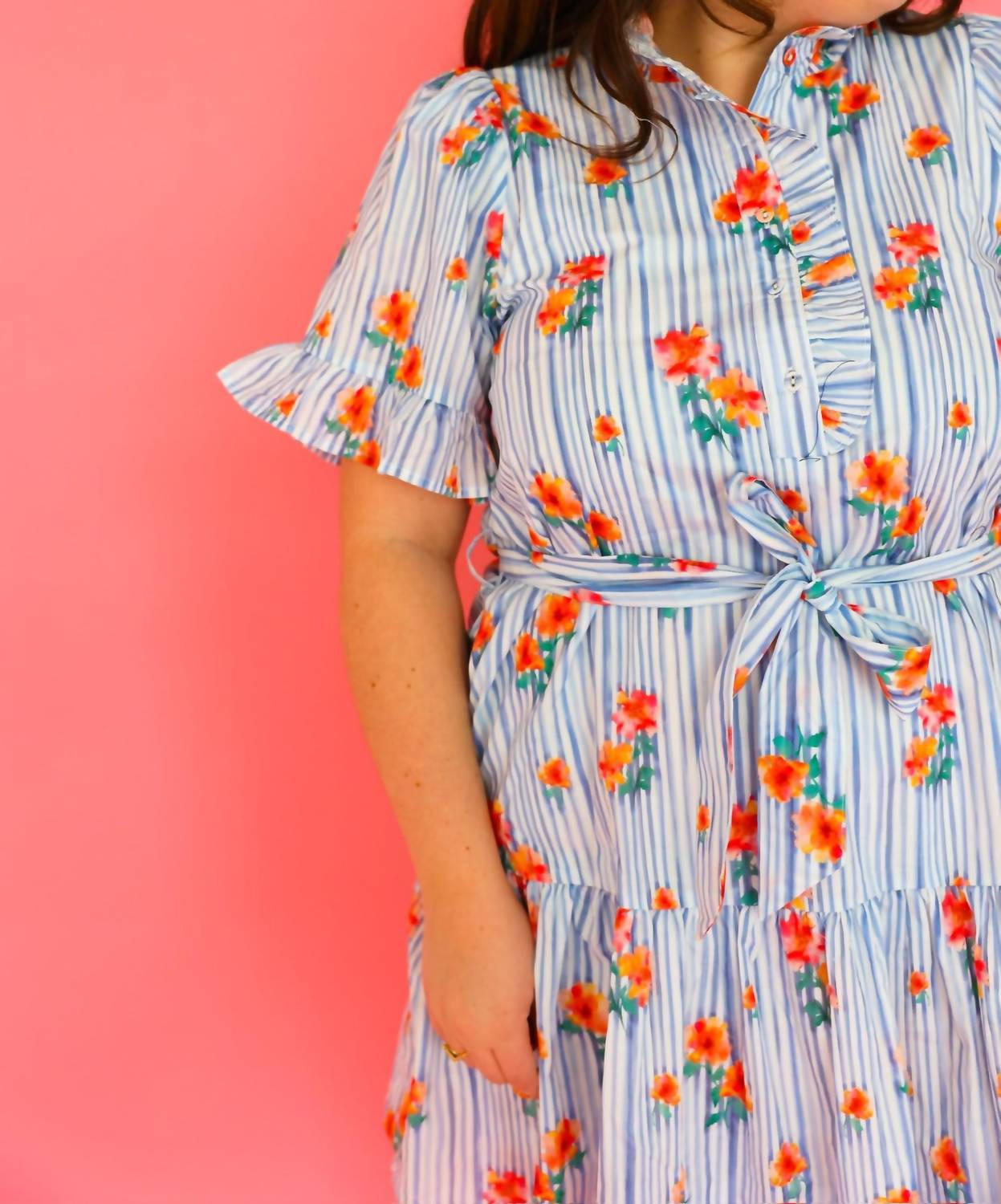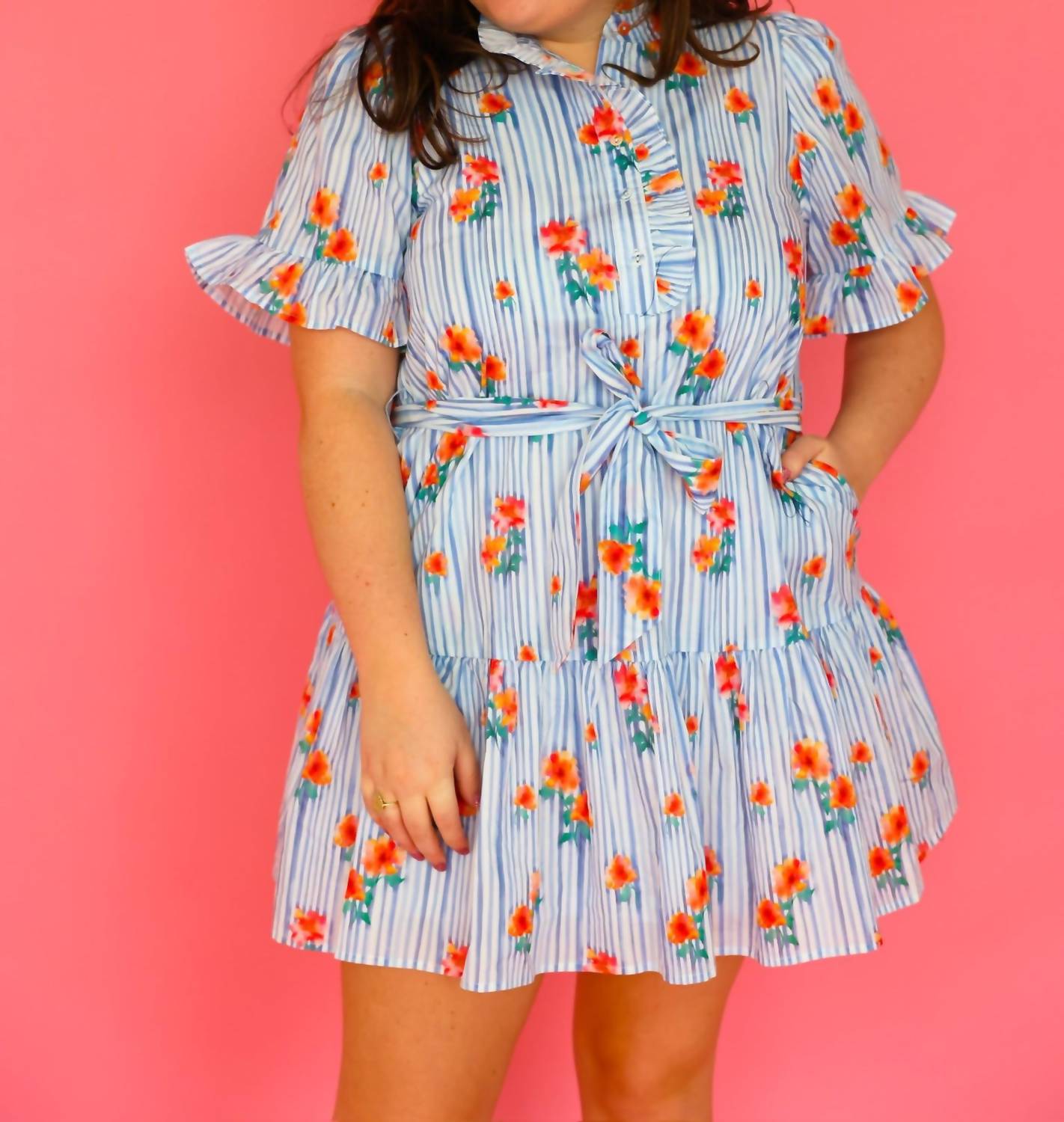 A short and breezy dress for those warmer days. Make an entrance in the Willow Floral Mini Dress by Entro, a feminine piece perfect for any summer occasion. With its short sleeves featuring ruffle details, this dress showcases a vibrant floral pattern and a sophisticated mockneck design. It is crafted with a playful mini shift silhouette and includes functional side pockets for added convenience. Closure is by a half placket, and it comes with an adjustable waist tie, making it effortlessly stylish. Care instructions suggest that it is machine washable, allowing for easy maintenance. Model Mason, who is 5'4" with a 44" bust, 38.5" waist, and 52" hips, is pictured wearing size Large.