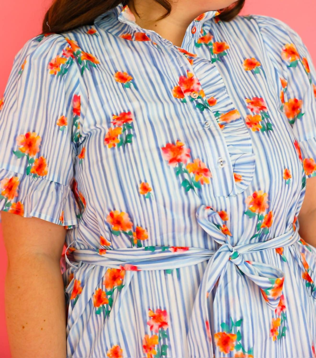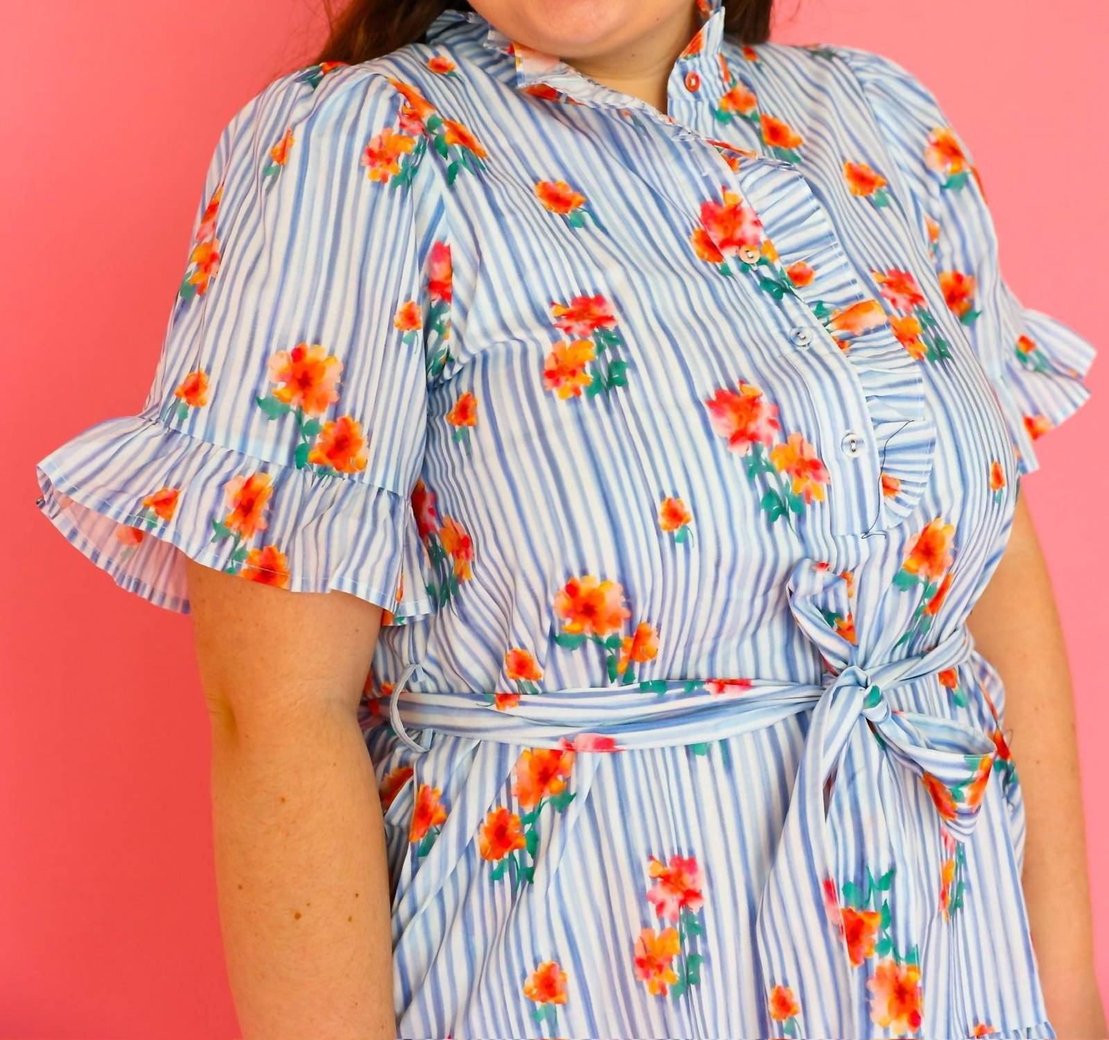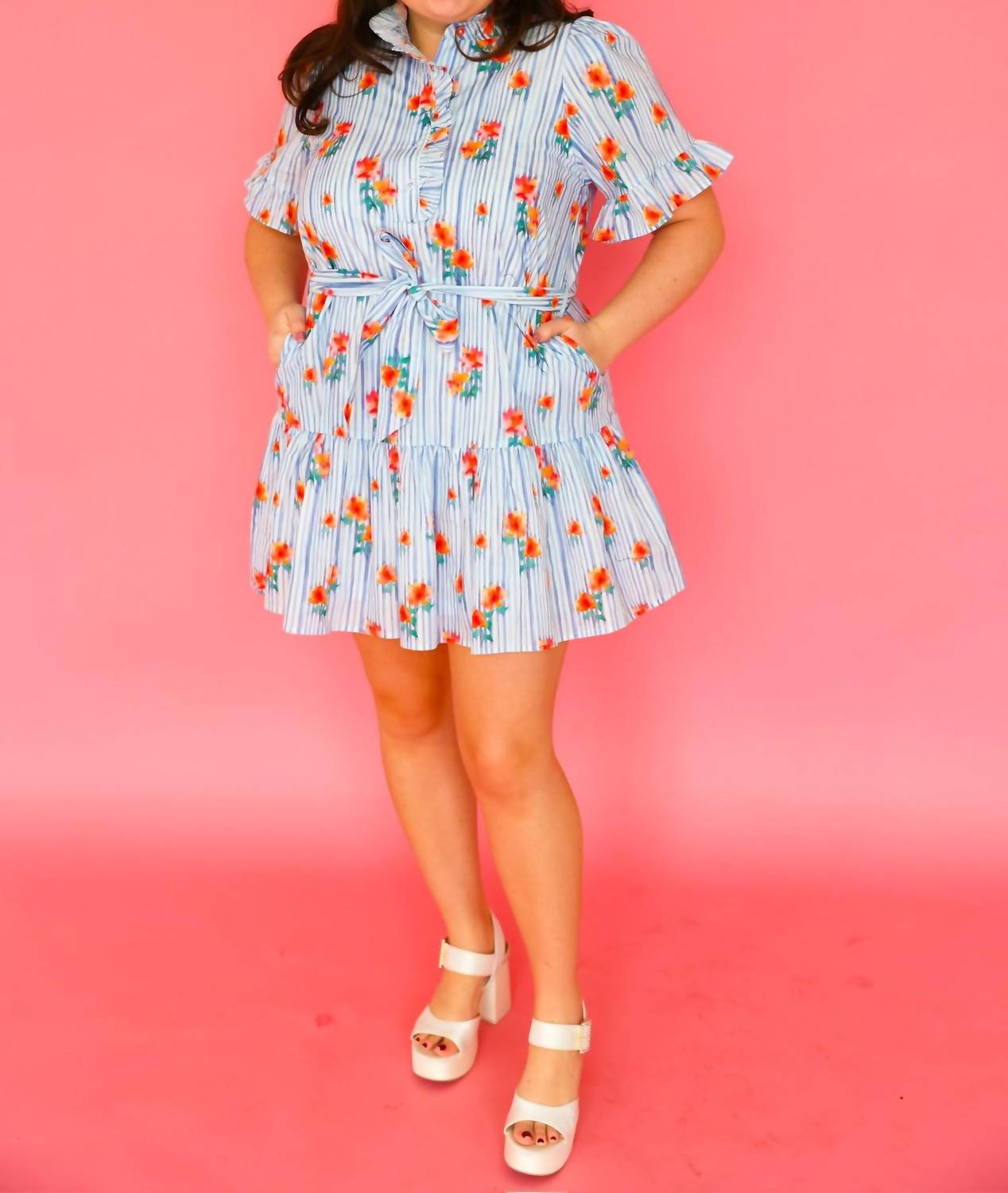 A short and breezy dress for those warmer days. Make an entrance in the Willow Floral Mini Dress by Entro, a feminine piece perfect for any summer occasion. With its short sleeves featuring ruffle details, this dress showcases a vibrant floral pattern and a sophisticated mockneck design. It is crafted with a playful mini shift silhouette and includes functional side pockets for added convenience. Closure is by a half placket, and it comes with an adjustable waist tie, making it effortlessly stylish. Care instructions suggest that it is machine washable, allowing for easy maintenance. Model Mason, who is 5'4" with a 44" bust, 38.5" waist, and 52" hips, is pictured wearing size Large.