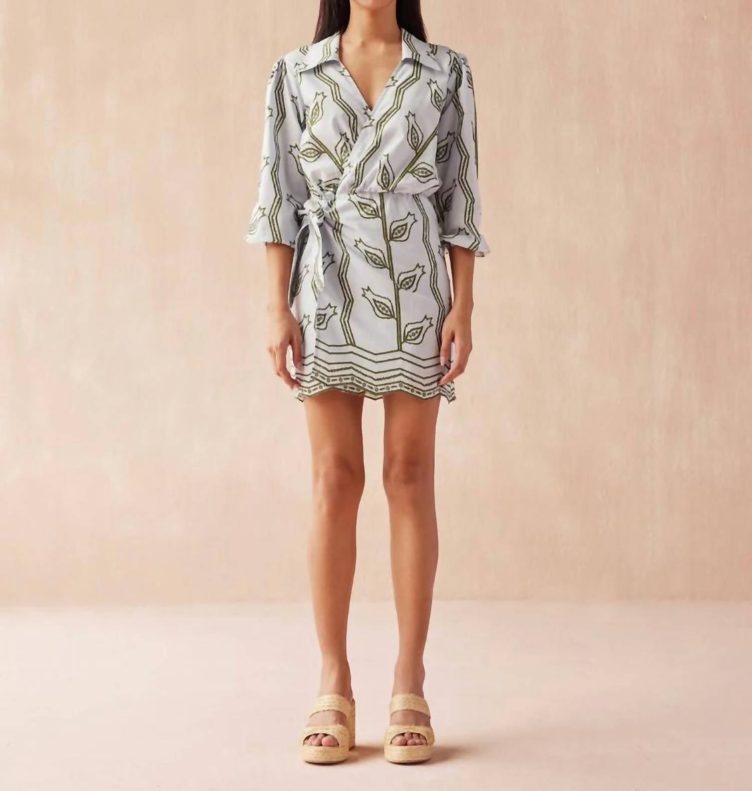 The kind of easy and flattering dress you'll be reaching for all season long. Unveil your style with the Avery Mini Dress by OMIKA in the delightful Vani Dew floral pattern. This dress boasts elbow-length sleeves with an elastic opening, a true wrap silhouette, and a snap at the front bodice for added neckline control. Made from 100% cotton, it features a structured shirt silhouette and a shaped hem detail, measuring 35.5" in length from size S. Closure is a pull-on style, with additional ties for security, and it offers effortless care with machine wash and line dry instructions.